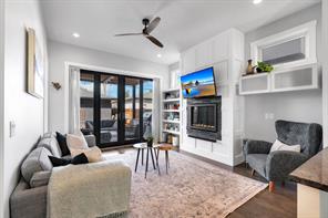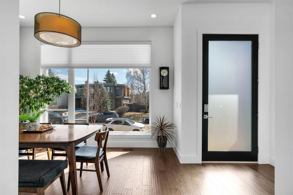 The main floor features a distinctive layout that balances bright, open-concept living with a private front dining room—perfect for hosting memorable dinners. Soaring 10-foot ceilings and expansive windows flood the space with natural light, while refined finishes elevate every corner. In the Kitchen you will find a stainless steel appliance package complete with built in oven & gas cooktop for your inner Chef. Shaker cabinetry with glass accents and a built in hood fan provide ample storage, and the central island with designer pendant lighting is the perfect gathering place for the home. A paneled fireplace with crisp shaker detailing anchors the living room, creating a warm and inviting atmosphere. Completing the main level is a functional mudroom with custom millwork and a private 2-piece powder room.