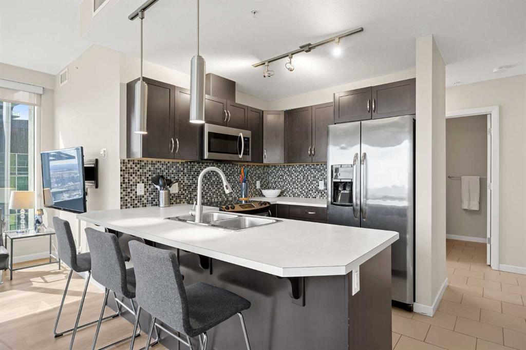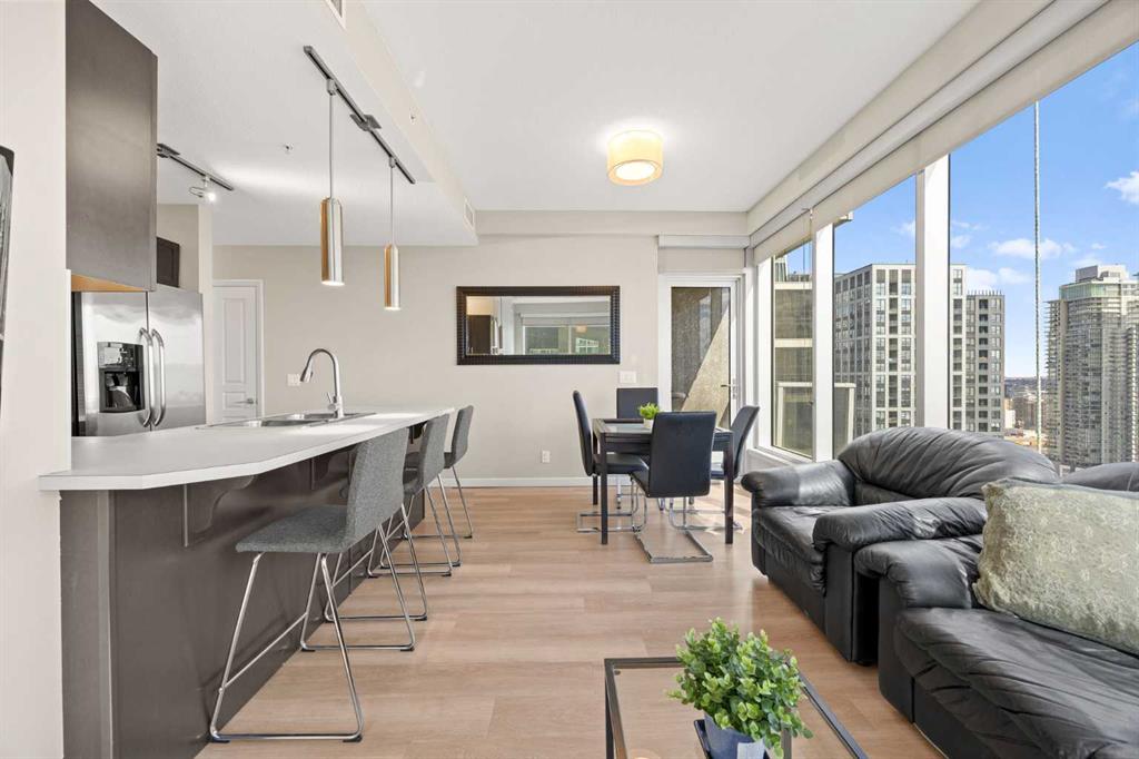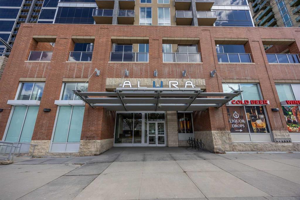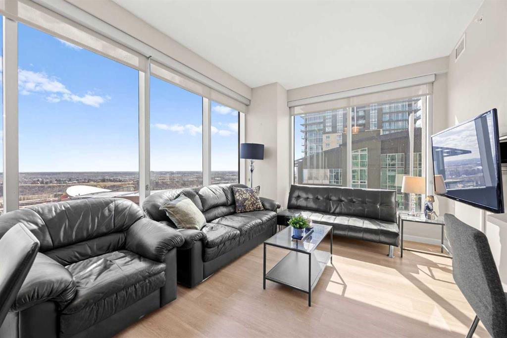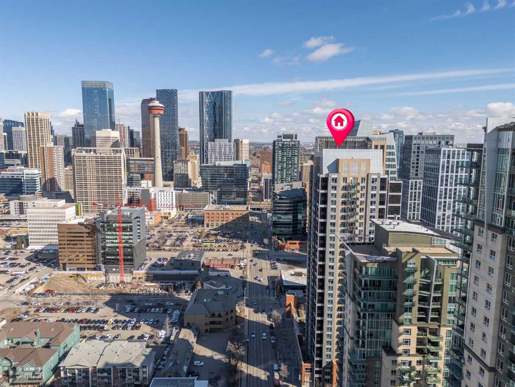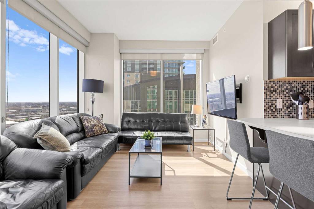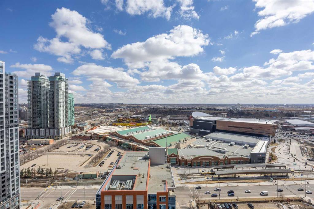 Welcome to the Alura! This bright CORNER UNIT is located on the 24tTH FLOOR and has panoramic views of the new Scotia Place, stampede grounds & the Rocky Mountains! . With an open floor plan boasting a full bank of windows to enjoy the views plus the living room which also has a patio door leading to your cover balcony and a well appointed kitchen this fully furnished home is move in ready and not to be missed. The kitchen has an extra large peninsula island with seating, tiled backsplash, white counters, stainless steel appliances and plenty of cabinets. There are 2 good sized bedrooms, which includes the primary with an ensuite and walk-in closet, the main bath, insuite laundry and a titled parking stall to complete this home. The Alura complex has much to offer from the 2 fitness centres, patio and garden areas and bike storage to the fact that it is just steps away from transit & LRT, parks, the stampede grounds, the many amenities of 17th Avenue and you can walk to work downtown! Don't miss out on this amazing opportunity!