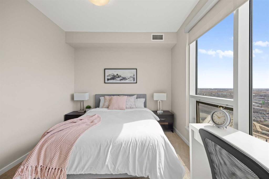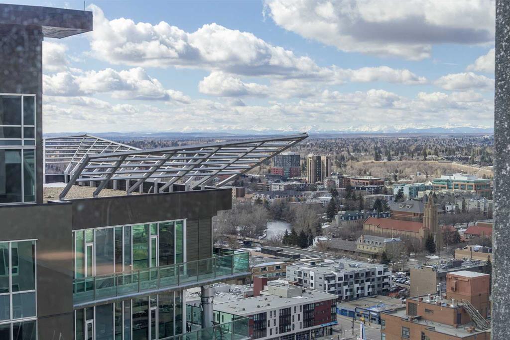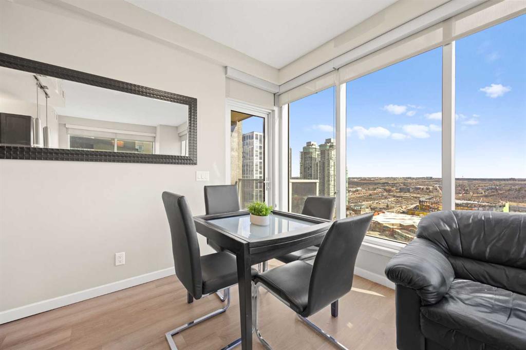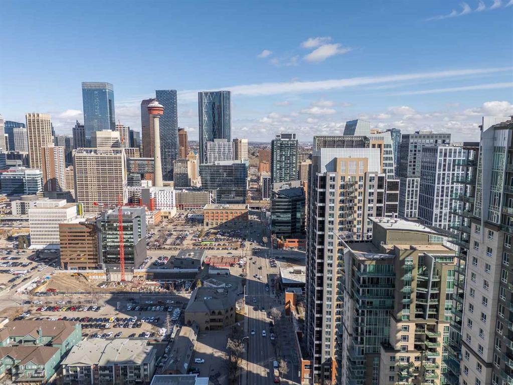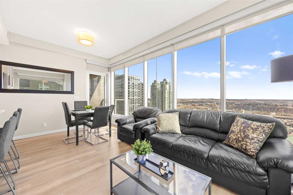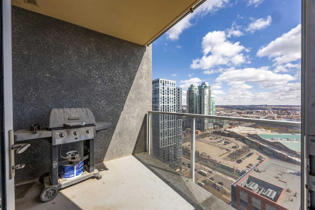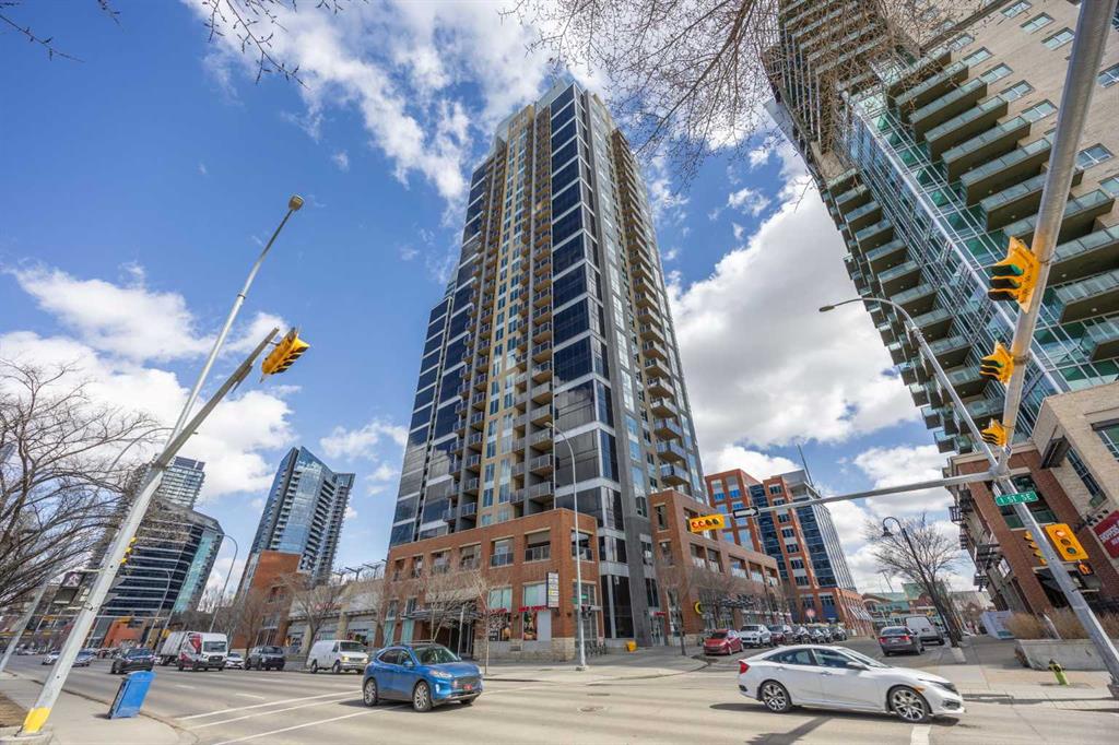 Welcome to the Alura! This bright CORNER UNIT is located on the 24tTH FLOOR and has panoramic views of the new Scotia Place, stampede grounds & the Rocky Mountains! . With an open floor plan boasting a full bank of windows to enjoy the views plus the living room which also has a patio door leading to your cover balcony and a well appointed kitchen this fully furnished home is move in ready and not to be missed. The kitchen has an extra large peninsula island with seating, tiled backsplash, white counters, stainless steel appliances and plenty of cabinets. There are 2 good sized bedrooms, which includes the primary with an ensuite and walk-in closet, the main bath, insuite laundry and a titled parking stall to complete this home. The Alura complex has much to offer from the 2 fitness centres, patio and garden areas and bike storage to the fact that it is just steps away from transit & LRT, parks, the stampede grounds, the many amenities of 17th Avenue and you can walk to work downtown! Don't miss out on this amazing opportunity!