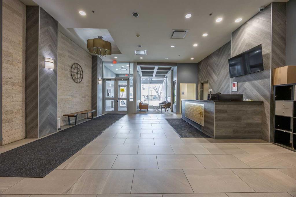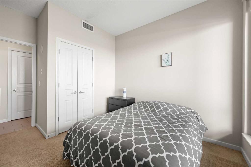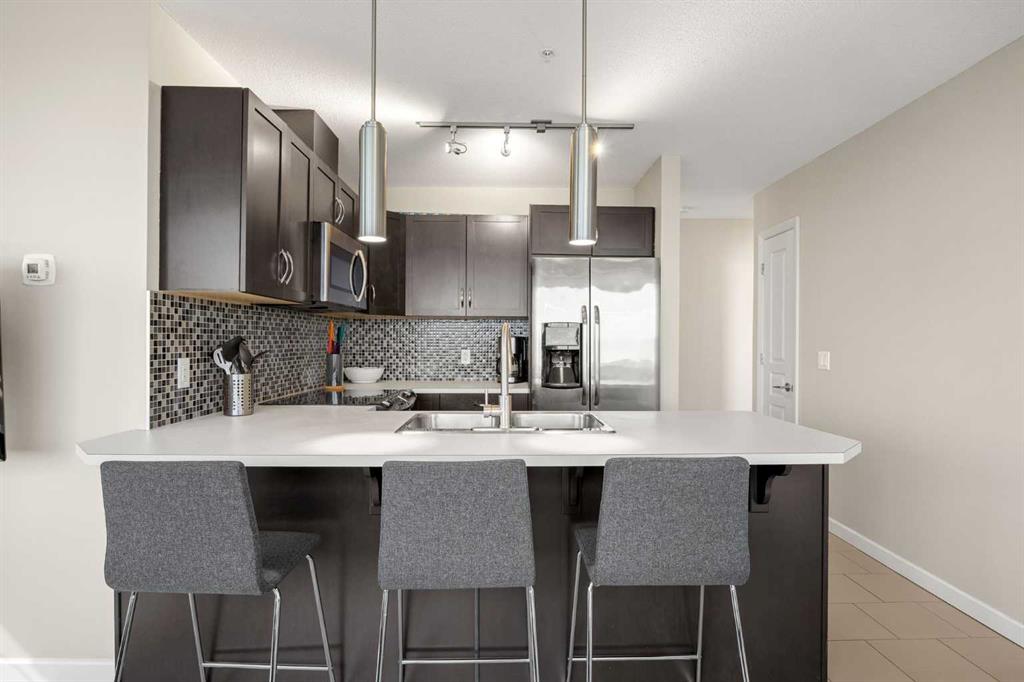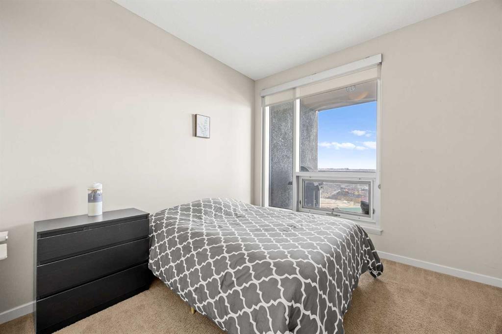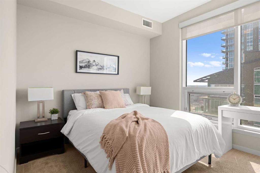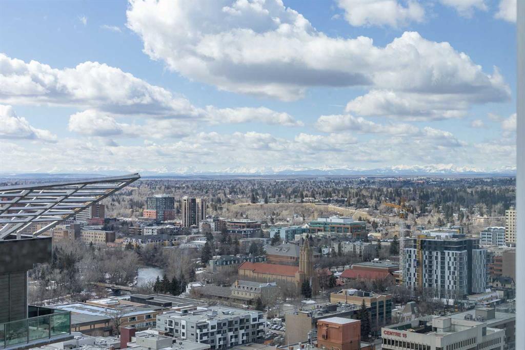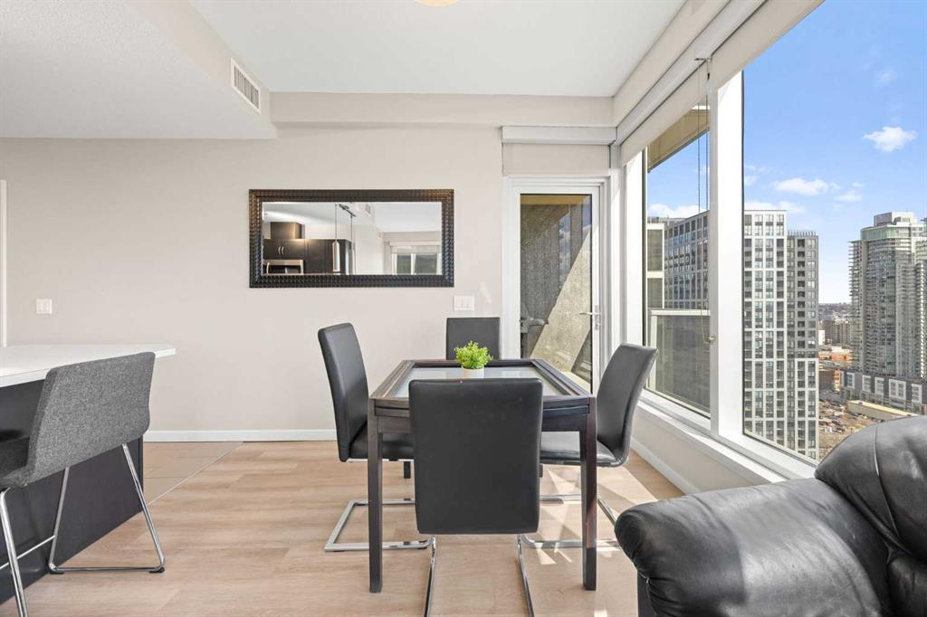 Welcome to the Alura! This bright CORNER UNIT is located on the 24tTH FLOOR and has panoramic views of the new Scotia Place, stampede grounds & the Rocky Mountains! . With an open floor plan boasting a full bank of windows to enjoy the views plus the living room which also has a patio door leading to your cover balcony and a well appointed kitchen this fully furnished home is move in ready and not to be missed. The kitchen has an extra large peninsula island with seating, tiled backsplash, white counters, stainless steel appliances and plenty of cabinets. There are 2 good sized bedrooms, which includes the primary with an ensuite and walk-in closet, the main bath, insuite laundry and a titled parking stall to complete this home. The Alura complex has much to offer from the 2 fitness centres, patio and garden areas and bike storage to the fact that it is just steps away from transit & LRT, parks, the stampede grounds, the many amenities of 17th Avenue and you can walk to work downtown! Don't miss out on this amazing opportunity!