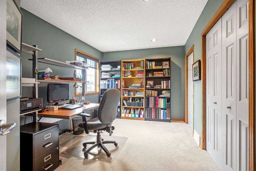 The adjoining living room invites you to unwind with its floor-to-ceiling tiled corner gas fireplace, built-in bookcases, and custom media cabinetry, while the front dining room offers an elegant space for family gatherings. A main floor office/den provides flexibility for work or study, and the thoughtfully designed mudroom ensures seamless organization from the oversized (23' x 23') double attached garage.