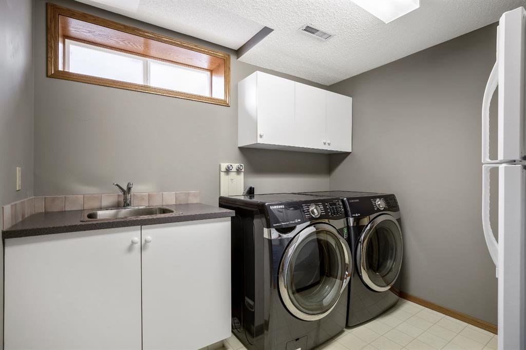 The fully finished walkout basement expands your living space with a fourth bedroom, full bath, and an inviting recreation area complete with wet bar and games space—ideal for entertaining or relaxing nights at home. A dedicated laundry room with built-in cabinetry and sink adds everyday convenience.