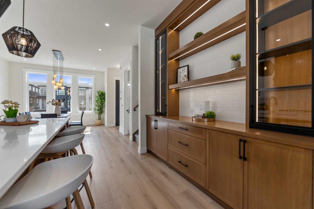 At the heart of the home lies a chef-inspired gourmet kitchen. This culinary space boasts custom soft-close cabinetry, a classic tile backsplash, and a premium stainless steel appliance package—complete with a gas cooktop, built-in wall oven, microwave, refrigerator, and dishwasher. An adjacent custom coffee and beverage bar adds an extra touch of luxury. A refined two-piece powder room and a functional mudroom with built-in bench seating and closet storage complete this level.