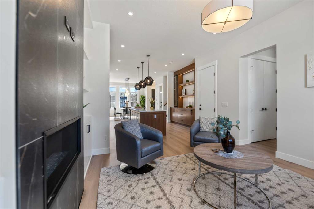Upon entering, you are greeted by an expansive open-concept layout accentuated by soaring 10-foot ceilings and large windows that bathe the space in natural light. Premium finishes abound, including wide-plank luxury vinyl plank (LVP) flooring, designer lighting, and intricate ceiling details. The floor plan flows effortlessly from the spacious dining area into a bright living room anchored by a gas fireplace and custom built-in bookshelves.