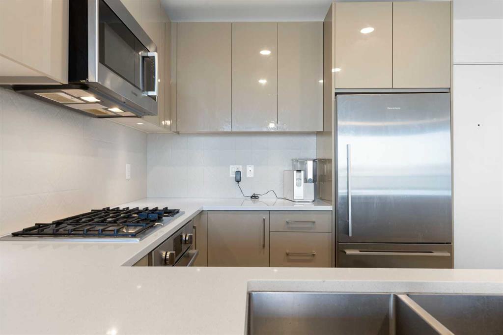Situated on the top floor, this impressive home features a bright, open concept layout with floor to ceiling windows that flood the space with natural light. The kitchen is thoughtfully designed with quartz countertops, stainless steel appliances, a gas cooktop, and an eat up breakfast bar, flowing seamlessly into the dining and living areas. Ideal for both entertaining and everyday living.