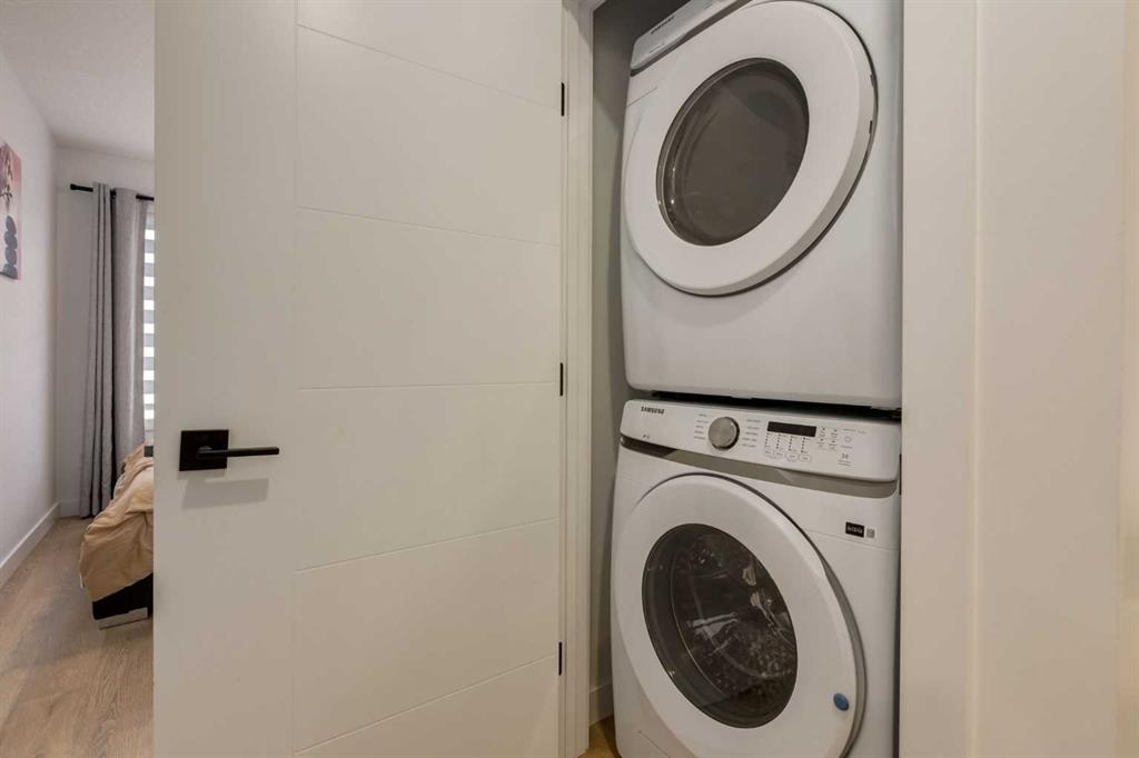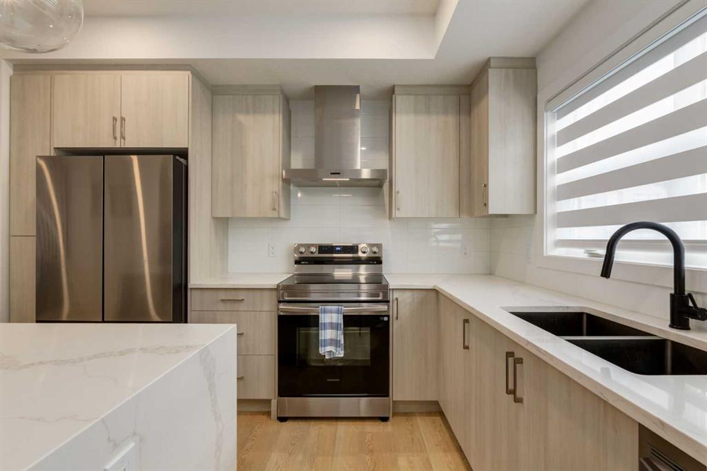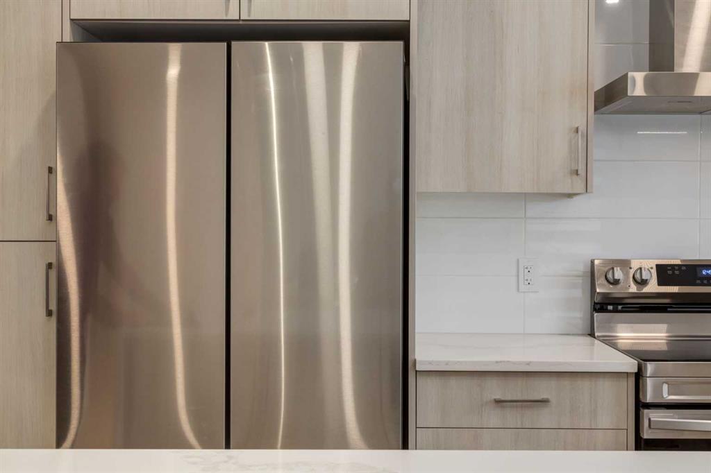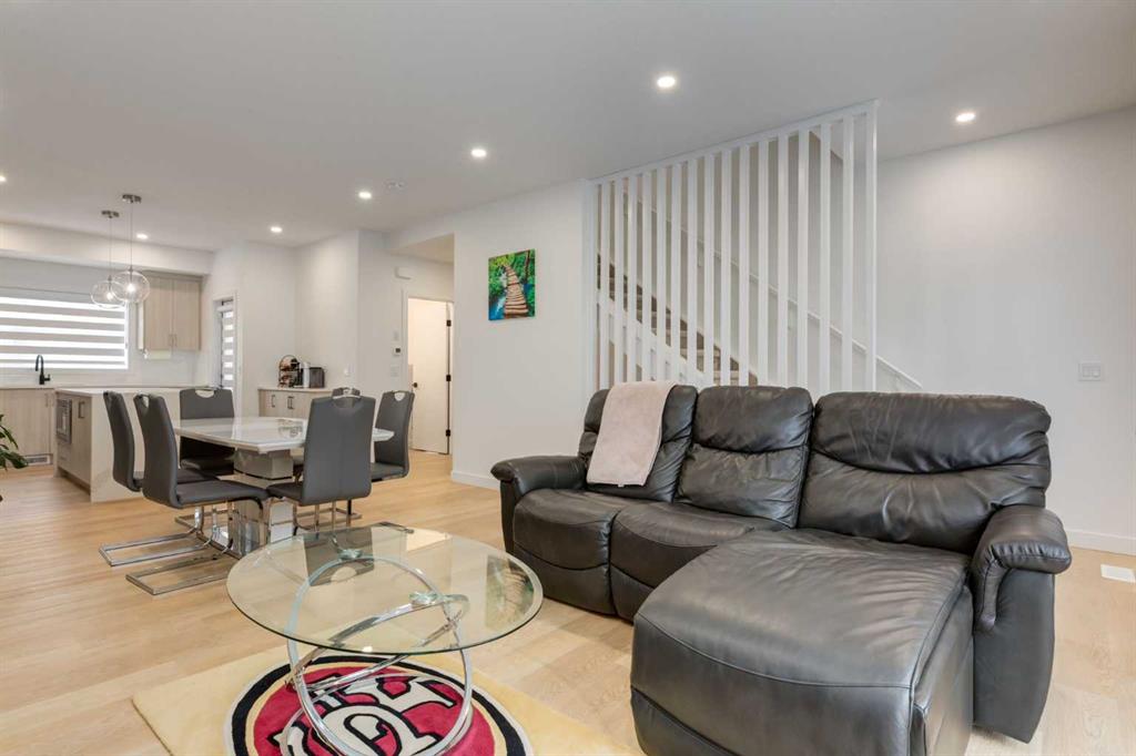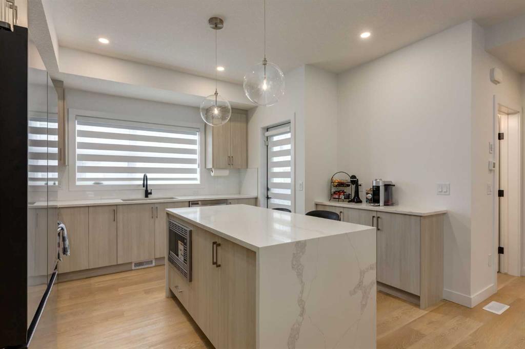Nestled in the desirable lake community of Mahogany, this 2024 built, three storey townhouse by Mountain Pacific Homes offers a seamless blend of modern design, high end finishes and functional living. Featuring 3 bedrooms, 2.5 bathrooms and a double side by side attached garage with driveway; this home is designed for both comfort and convenience. From the moment you arrive, the Hardie board siding and engineered exterior trim provide standout curb appeal and lasting durability. Inside, you’re welcomed by a spacious foyer and a versatile flex room; ideal for a home office, gym, or additional lounge space along with direct access to the garage. The open concept main floor showcases 9’ ceilings, luxury vinyl plank flooring and large windows that fill the home with natural light. The chef inspired kitchen features quartz countertops, a waterfall island, full height cabinetry with a dedicated coffee bar, soft close doors and drawers and a full stainless steel appliance package, including a French door refrigerator and smooth top range. A full height ceramic tile backsplash, pendant lighting and pot lights throughout add a polished, modern finish. The kitchen flows seamlessly into the dining and living areas, perfect for entertaining. Upstairs, you’ll find laundry, a full four piece bathroom and three spacious bedrooms; one being the primary retreat with walk-in closet and four piece ensuite. Both upper level bathrooms continue the upscale feel with quartz countertops, tiled flooring, extra cabinetry and full height tile surrounds in the tub and shower. Additional highlights include automated blinds throughout and a private balcony with a BBQ gas line, ideal for relaxing or hosting guests. Located in the award winning lake community of Mahogany, you’ll enjoy close proximity to Mahogany Lake, along with schools, parks, pathways, shops, and trendy restaurants; offering a vibrant, walkable lifestyle.. Truly a must see, book your showing today!