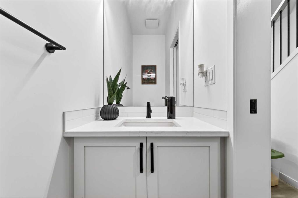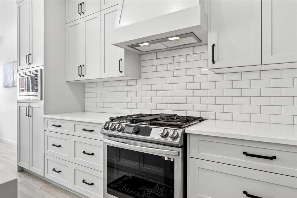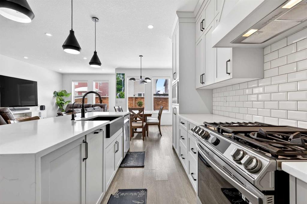 Step inside to a thoughtfully designed main floor featuring a signature kitchen package complete with a gas stove, stunning waterfall island, floating shelves, and sleek upgraded finishes throughout. The modern aesthetic is elevated with black lighting fixtures and contemporary touches that make this home truly stand out.