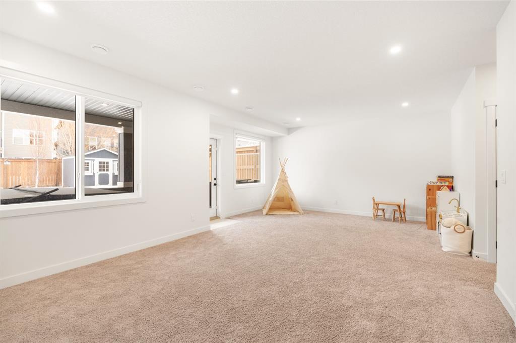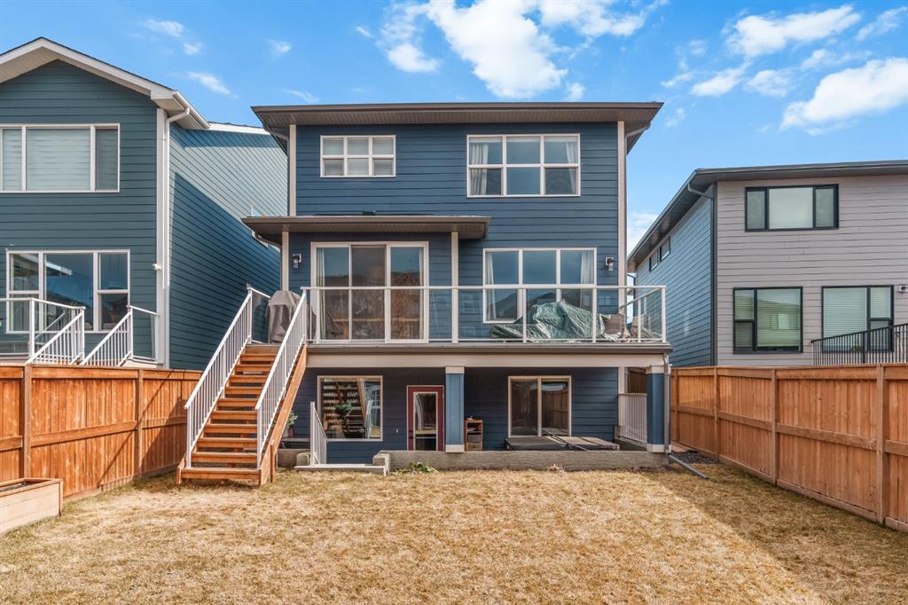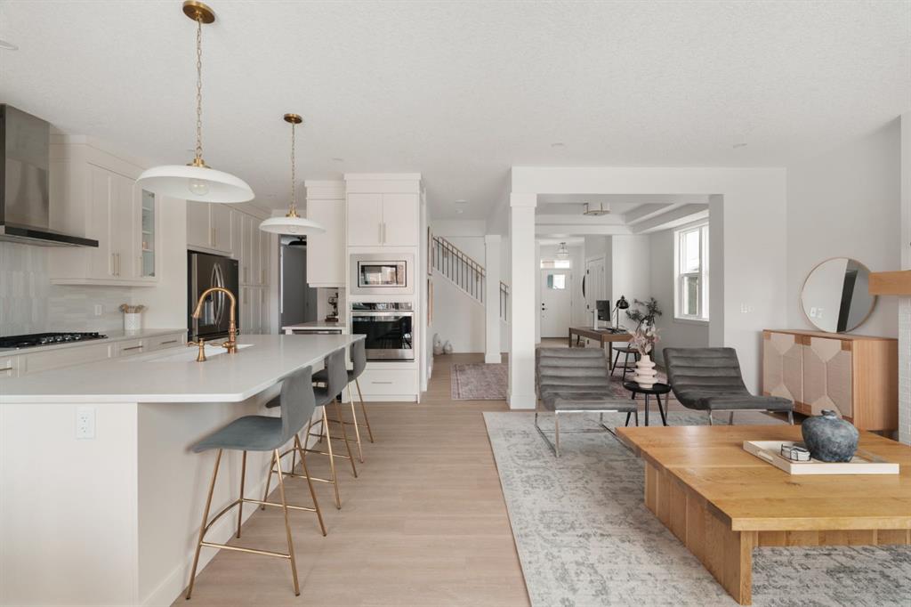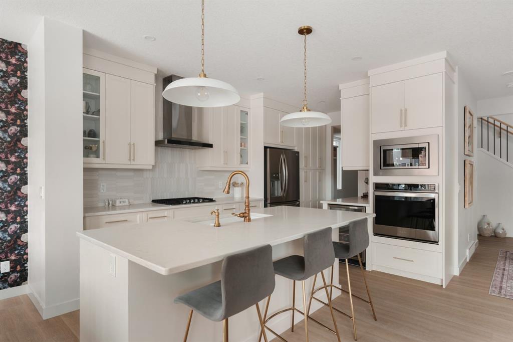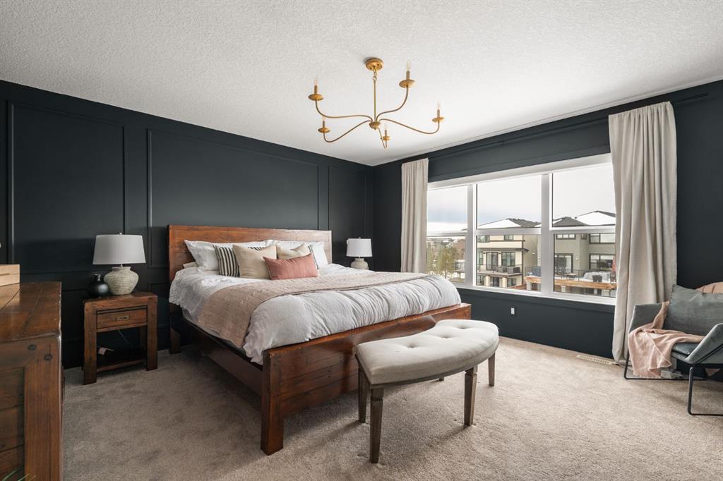 Welcome to this stunning, fully finished walkout home in the highly sought-after community of Cranston’s Riverstone, offering over 3,450 sq ft of thoughtfully designed living space and exceptional upgrades throughout. From the moment you step inside, you’re greeted by a spacious front entrance and a striking open-to-below staircase that sets the tone for this elegant home. Luxury vinyl plank flooring flows through the main floor, featuring a versatile formal dining room with a sophisticated double tray ceiling—perfect for entertaining or easily used as a home office or flex space. Large windows flood the entire main level with natural light, creating a bright and inviting atmosphere. The heart of the home is the open-concept living area, highlighted by a beautiful gas fireplace with white brick surround and classic mantel. The adjacent dining area flows seamlessly into the chef-inspired kitchen, complete with a large central island, extended-height cabinetry, quartz countertops and upgraded stainless steel appliances including a gas cooktop, range hood, wall oven, and built-in microwave. A bar fridge and dedicated coffee bar nook add both function and luxury, while ample cabinetry provides exceptional pantry storage. A well-designed mudroom with built-ins and a stylish designer half bath complete the main floor. Custom lighting throughout the home adds a modern, elevated touch. Upstairs, the elegant open spindle and oak staircase leads to a spacious bonus room perfect for family movie nights. The upper level laundry room is both practical and stylish, featuring designer tile flooring and abundant linen storage. Two generously sized bedrooms are situated at the front of the home and share a well appointed 4-piece bathroom. The primary retreat is a true sanctuary, featuring a moody, sophisticated ambiance accented by a statement chandelier. The luxurious 5-piece ensuite includes dual sinks, a soaker tub, makeup vanity and an oversized fully tiled shower, along with a massive walk-in closet. The professionally finished walkout basement, completed by the builder, offers incredible additional living space with a large open recreation area, a fourth bedroom, a full 4-piece bathroom, as well as extensive storage. Step outside to enjoy the beautifully designed outdoor spaces. The upper fun span deck features durable finishes and sleek glass railing, with stairs leading to the lower level. The private patio below is already equipped with hookups and drainage for a future hot tub. The large northwest-facing backyard provides plenty of afternoon sun and includes a charming storage shed. This home also comes equipped with air conditioning and a water softener. Ideally located, this home offers views of Cranbrook Pond and the Bow River and is just steps from a playground, surrounded by scenic walking paths and natural reserve areas. With easy access to Deerfoot Trail, as well as nearby schools and shopping, this location perfectly balances convenience and nature.
