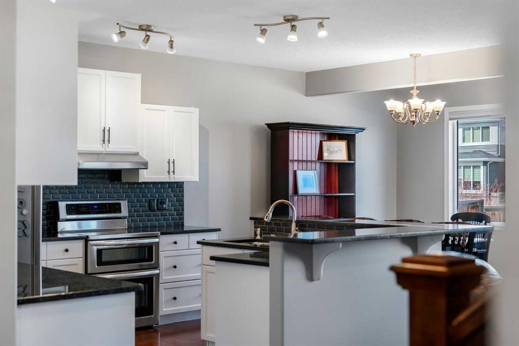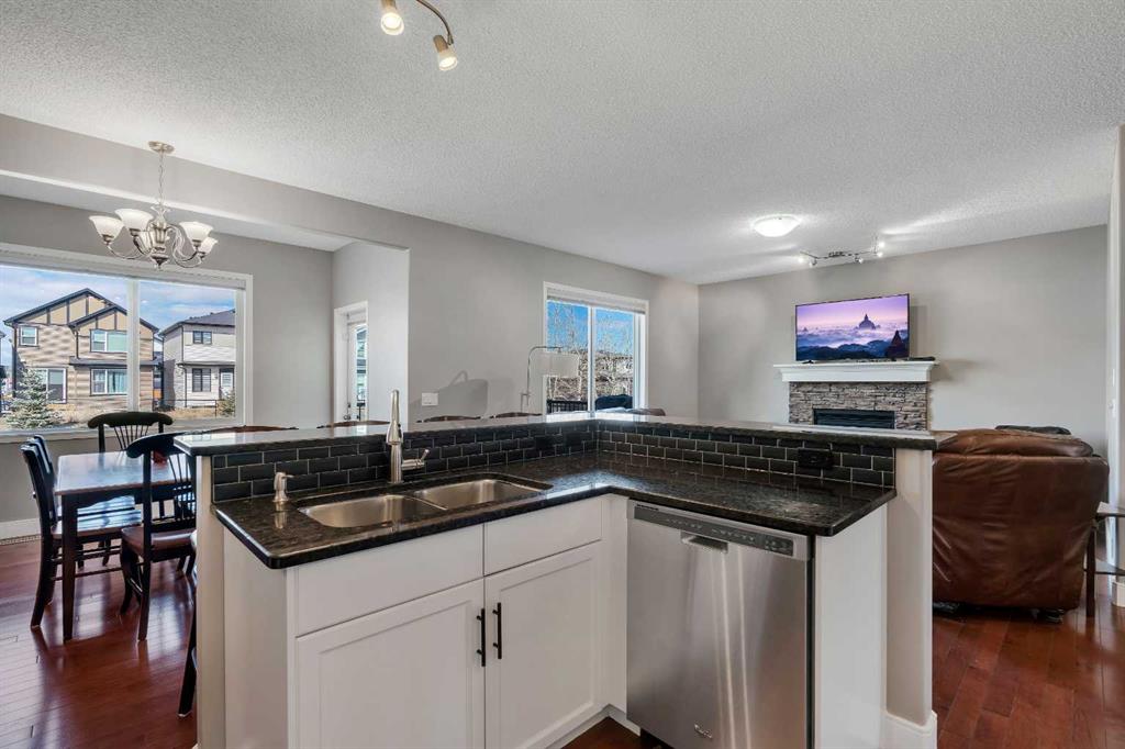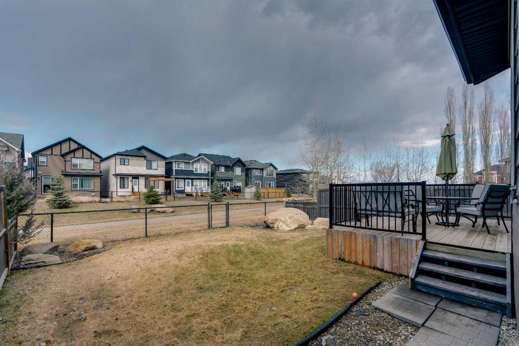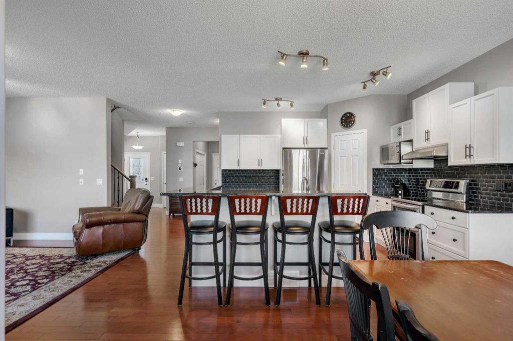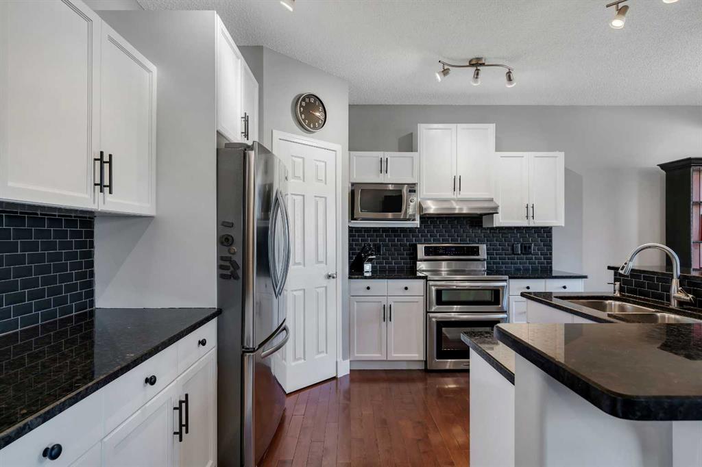 Welcome to 18 Silverado Skies Drive SW. Backing directly onto a green space and a walking path with, this fully updated Silverado home offers over 2,300 sq ft of developed living space with 4 bedrooms, a main floor office, and 3.5 bathrooms. The main floor is built for both everyday living and entertaining, featuring an open-concept layout with durable hardwood flooring throughout and a cozy gas fireplace anchoring the living room. The kitchen has been tastefully refreshed with crisp white cabinetry, modern black hardware, granite countertops, a central island with eating bar, corner pantry, and stainless steel appliances including a dual oven. A dedicated main floor office and laundry add function without sacrificing space. Upstairs, the vaulted bonus room creates an impressive second living area filled with natural light. The primary suite is spacious and well-designed, featuring a walk-in closet with added custom shelving and a 5-piece ensuite complete with dual sinks, a corner soaker tub, separate shower, and a private water closet. Two additional bedrooms and a full 4-piece bath and laundry room complete the upper level that has recently upgraded luxury vinyl plank flooring throughout. The fully developed basement (2020) expands your living space with a dry bar, electric fireplace, custom built-ins, a large bedroom with legal egress window, and a smart pass-through bathroom with heated floors. This home has seen major exterior and mechanical upgrades, including Hardie siding (2021), all new windows, and a hot water tank (2020). Out back, enjoy an expanded deck overlooking uninterrupted green space and direct access to walking paths. Finished with a double attached garage and located close to schools, parks, and shopping.