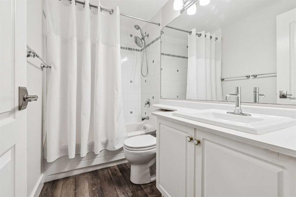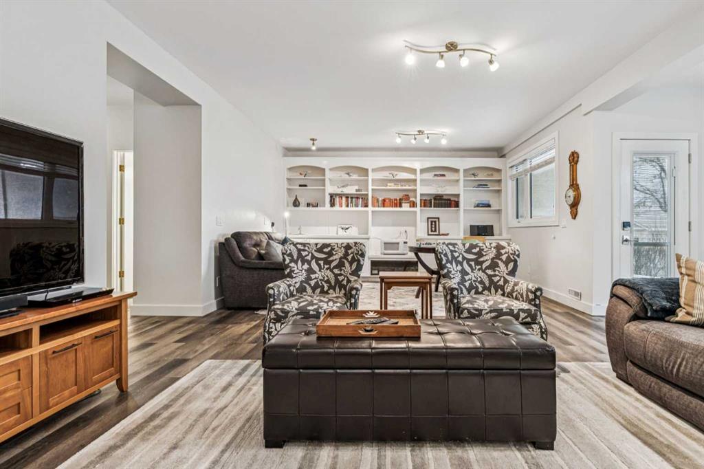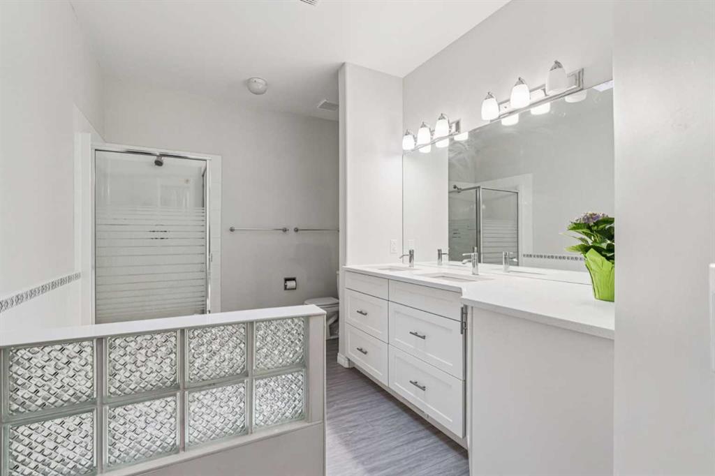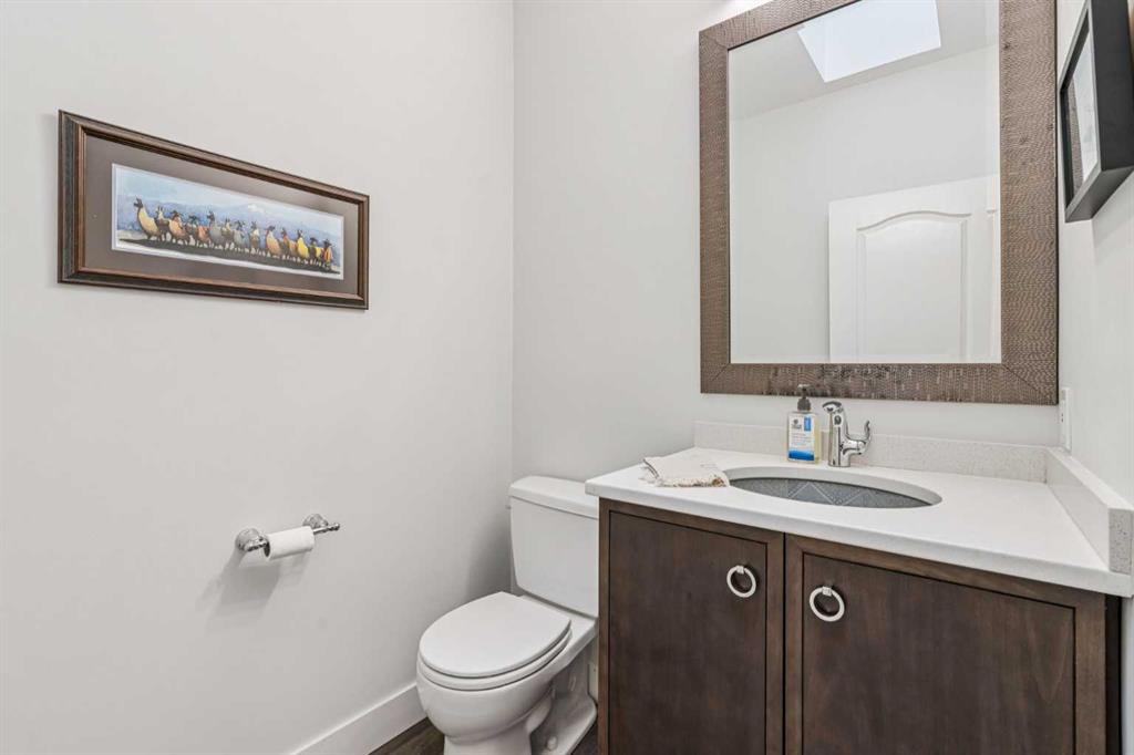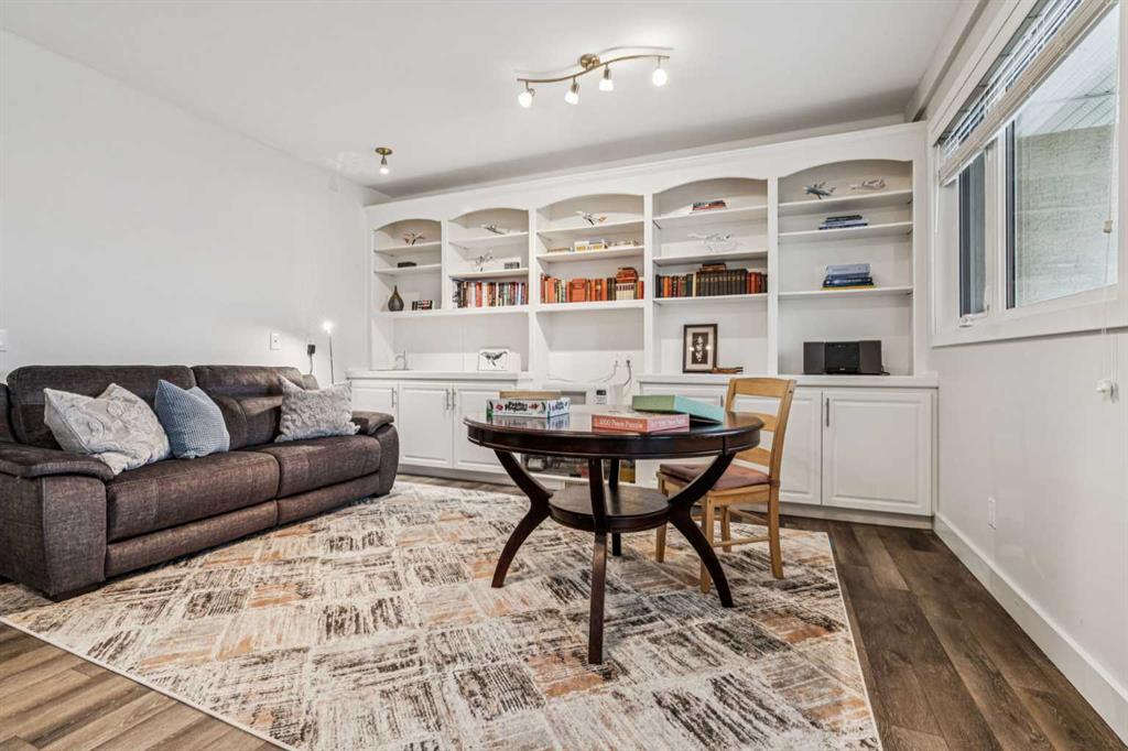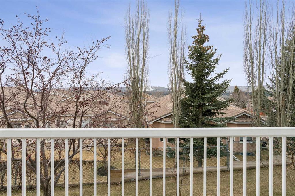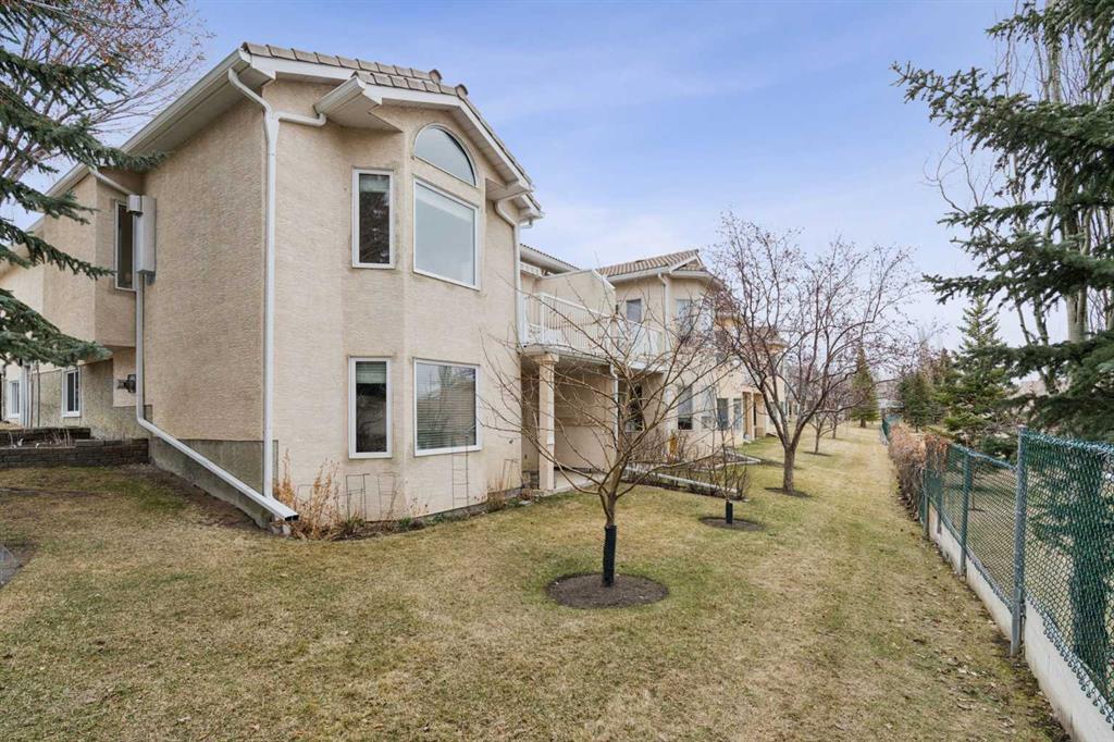 This walkout bungalow sits on a large corner lot in Westchester Pointe Gardens, with views of Canada Olympic Park and mature trees surrounding the property for privacy and shade through the summer. The main floor has 9 foot ceilings with Divine Flooring white oak hardwood running across the level and down the stairs. A newer skylight brightens the foyer, and just off it is an office or den with French doors. The kitchen was fully gutted in 2016 with quartz countertops, full-length upper cabinetry, tile backsplash, an island open to the dining area, and new appliances. The dining area flows into the living room, both sitting under a cathedral ceiling anchored by a large arched window, with a new gas fireplace, south-facing exposure, and a walkout to a deck with an awning and a door with embedded blinds. The primary bedroom has a walk-in closet with pocket door and built-in organizers, and the ensuite has been updated with granite counters, a newer vanity, Moen fixtures, and newer flooring. A powder room with a custom cabinet and decorator sink and a laundry room sit off the garage entry. A glass panel stair railing with painted oak leads down to the walkout lower level. The large rec room has a gas fireplace with updated hearth and tile, built-in bookshelves, and opens to a covered patio. Two good-sized bedrooms sit off the hall along with a four-piece bathroom. Both bedroom windows were structurally enlarged for significantly more natural light. The hall and rec room have vinyl plank flooring and the bedrooms have newer carpet. The big-ticket items have all been handled. PolyB plumbing replaced with PEX on a home run manifold, triple pane windows throughout (2022), high efficiency furnace (2016), newer hot water tank (2024), and an electrically heated double garage with a newer opener. All toilets have been replaced and most light fixtures updated. Additional features include a clay tile roof, upgraded 6 inch gutters, water softener, and central vacuum. Westchester Pointe is a well-managed bare land condo with professional landscaping and snow removal. Walking distance to green space and pathways along the Bow River, five minutes to Canada Olympic Park, and quick access to Crowfoot Crossing, the LRT, Stoney Trail, and Highway 1 to the mountains.