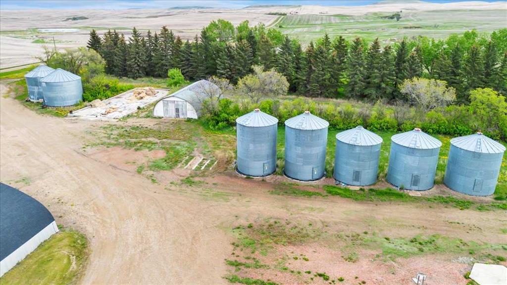 In addition to the charming cabin, the property includes two large Quonset huts (previously used for combines) and a heated double garage, providing ample space for equipment, recreational vehicles, or workshop use. Approximately 12 acres are farmable, with grain bins already in place that can generate modest supplemental income.