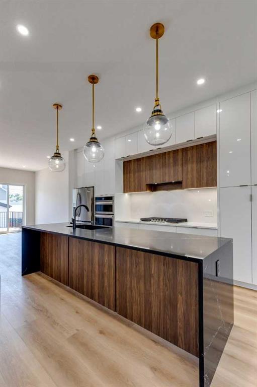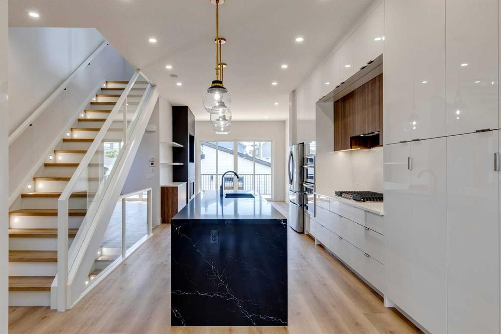 Mazon Designs proudly presents “The Richmond,” a custom-built home situated on a premium south-facing lot in the heart of the highly sought-after Richmond/Knobhill community. Showcasing over 2,300 sq. ft. of thoughtfully designed luxury living space, this exceptional residence spans three fully finished levels, each appointed with high-end upgrades and meticulous attention to detail. The open-concept main floor impresses with soaring 10’ ceilings and 8’ interior doors, creating a bright and expansive atmosphere. A full-sized dining area seamlessly connects to the chef-inspired kitchen, highlighted by a stunning 10’ island with seating for six, floor-to-ceiling custom cabinetry, quartz countertops, a gas range, and premium plumbing and lighting fixtures. The adjoining great room features a striking porcelain tile fireplace with custom media cabinetry, while a wall of glass opens onto an oversized, south-facing deck, complete with gas BBQ hookup—perfect for indoor-outdoor living. A conveniently located powder room and a private mudroom with direct access to the yard and garage complete this level. Upstairs, a beautifully designed staircase with glass railings and in-step lighting leads to a bright second floor with 9’ ceilings. This level offers a full laundry room, a stylish 3-piece bath, and two generously sized bedrooms, each with walk-in closets. The luxurious primary suite is a true retreat, featuring a dramatic multi-vaulted ceiling and a spa-inspired ensuite that must be seen to be fully appreciated. The fully developed lower level maintains the same standard of quality, offering 9’ ceilings, in-floor heating, a spacious bedroom (ideal for guests, a home office, or gym), and a 3-piece bath. The expansive family room includes additional cabinetry, a sink, and a beverage fridge—perfect for a home theatre or children’s play area. Additional highlights include a double detached garage with convenient lane access, fully drywalled, insulated, and pre-wired for an EV. Notable upgrades include glued and screwed flooring (no nails), a 70-gallon hot water tank, water softener, R-40 spray insulation in cantilevers, waterproofed basement walls with protective membrane, reinforced basement slab with additional rebar, sump pump, and a dedicated water line for a future hot tub. The property is fully landscaped front and back. Carefully designed and built around two mature 70-year-old trees, the home offers both natural beauty and enhanced curb appeal. Ideally located just steps from a park, within walking distance to the shops and restaurants of 17th Avenue, and only minutes to downtown. Move in at your convenience—possession is flexible. This home offers exceptional value, priced below replacement cost, and includes GST, a new home warranty, and a one-year builder’s door-to-door warranty. Unmatched quality! Unbeatable value!