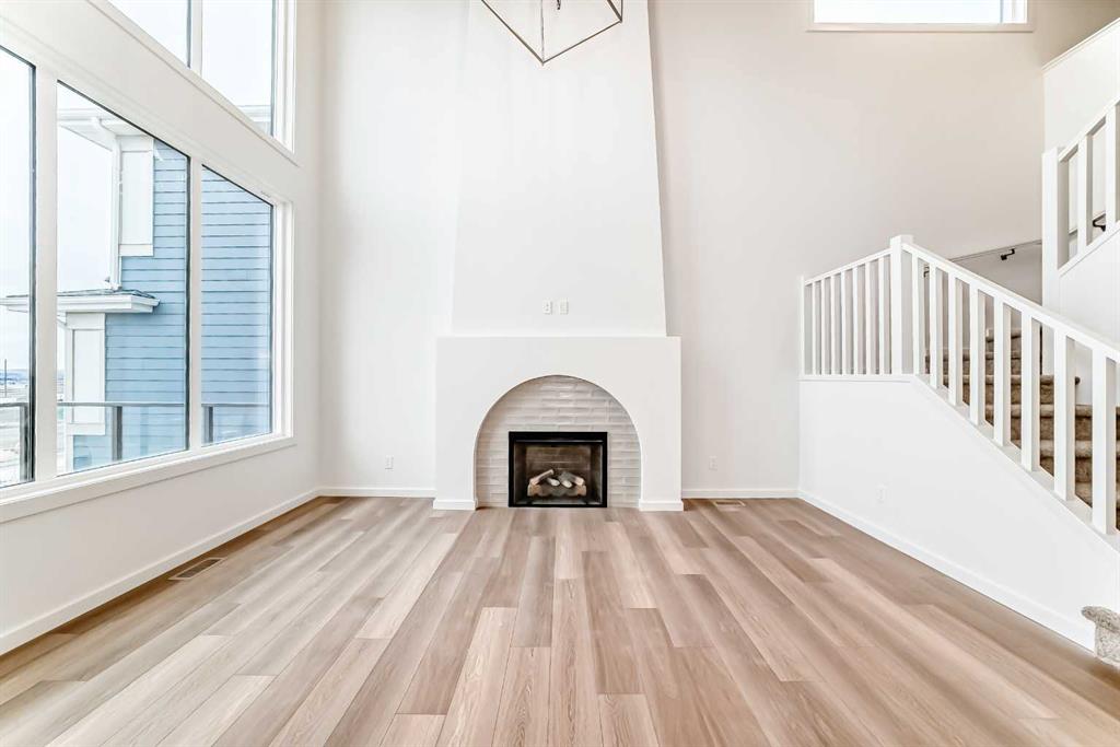 Then you walk in—and it opens up. TWO-STOREY HEIGHT. A full wall that climbs with windows set high, pulling in light and sky. And right there, ANCHORING IT ALL, IS THE FIREPLACE—soft, slightly old-world in the way it tapers up, with an arched detail and tile inset. It doesn’t compete with the room—it gives it a focal point.