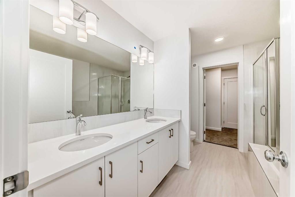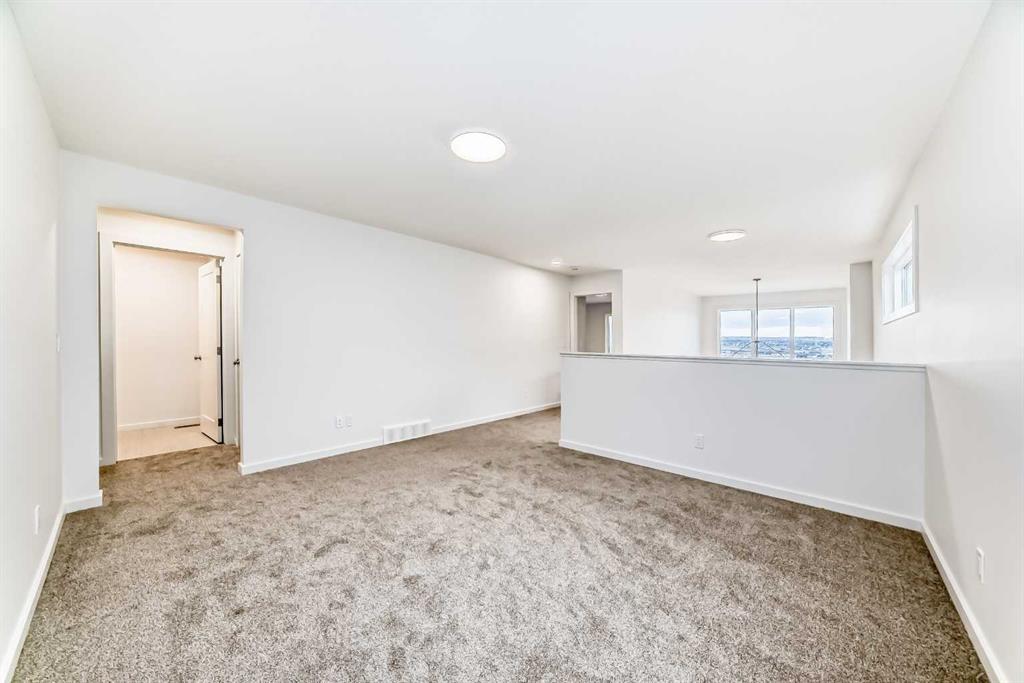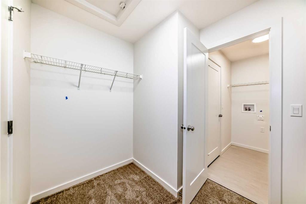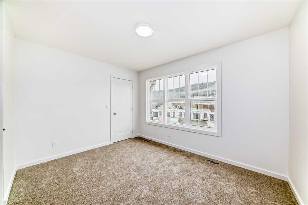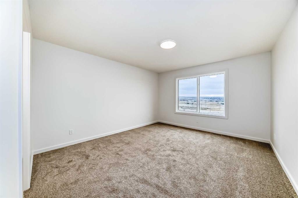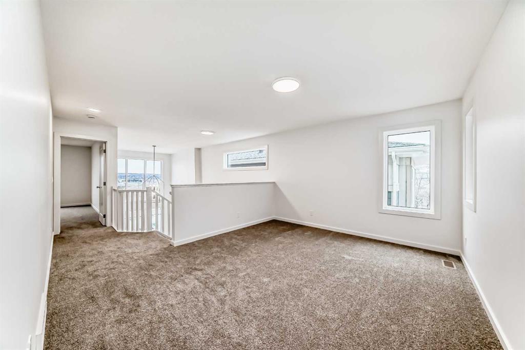 Upstairs, the BONUS ROOM lands right in the middle—and it’s not closed off. It looks down into the great room below and borrows all that natural light from the two-storey window wall. The primary bedroom is set apart, with a five-piece ensuite—SOAKER TUB, TILE SHOWER WITH A BENCH, dual sink vanity—and a walk-in closet that connects directly to the laundry room. No hauling baskets into the hallway. Secondary bedrooms? They each get their own walk-in closets.
