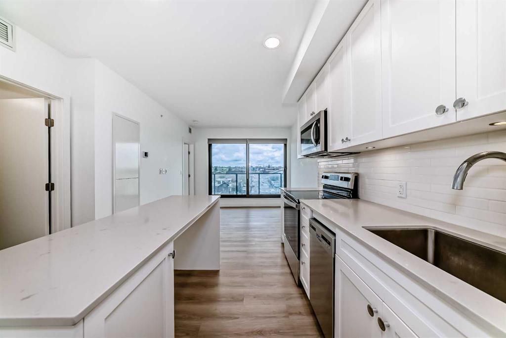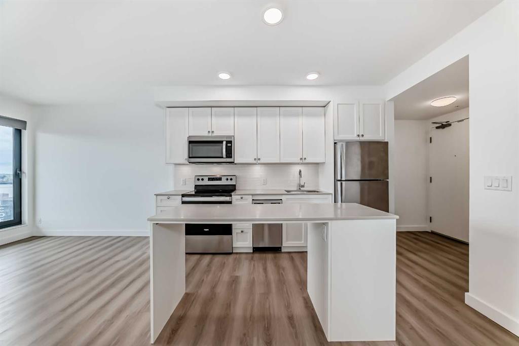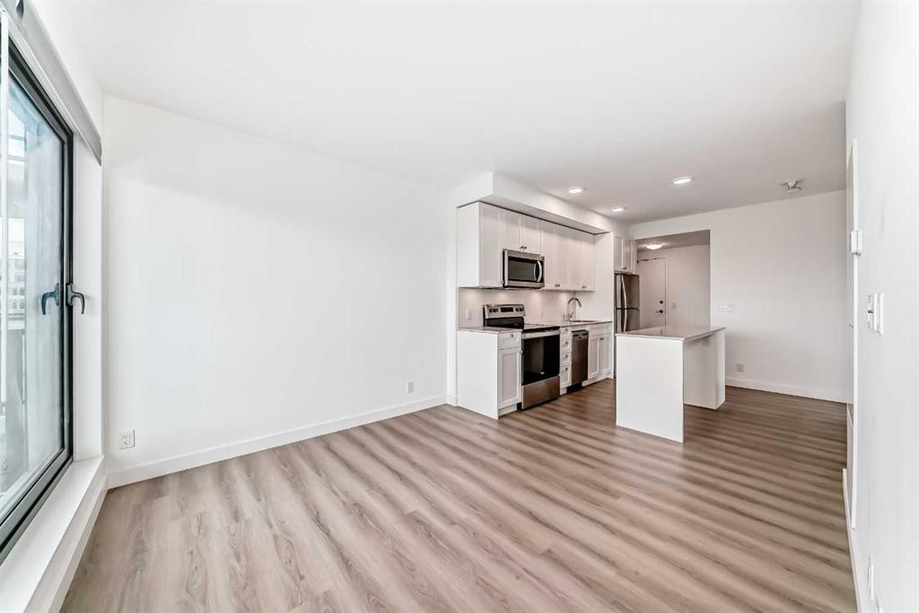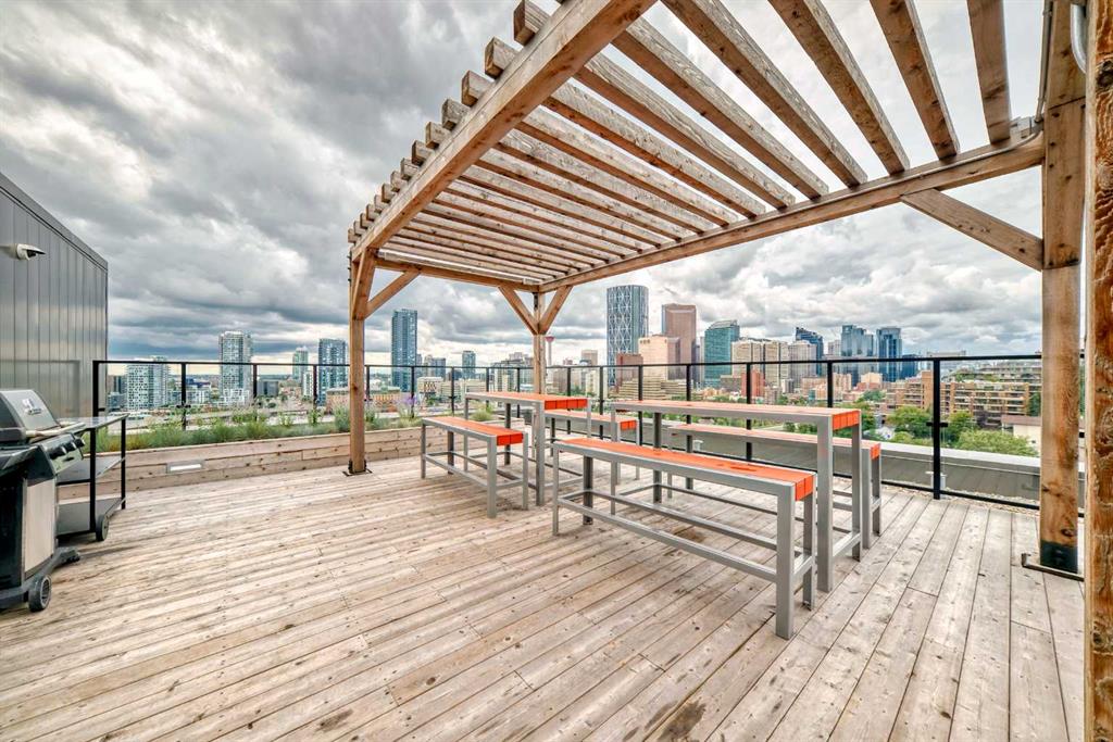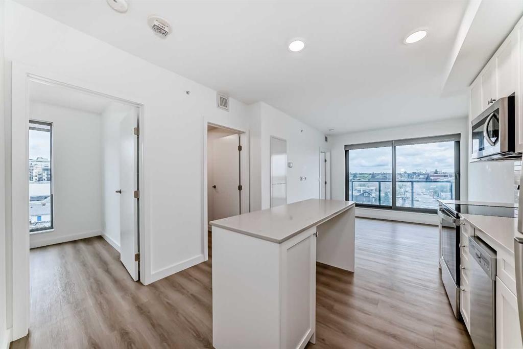 CORNER UNIT 12TH FLOOR. GREAT VIEW! Welcome to Era by Minto Communities—modern, elevated living in this well-designed 2 bedroom, 1 bathroom unit in the heart of Bridgeland. Perched on the 12th floor, this home offers unobstructed views and abundant natural light, all within one of Calgary’s most walkable neighborhoods (Walk Score of 98). You’re just steps from Bridgeland Market, Shiki Menya, Luke’s, local cafés, parks, playgrounds, and the Bow River pathway system. The Bridgeland/Memorial LRT station is nearby for quick access to downtown and the East Village. Inside, the open-concept layout seamlessly connects the kitchen and living area to a private balcony—perfect for morning coffee or evening relaxation with a view. The kitchen features a large eat-in island, quartz countertops, stainless steel appliances, and full-height cabinetry. Durable vinyl plank flooring, air conditioning, in-suite laundry, a titled underground parking stall, and a titled storage locker add everyday comfort and convenience. Built to LEED Gold standards, Era emphasizes energy efficiency and smart living, offering features like video entry, facial recognition access, secure package lockers, community messaging, and virtual concierge services. Residents also enjoy a rooftop patio with firepits and BBQs, offering stunning downtown views, along with an indoor lounge and workspace for year-round use. This well-appointed unit in a professionally managed building is an excellent opportunity to own in one of Calgary’s most desirable inner-city communities. Book your showing today. Photos are from a similar unit with an identical floorplan and may not reflect the exact finishes or views of Unit 1202.