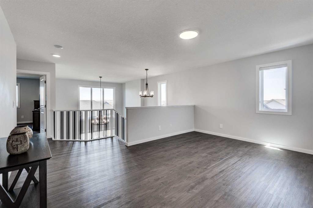 Upstairs, a central bonus room overlooks the great room below, enhancing the home’s open, airy feel while maintaining a strong visual connection between levels. On the second floor there are two additional bedrooms, along with a truly impressive primary retreat. Enjoy city and prairie views, a luxurious 5 piece ensuite complete with a soaker tub, and a spacious walk-in closet designed for both comfort and style. An upper level laundry room adds an extra layer of convenience.