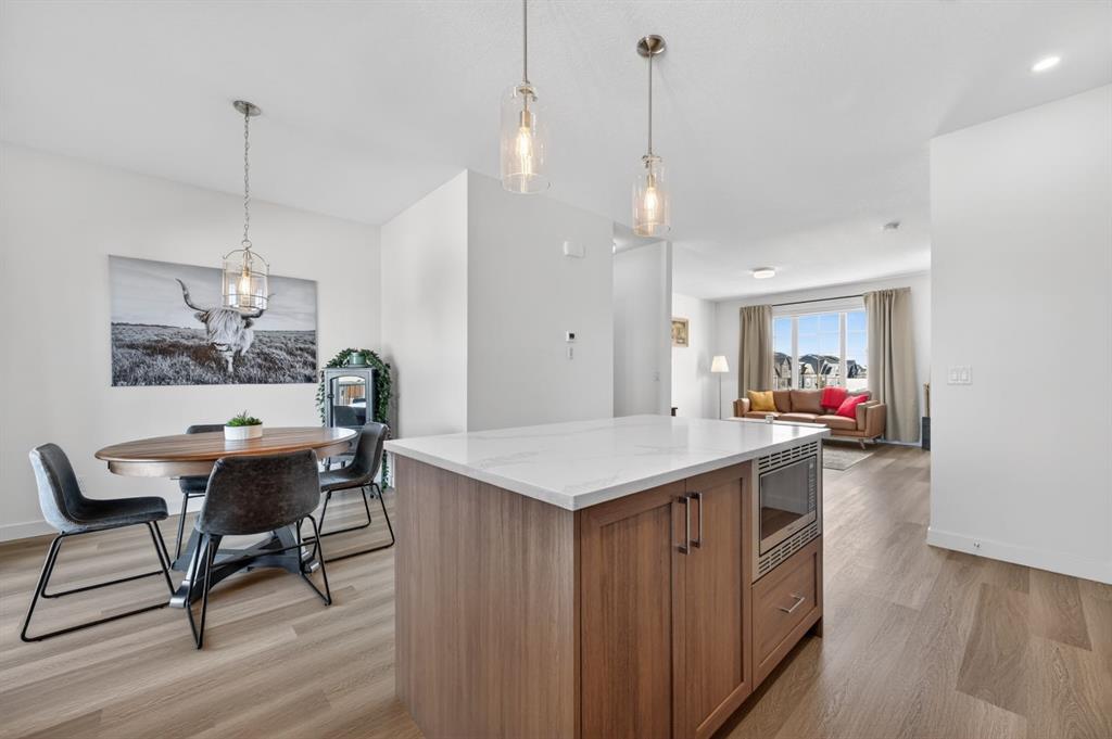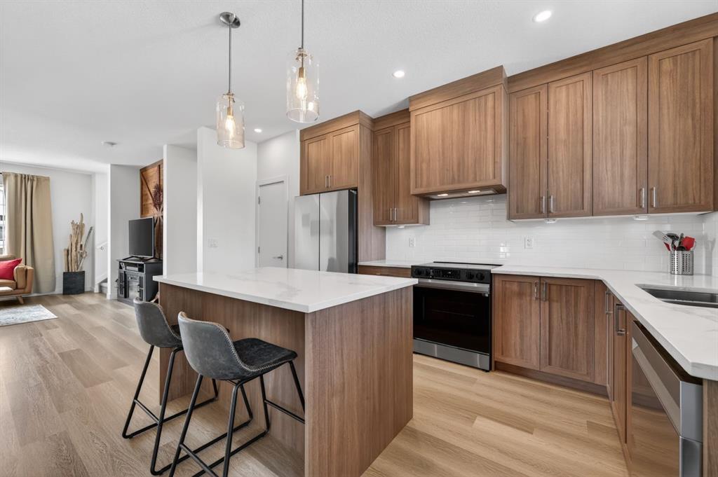 Welcome to this BILD Calgary award-winning, END UNIT 3-storey Village Townhome in the highly sought-after Vesta Elevate Collection, nestled in Cooper’s Crossing—Airdrie’s multi-time “Best Community” award winner. Showcasing state-of-the-art modern living with a touch of classic architectural charm, this practically new home offers the perfect blend of style, functionality, and location. Thoughtfully designed, the home features 3 bedrooms, 2.5 bathrooms, and a versatile ground-floor flex room—ideal for a home office, gym, or additional living space. The bright and spacious open-concept main floor boasts 9-foot ceilings and is perfectly suited for both everyday living and entertaining. At the heart of the home is an elegant gourmet kitchen, featuring full-height cabinetry with soft-close drawers and doors, upgraded stainless steel appliances (with extended warranty), sparkling quartz countertops, a pantry and a generous center island. The kitchen flows seamlessly into the dining and living areas, with access to a massive covered balcony with natural gas hookup, while a convenient powder room completes the main level.