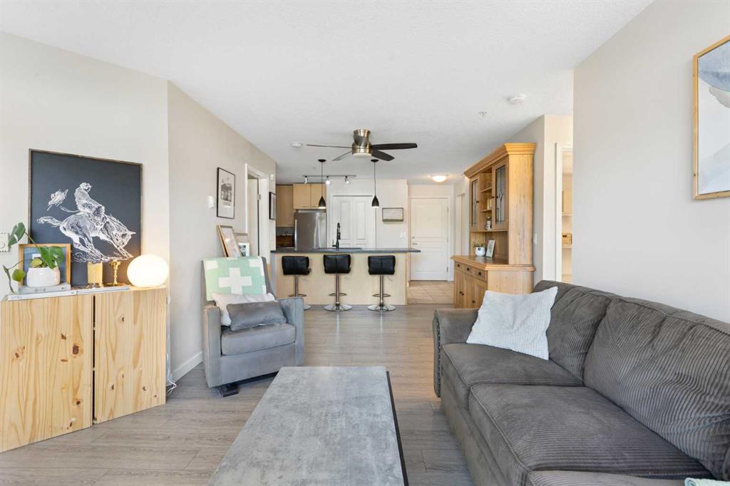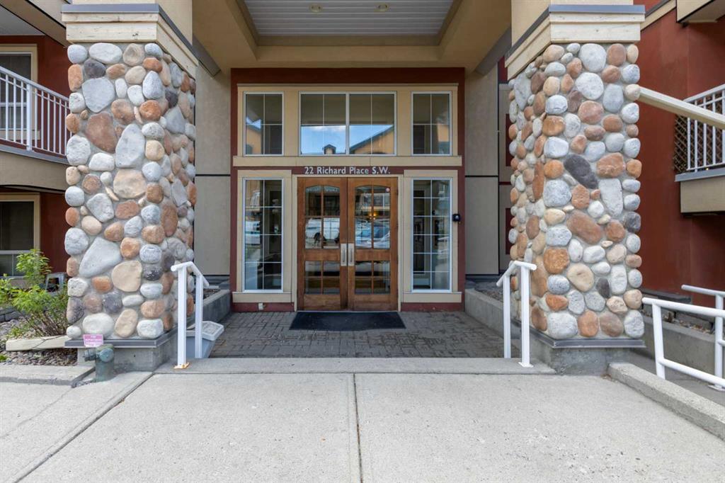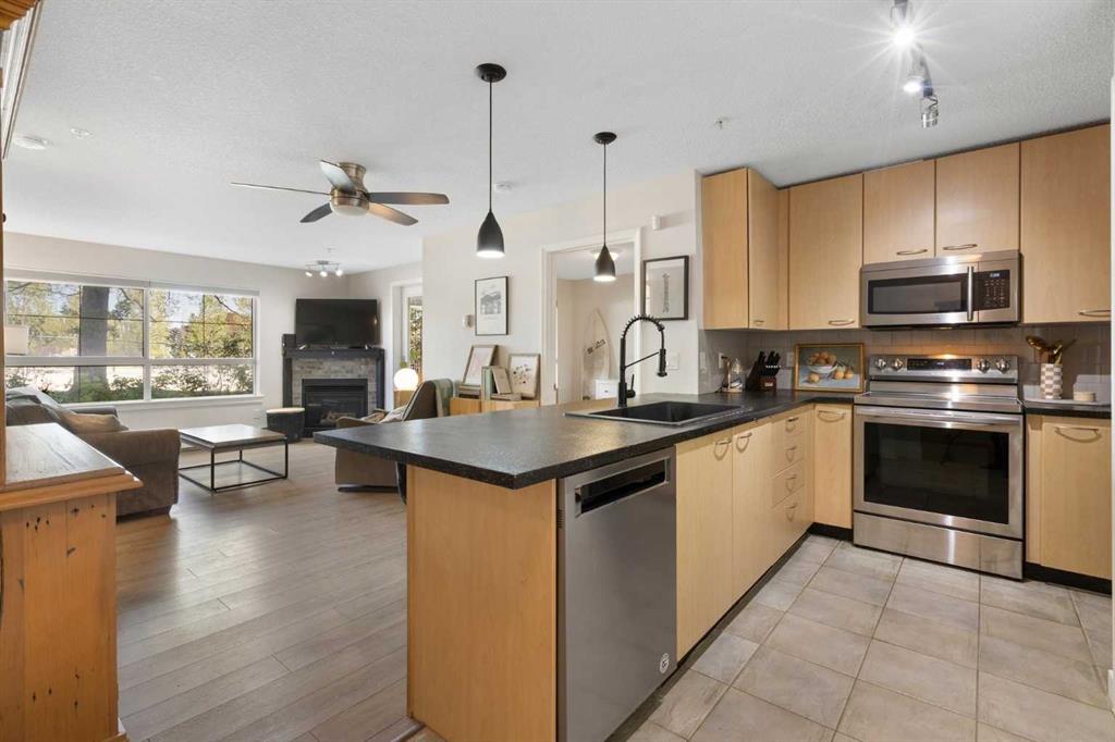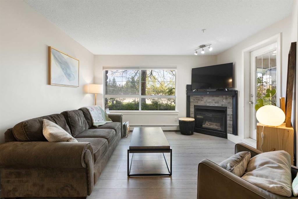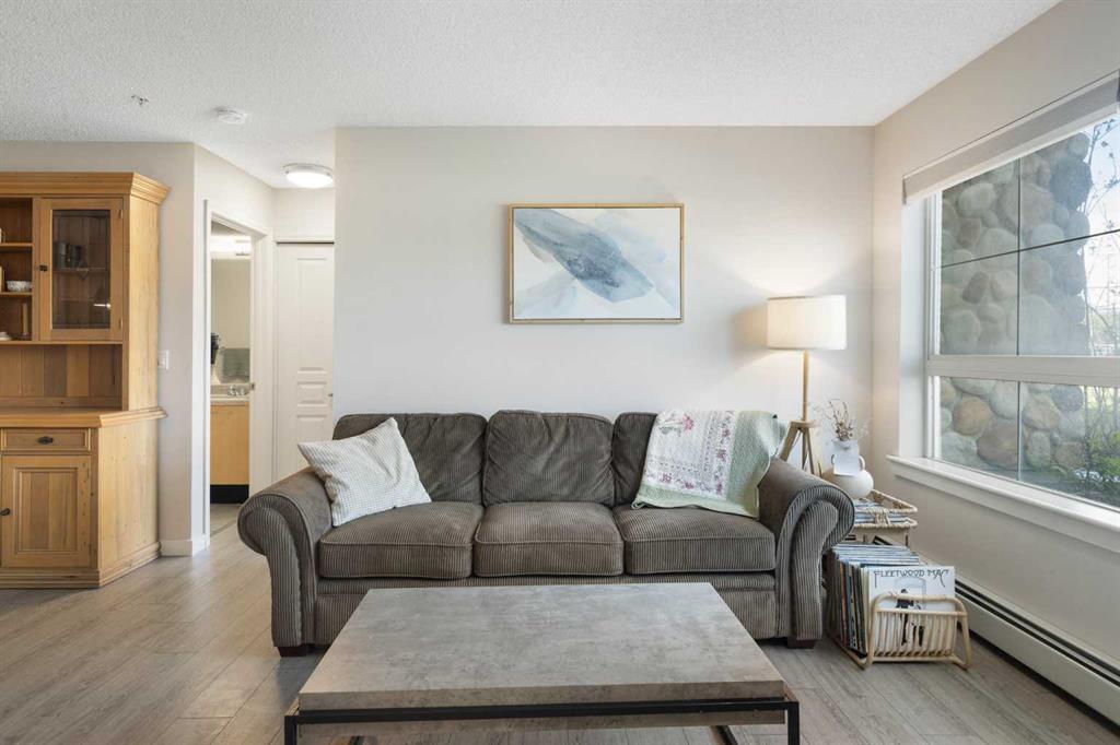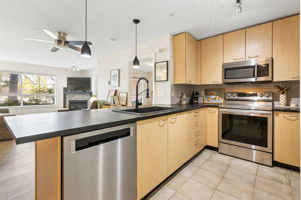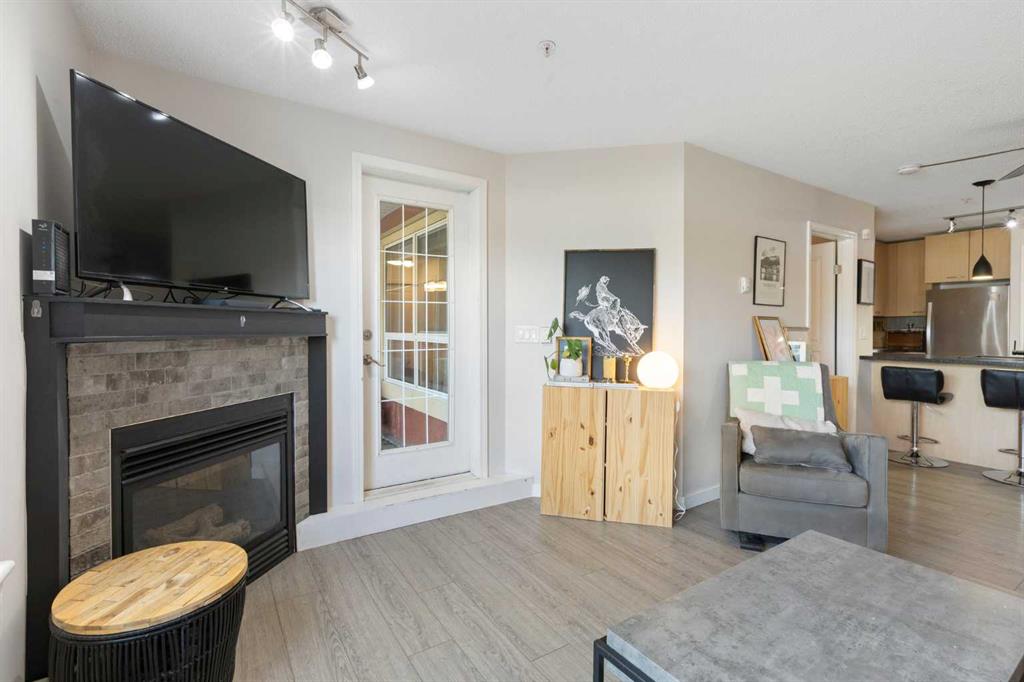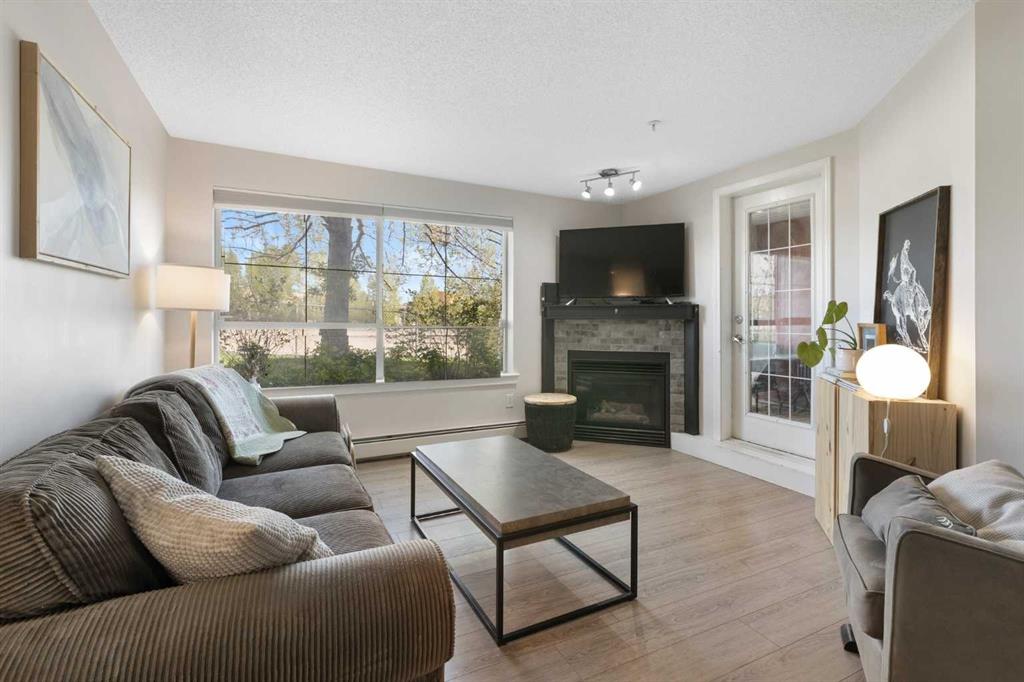 WELCOME HOME – amenities galore! This spacious and beautifully updated main floor unit features 2 bedrooms and 2 bathrooms, offering an ideal layout with bedrooms split by a spacious living and dining area. The unit opens up with a large front entryway, open-concept living, and stylish finishes throughout including newer vinyl plank flooring and a fresh modern colour palette. The well-appointed kitchen features upgraded stainless steel appliances, pantry, and plenty of cabinetry. The bright living room is highlighted by large windows and a cozy corner gas fireplace and opens onto a generous covered patio that backs onto green space—ideal for relaxing or for owners looking for easy outdoor access. The large primary bedroom includes a 4-piece ensuite, a walkthrough closet & a window overlooking the patio. A second bedroom sits across from a 3 piece bath, perfect for guests or roommates. There's also flexible den space—ideal for a home office or extra storage. Additional features include 2 titled underground parking stalls, in-suite laundry, and access to premium building amenities such as a fitness centre, party room, bike storage, visitor parking, and a beautiful private courtyard. Ideally located just steps from Mount Royal University, with easy access to Stoney Trail, Crowchild Trail, Glenmore Trail, downtown, and within walking distance to transit, coffee shops, restaurants, and shopping—this is a fantastic opportunity for first-time buyers, students, investors, or those looking to downsize without compromising lifestyle. Get in touch today and snag one of the best units in the building!