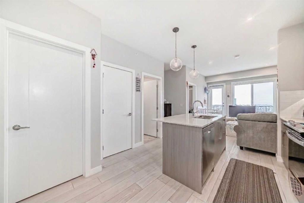 Stylish Top-Floor Condo with Premium Finishes & Top Amenities. Welcome to this modern, energy-efficient top-floor unit offering comfort, convenience, and low-maintenance living. This home features 2 bedrooms, 1 bathroom, 1 storage/locker, and 1 outdoor titled parking stall and low condo fees; ideal for first-time buyers, downsizers, or investors. Conveniently located close to the elevator with easy access east to major highways and nearby amenities. The building offers secure entry, landscaped grounds, and excellent amenities including a full fitness centre (weights, yoga & spin studio), entertainment lounge, pet spa, bike storage/repair room, and a courtyard seating area. Inside, enjoy 9’ ceilings, large windows, luxury vinyl plank flooring, designer lighting, and in-suite laundry. The contemporary kitchen features quartz countertops, full-height backsplash, stainless steel Whirlpool appliances, and sleek cabinetry with soft-close details. The bathroom is finished with quartz counters, modern fixtures, and a deep soaker tub. A perfect blend of style, location, and everyday convenience.