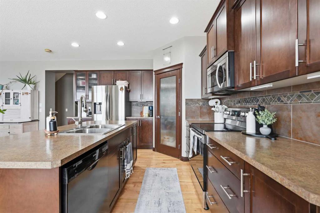 Properties like this don’t come along often. Situated on a quiet street in Sunset Ridge, this exceptional home rests on a sprawling PIE-SHAPED lot BACKING ONTO PATHWAYS AND GREEN SPACE, with UNOBSTRUCTED VIEWS of the Rocky Mountains. Inside, you are welcomed by a bright foyer with vaulted ceilings that leads into the open-concept kitchen, living, and dining area. This Jayman-built home features hardwood and tile flooring, maple cabinetry, upgraded appliances, a corner pantry, and a kitchen island, perfect for family gatherings. With a SOUTH FACING exposure, enjoy stunning views from all three levels all day long. Relax on the patio with a cool beverage or a BBQ while taking in the gorgeous mountain backdrop. The main floor also includes a home office with french doors, a half bathroom, and a mudroom. Upstairs, the freshly painted bonus room is perfect for family movie nights or a kids play area. The large primary suite offers breathtaking mountain views, a large walk-in closet, and a spa-inspired ensuite with a dual vanity, shower, and soaker tub. Two additional bedrooms and a full bathroom complete the upper level. The fully finished walk-out basement adds versatility with a fourth bedroom, 3pc bathroom, spacious rec/games area, and a fully finished laundry room with tons of storage. Direct access to the backyard makes it ideal for guests, teens, or multi-generational living. A double attached garage adds to daily convenience. Recent upgrades include: two A/C units, newer basement carpet and underlay, a newer stainless steel fridge, and hot tub wiring already in place. Solar panels provide long-term energy savings that significantly reduce electricity costs. Enjoy access to scenic walking paths, parks, schools, and local amenities, all while being just a short drive to the mountains and an easy commute to Calgary. Known for its elevated views, family-friendly atmosphere, and connection to nature, this is a community you’ll love coming home to. Imagine summer evenings here… the sun setting behind the mountains, kids playing in the yard, friends gathered on the patio, and nothing but open sky and nature behind you. This is the kind of backyard people wait years for.