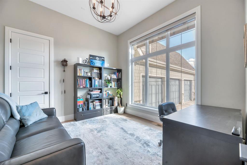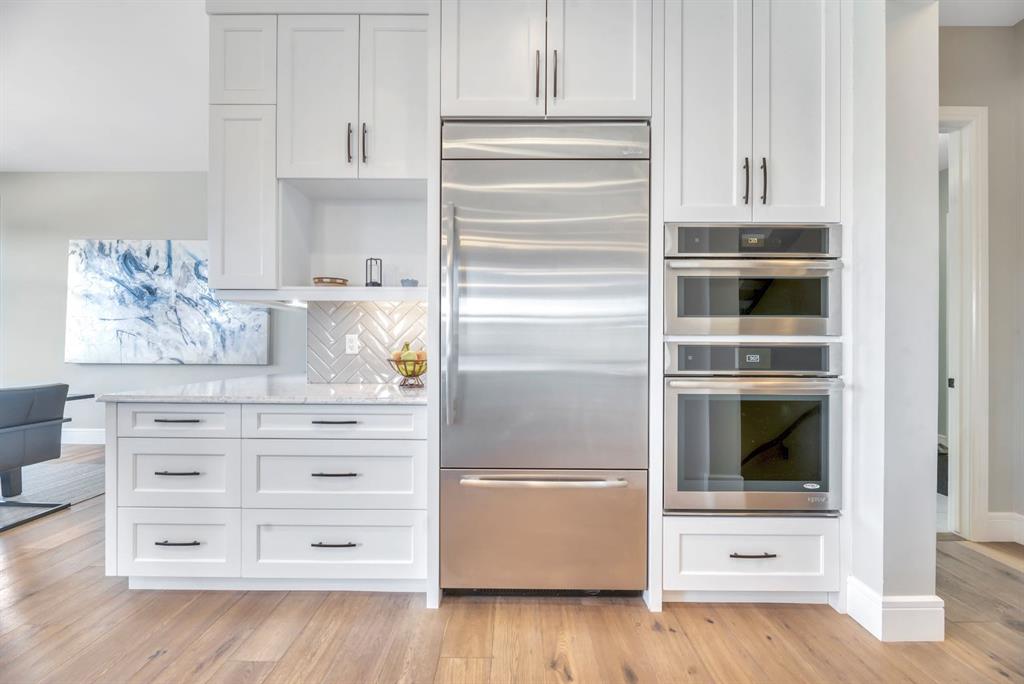 The main floor showcases an open-concept design with soaring ceilings, 8-foot doors, gorgeous hardwood flooring, and a seamless flow for everyday living and entertaining. At the heart of the home is the chef-inspired kitchen, beautifully appointed with upgraded built-in stainless steel appliances, granite and quartz countertops, an oversized island, and elevated cabinetry. Adjacent the kitchen, is a sizable dining room with an additional bank of cabinets, great for cocktails or coffee bar. A main floor den adds flexibility for a home office or quiet retreat.