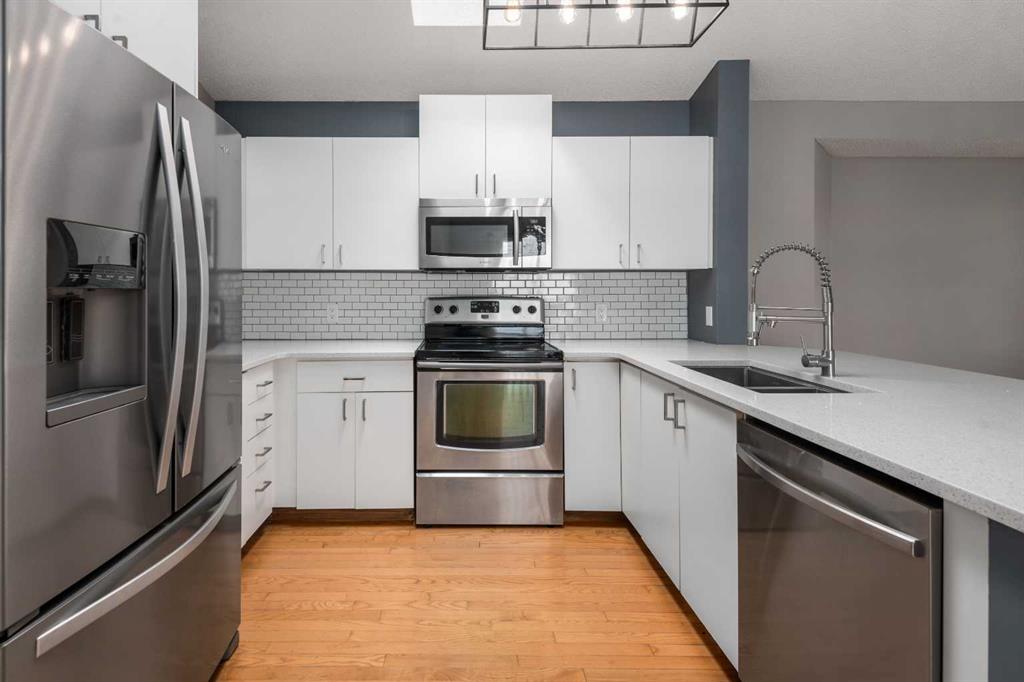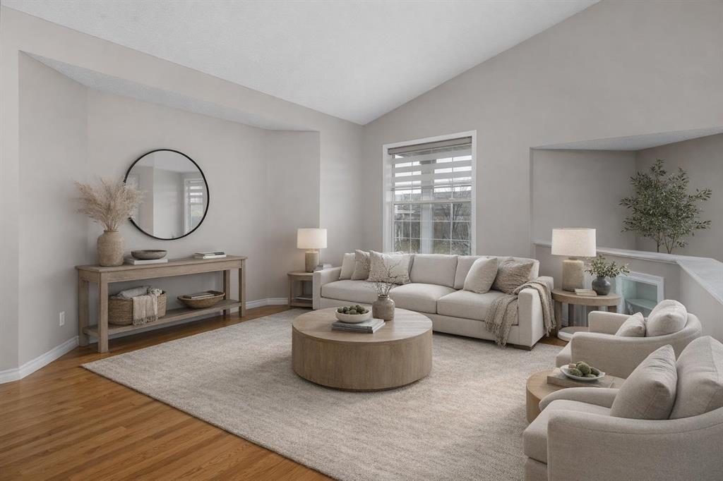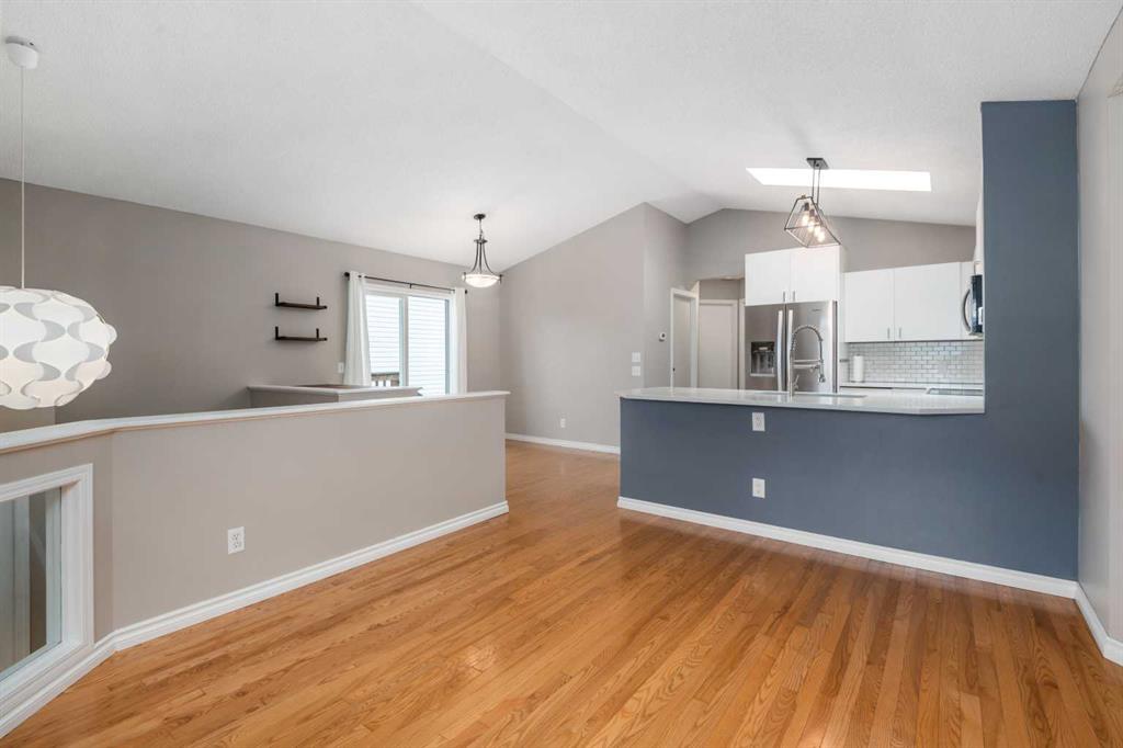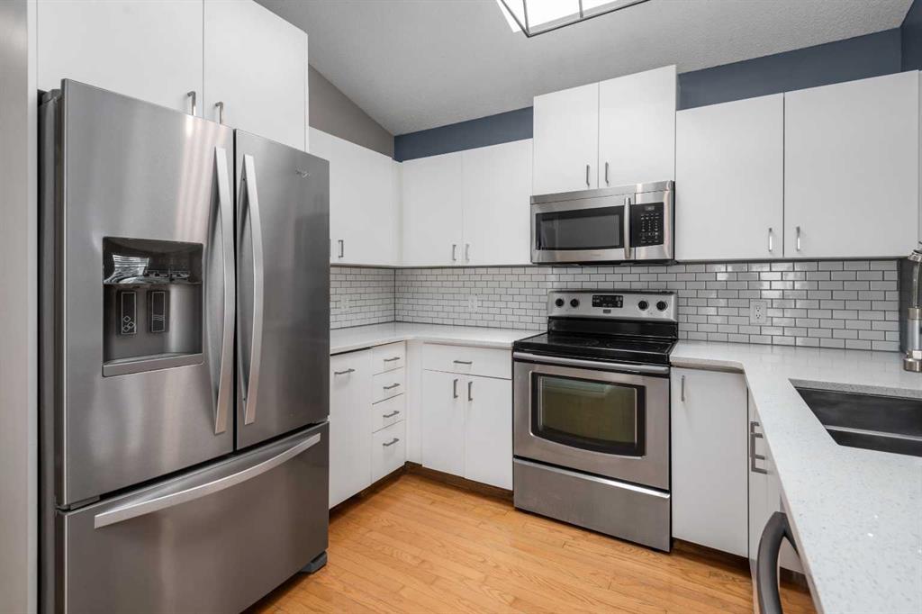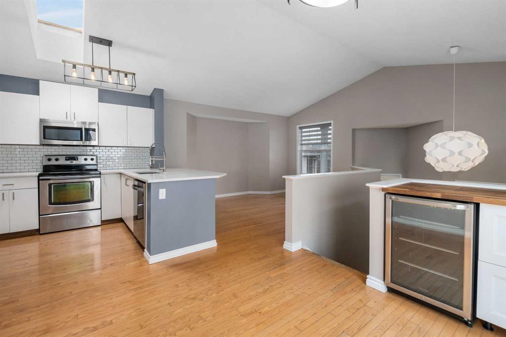 The main floor is filled with natural light and features an open-concept layout with hardwood flooring throughout, vaulted ceilings, and a skylight in the kitchen that enhances the airy feel of the home. The kitchen has been thoughtfully refreshed with new cabinet fronts, quartz countertops, a new kitchen sink, and updated appliances, creating a stylish and functional space for everyday living.