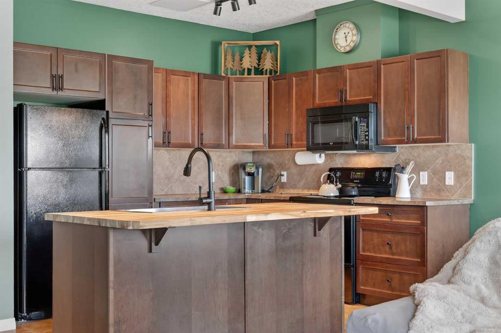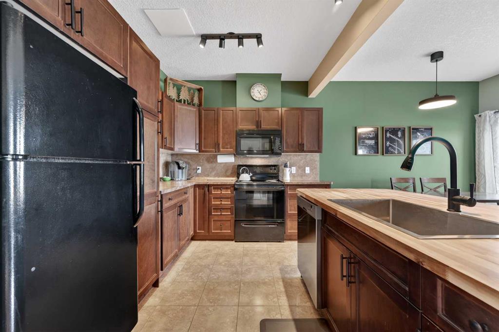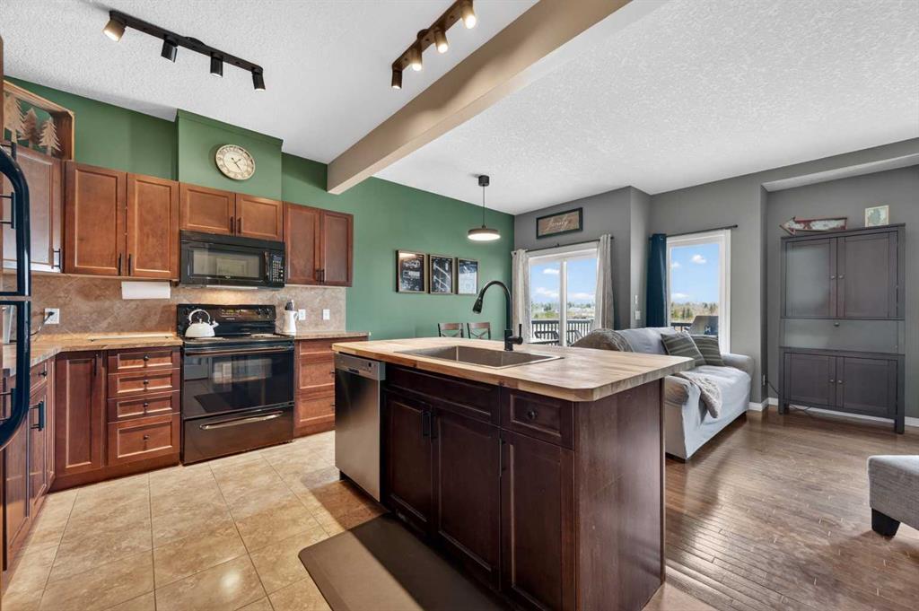The main floor offers a bright, open-concept design highlighted by 9’ knockdown ceilings and rich hardwood flooring throughout the living space. The kitchen is both stylish and functional, featuring warm wood cabinetry, black appliances, tile backsplash, and a large central island with butcher block countertop and a stainless steel farm house sink, perfect for meal prep and entertaining alike.