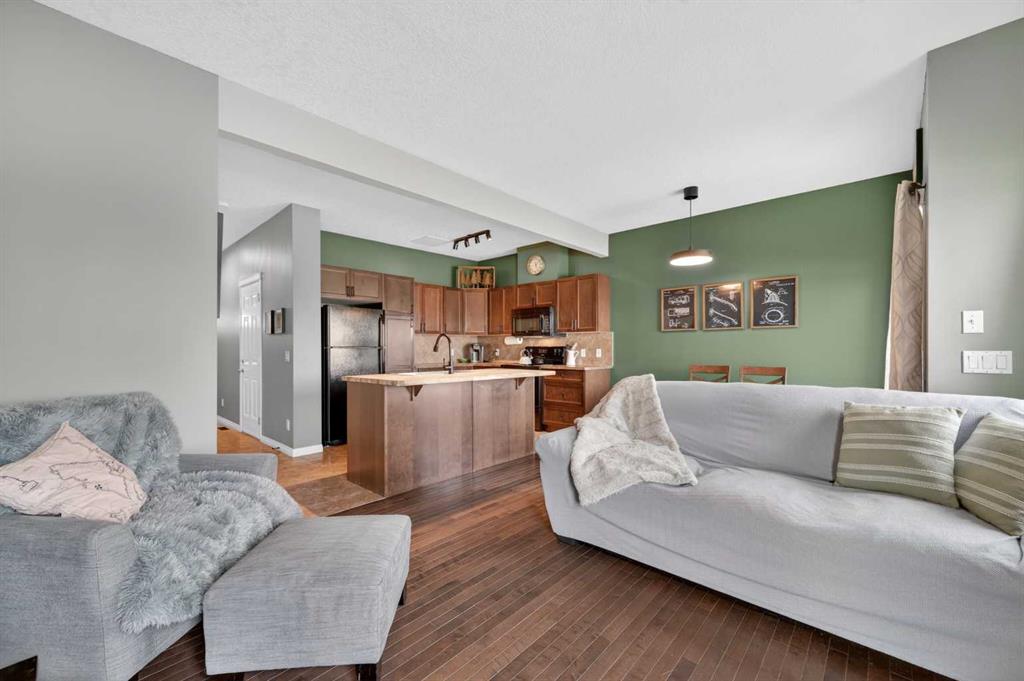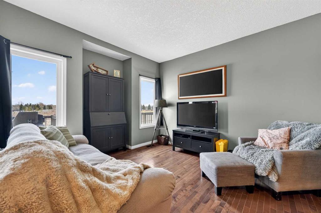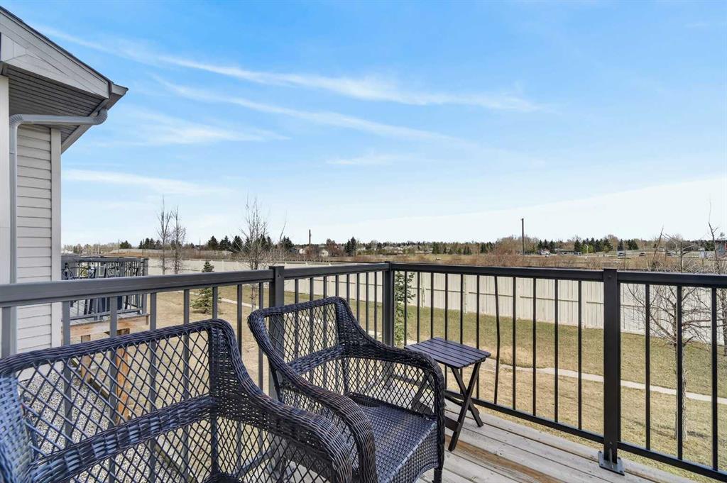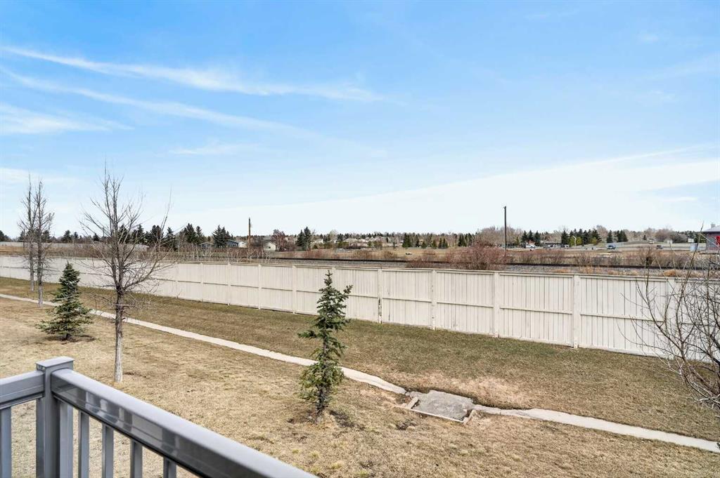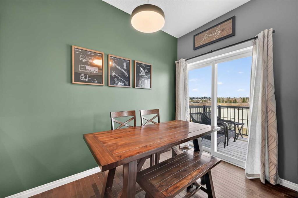 The adjacent dining and living areas are filled with natural light and flow seamlessly to the east-facing balcony, where you can enjoy peaceful views of Nose Creek Park and morning sun with added privacy and no rear neighbours. A convenient 2-piece powder room on the main level adds everyday functionality for guests.
