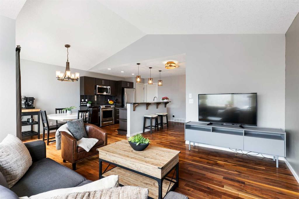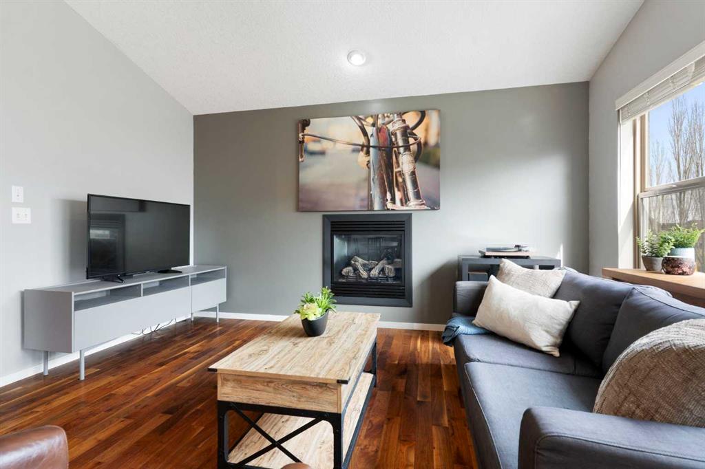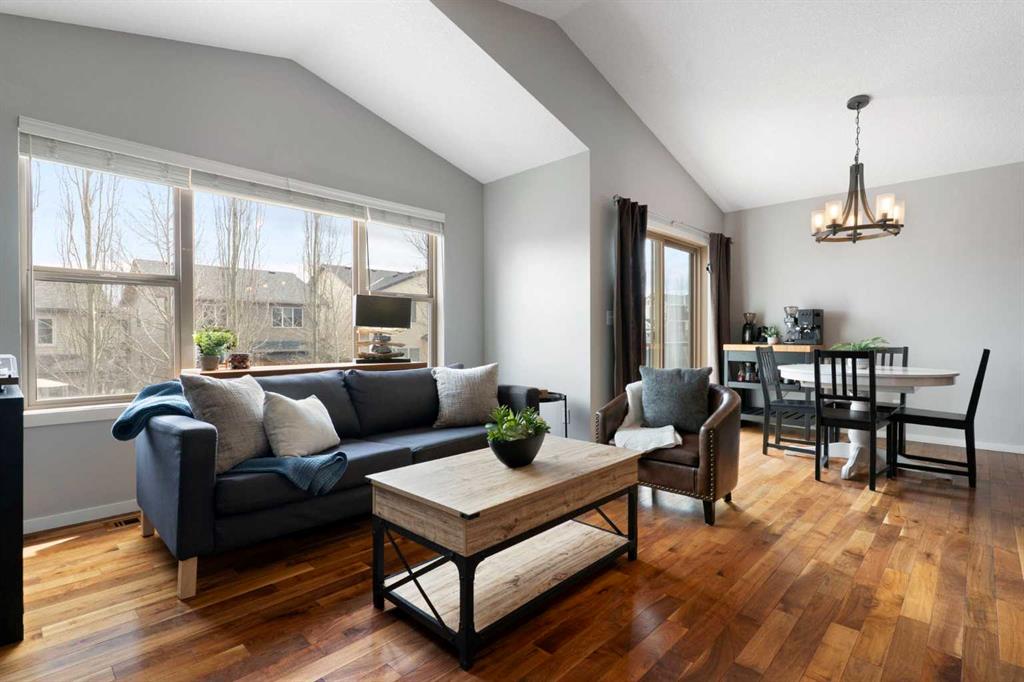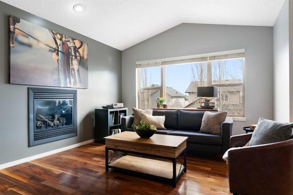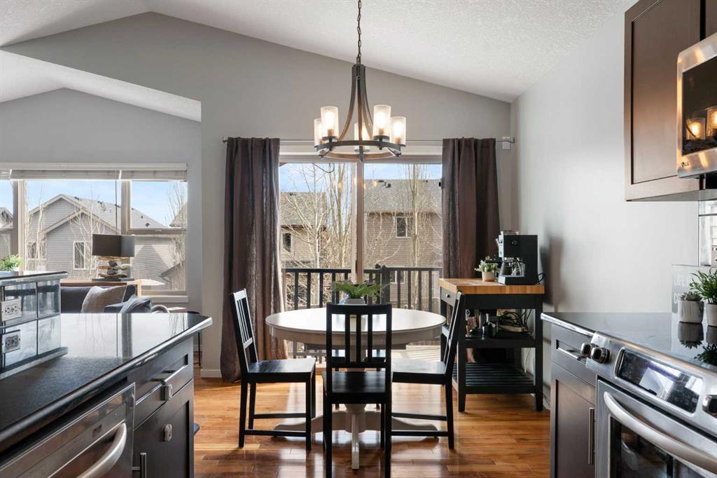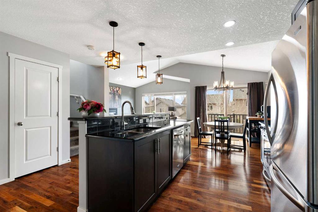 Step inside to an open concept main floor featuring rich hardwood flooring, vaulted ceilings, and large windows that fill the space with natural light. The kitchen is both stylish and practical, offering granite countertops, stainless steel appliances, and seamless flow into the dining and living areas, perfect for both daily living and entertaining. Main floor laundry and an attached double garage add to the home’s convenience.