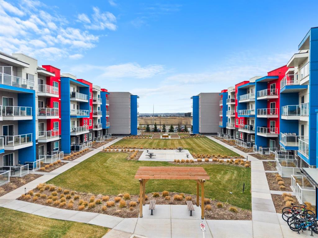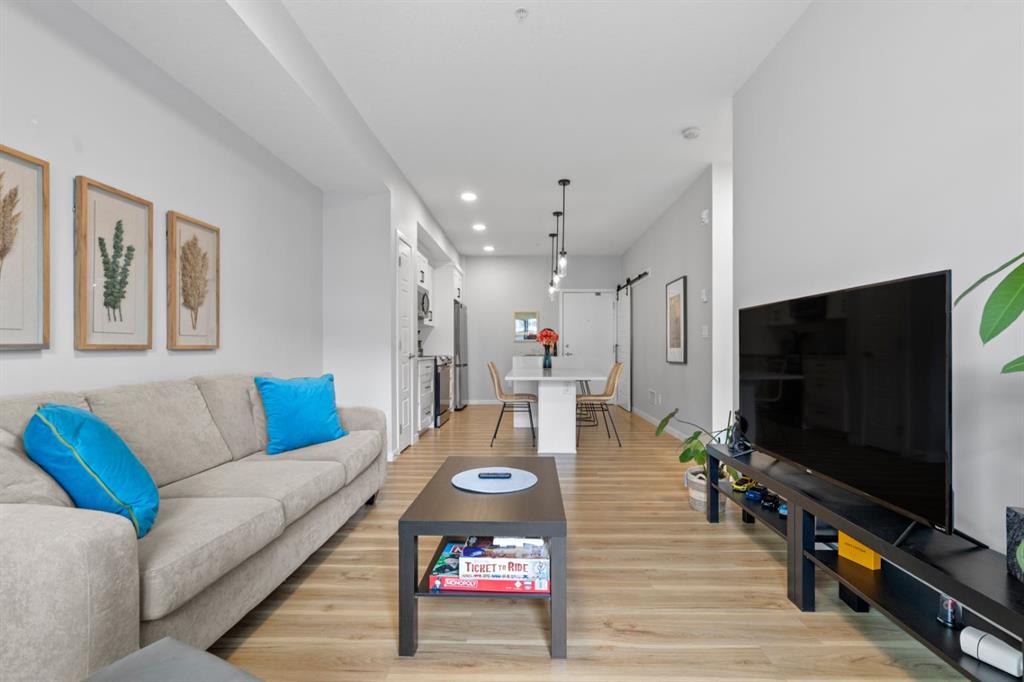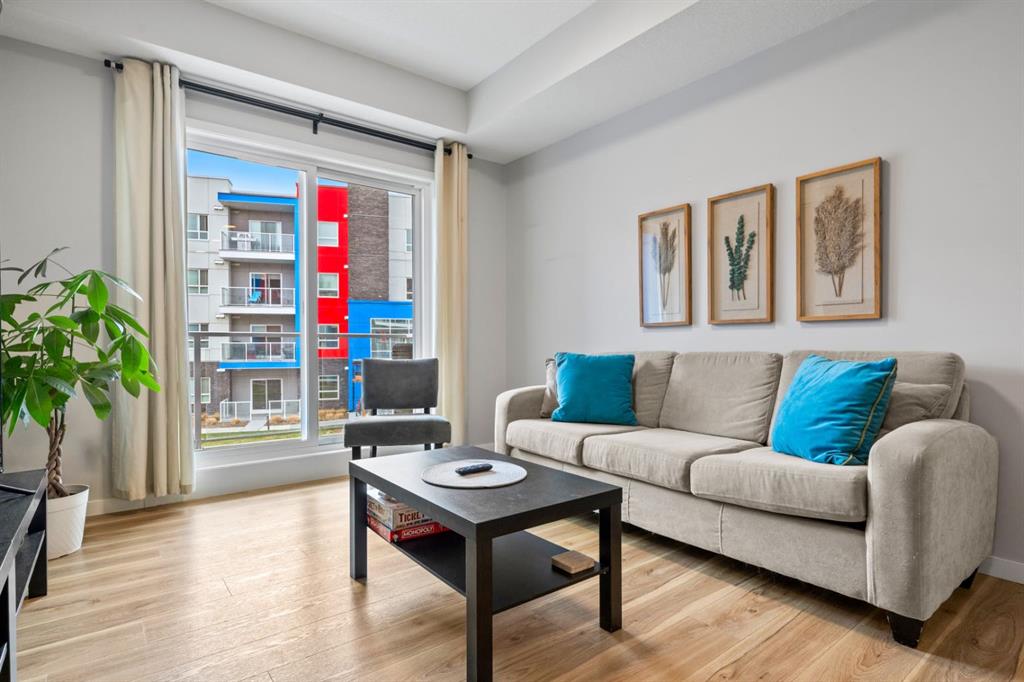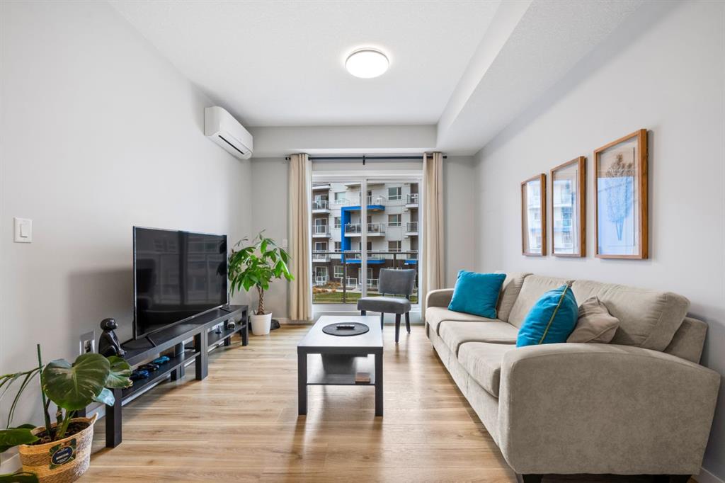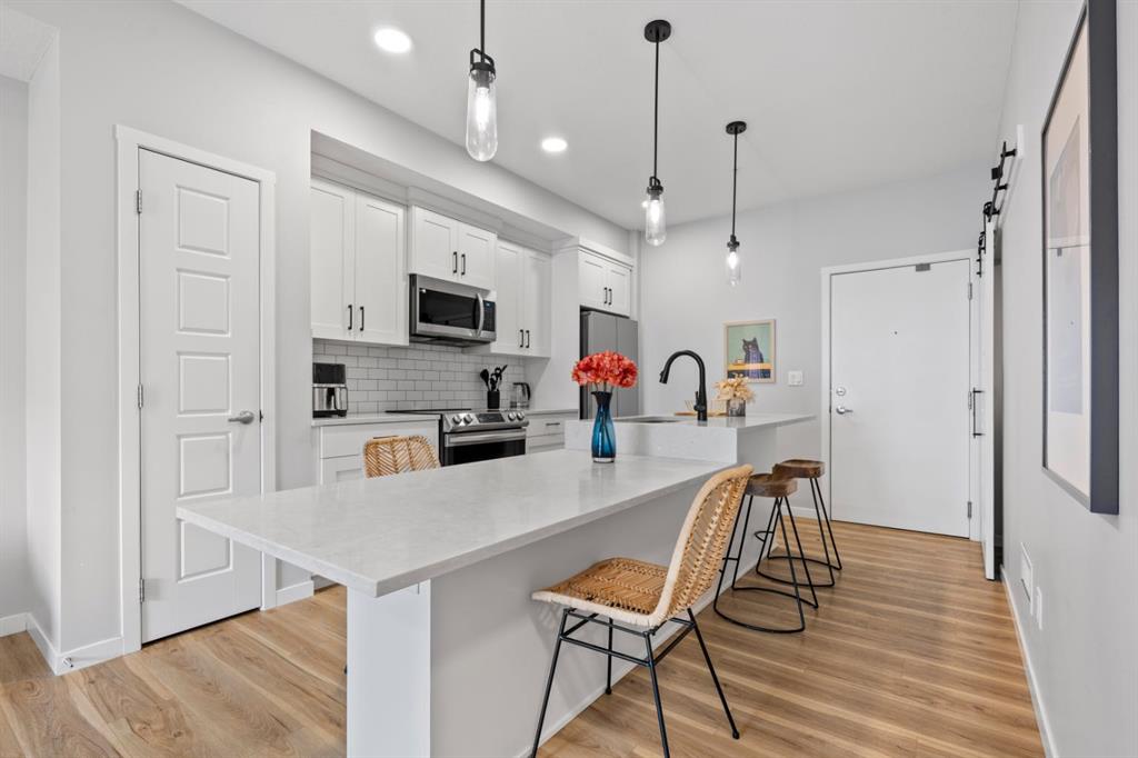 Open House Saturday 12-2 pm. Welcome to this wonderful gem of a property. This thoughtfully designed one bedroom home has the space to entertain while still being the ideal retreat from a busy life. Upgraded with central air conditioning and luxury vinyl plank and tile flooring throughout, all the details of this home have been carefully considered. The kitchen features quartz countertops, full height white cabinetry with extra pots and pans drawers, and a separate pantry which really optimizes storage. The kitchen island has been cleverly fitted with both ample counter space and a built-in dining table for 4 as well as a breakfast bar for 2. The generous living room is perfect for both movie nights and lively conversations. Sliding doors lead out to the balcony which overlooks the courtyard, greenspace, and community gardens. The bedroom has enough space for a king-sized bed and the walk-in closet has been fitted with clever single and double hanging space, drawers, and shelving eliminating the need for a dresser. The full bath also has quartz countertops and is complete with a soaker tub and shower combo. All of your storage needs will be met as this unit has a large laundry room with additional cabinetry and shelving, plus a separate storage locker which has been leased for 70 years. Finally, this unit comes with a titled, heated, underground parking stall which is mere steps away from the elevator. This location is Seton is very walkable with Red’s Diner, Leopold’s Tavern, Community Natural Foods, the YMCA, and the South Health Campus only a block or 2 away. There are also plenty of restaurants, shops, additional supermarkets, and a movie theatre within easy walking distance.