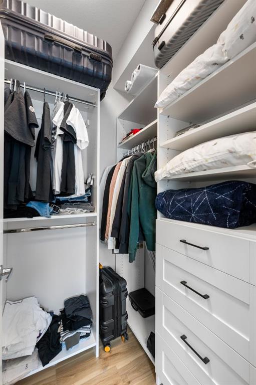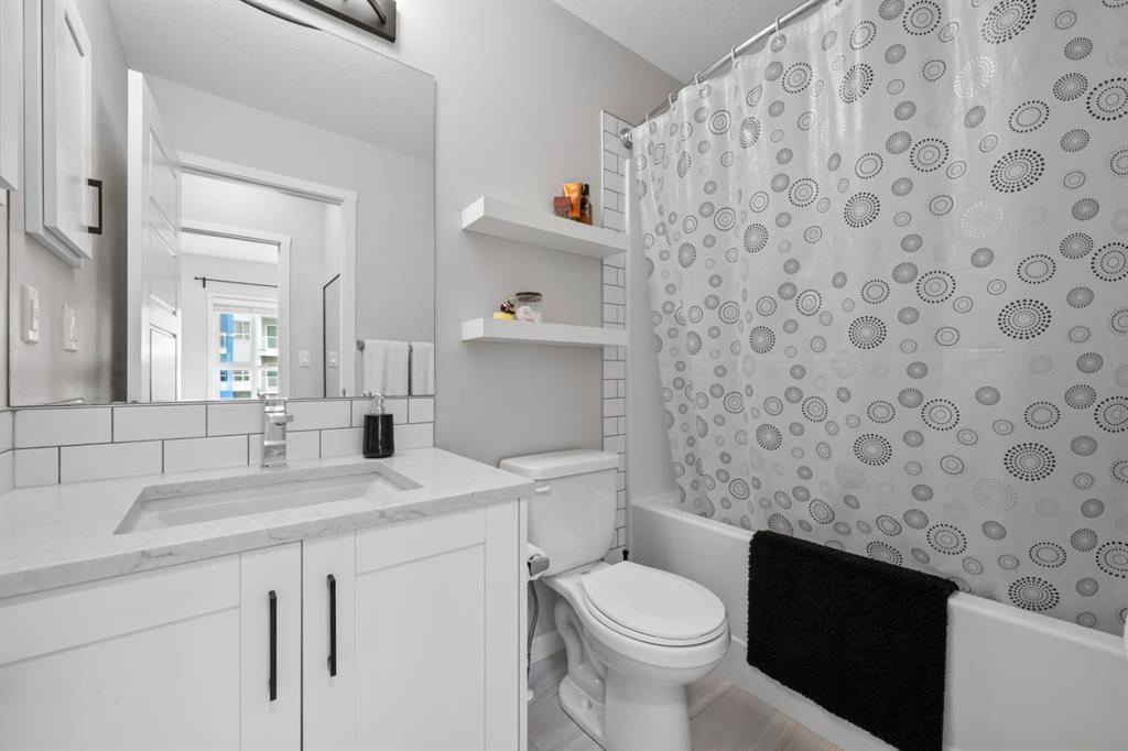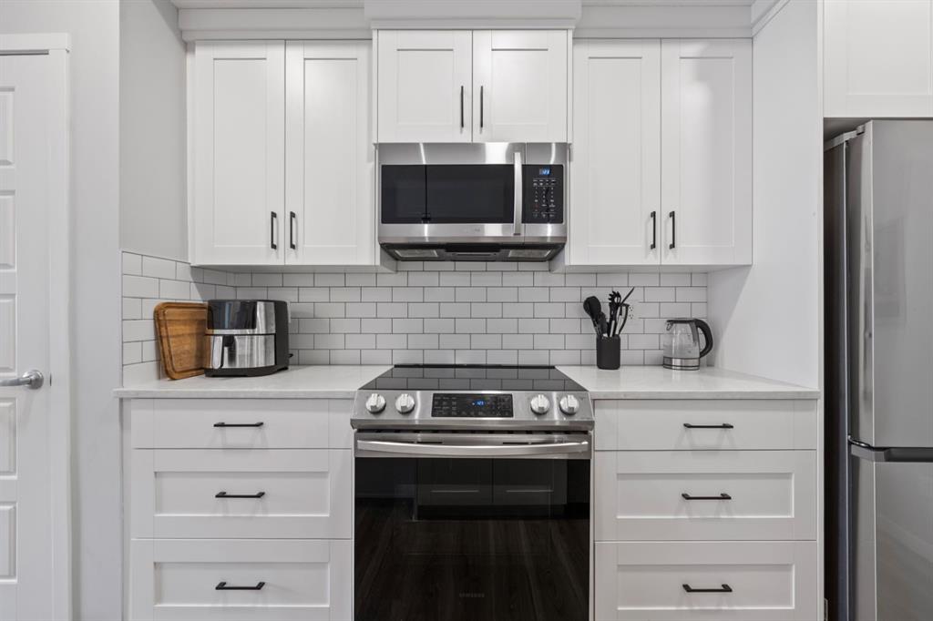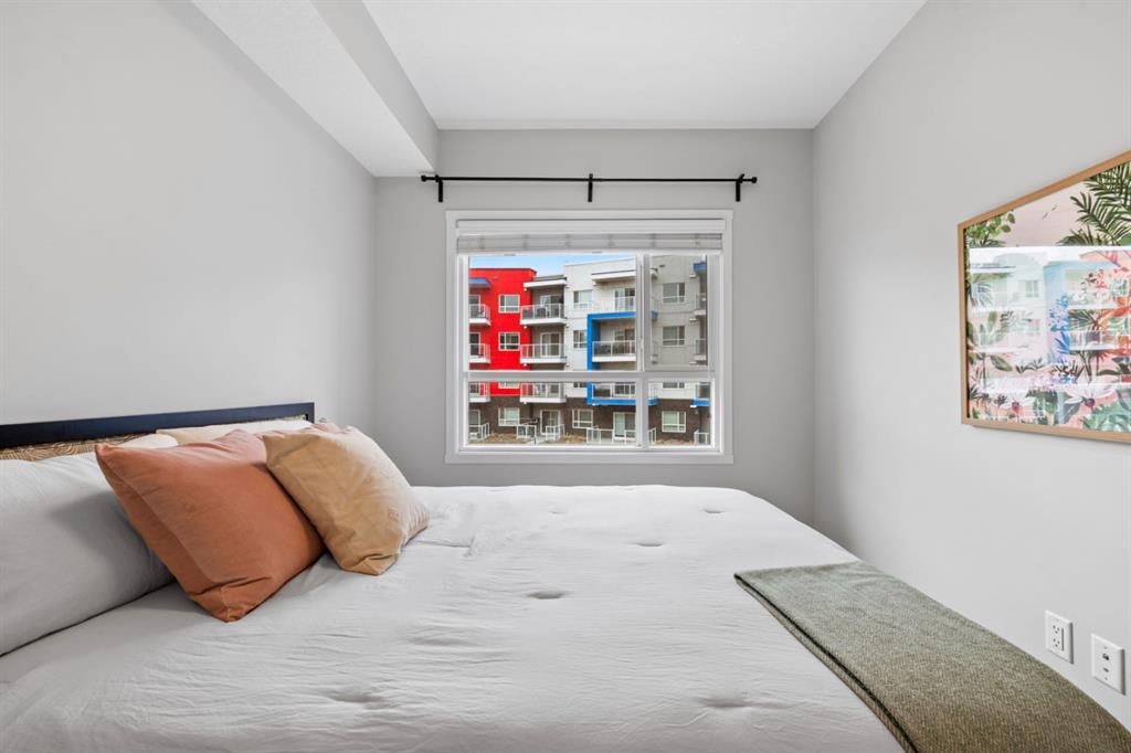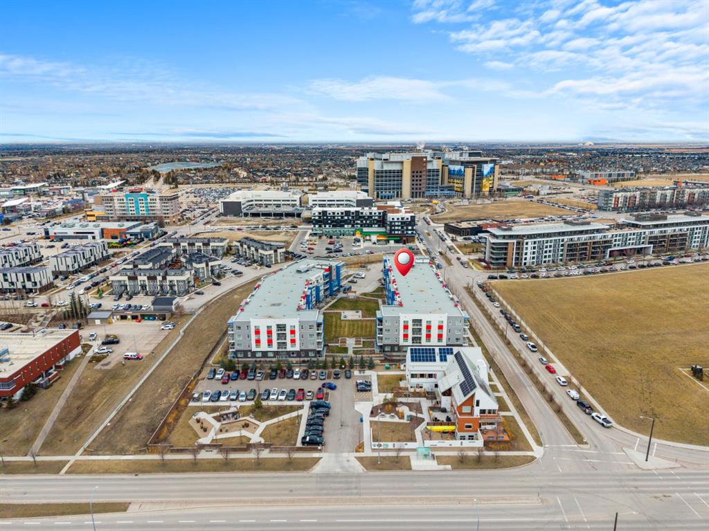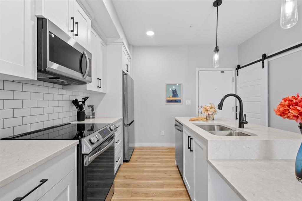 Open House Saturday 12-2 pm. Welcome to this wonderful gem of a property. This thoughtfully designed one bedroom home has the space to entertain while still being the ideal retreat from a busy life. Upgraded with central air conditioning and luxury vinyl plank and tile flooring throughout, all the details of this home have been carefully considered. The kitchen features quartz countertops, full height white cabinetry with extra pots and pans drawers, and a separate pantry which really optimizes storage. The kitchen island has been cleverly fitted with both ample counter space and a built-in dining table for 4 as well as a breakfast bar for 2. The generous living room is perfect for both movie nights and lively conversations. Sliding doors lead out to the balcony which overlooks the courtyard, greenspace, and community gardens. The bedroom has enough space for a king-sized bed and the walk-in closet has been fitted with clever single and double hanging space, drawers, and shelving eliminating the need for a dresser. The full bath also has quartz countertops and is complete with a soaker tub and shower combo. All of your storage needs will be met as this unit has a large laundry room with additional cabinetry and shelving, plus a separate storage locker which has been leased for 70 years. Finally, this unit comes with a titled, heated, underground parking stall which is mere steps away from the elevator. This location is Seton is very walkable with Red’s Diner, Leopold’s Tavern, Community Natural Foods, the YMCA, and the South Health Campus only a block or 2 away. There are also plenty of restaurants, shops, additional supermarkets, and a movie theatre within easy walking distance.