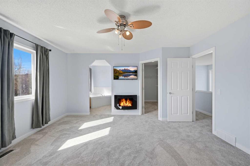 The main floor includes a cozy living room with fireplace, a functional kitchen, large laundry room, and a 2-piece bath. Upstairs, the spacious primary bedroom features a 4-piece ensuite and walk-in closet, along with two additional bedrooms and a full bath.