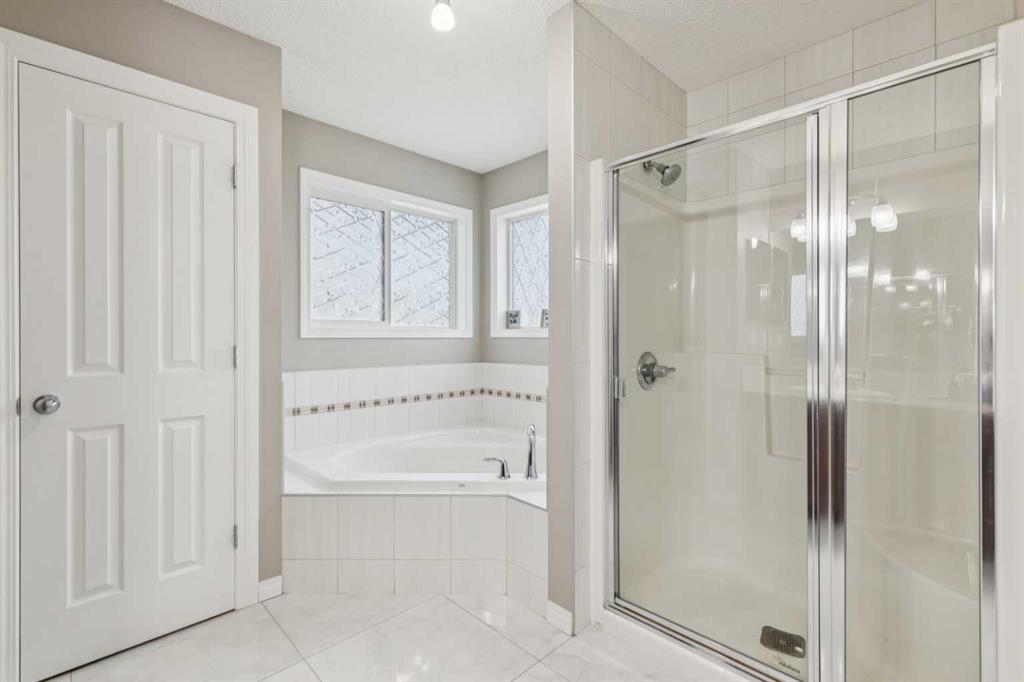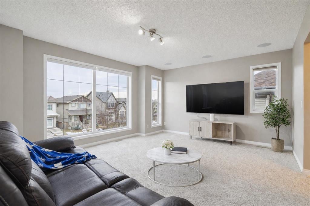 Upstairs, the primary suite is a true retreat, offering a massive walk-in closet and spa-inspired 4-piece ensuite with a soaker tub and separate shower. Three additional generously sized bedrooms, each with large windows and deep closets, are complemented by a second full bathroom and a versatile bonus family room featuring floor-to-ceiling windows and built-in speakers.