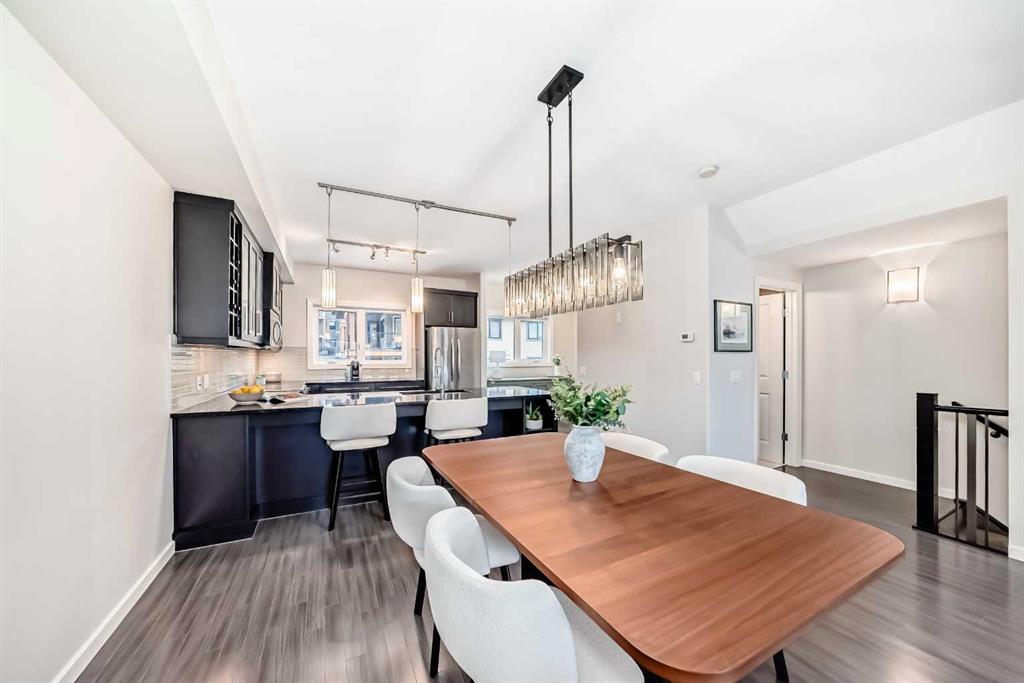 The heart of the home unfolds with an airy, open-concept layout anchored by rich hardwood flooring. At its centre, a chef-inspired kitchen features sleek quartz countertops, premium stainless steel appliances, and an expansive eating bar. This level is further enhanced by a versatile flex space—perfect for a professional home office or a bright breakfast nook—which transitions seamlessly onto a private balcony for effortless indoor-outdoor hosting.