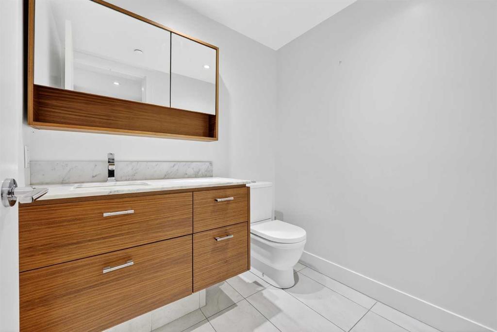 Upstairs, the primary suite offers a private retreat with three organized closets and a spa-inspired ensuite featuring dual vanities, a glass walk-in shower, and heated floors. The second bedroom is generously sized and ideally located next to the main four-piece bathroom, which also includes in-suite laundry and heated tile floors—adding both comfort and convenience.