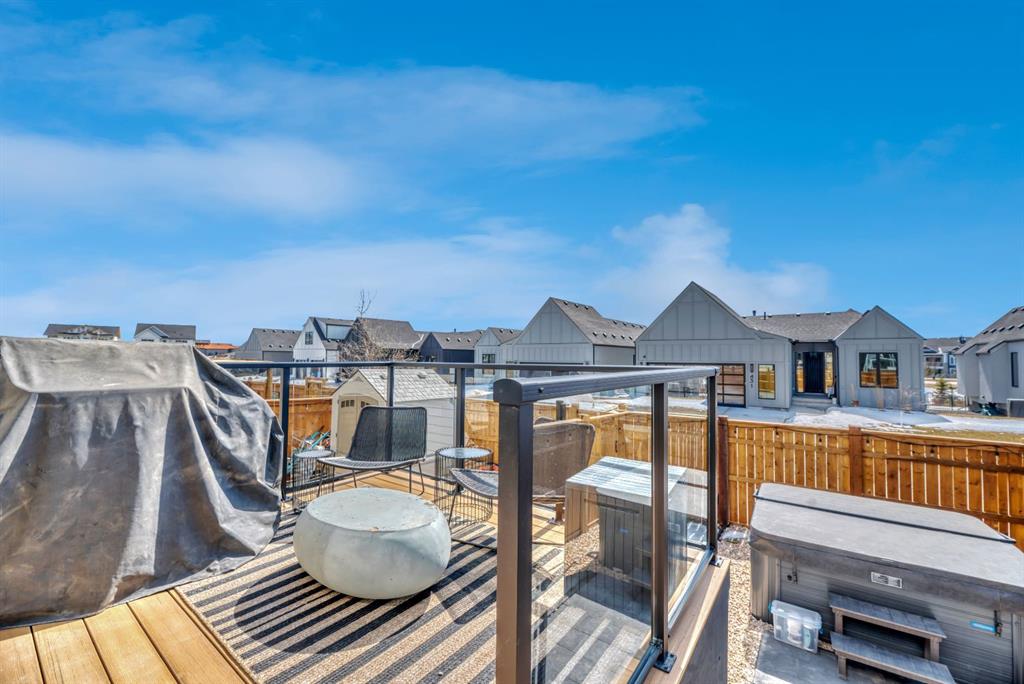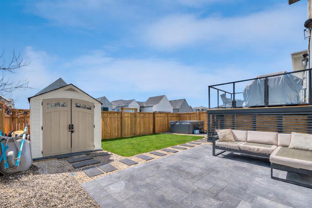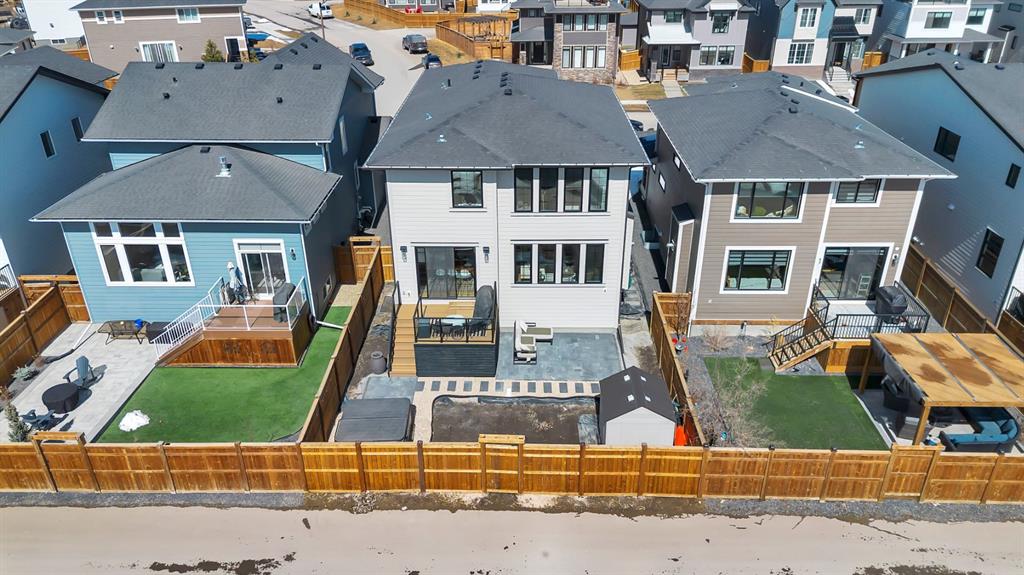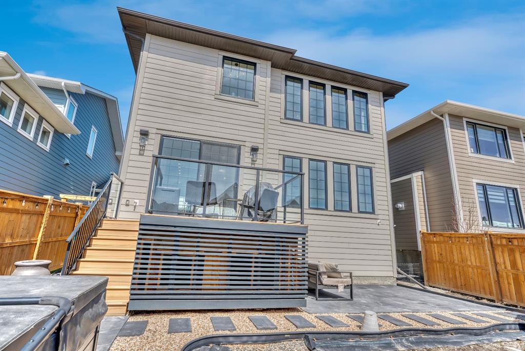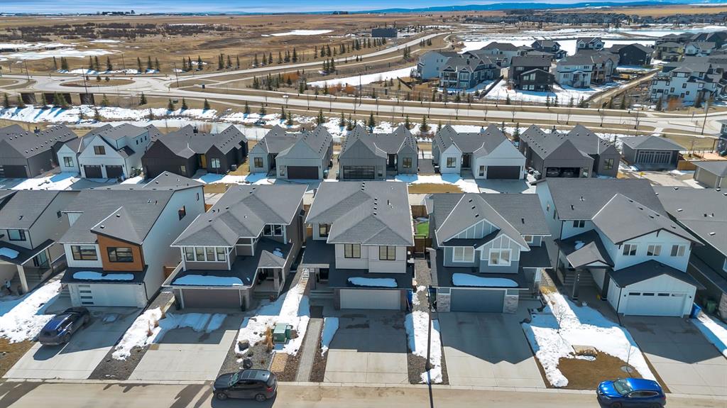 Welcome to an architecturally inspired Organic Modern residence in the award-winning lake community of Harmony—where elevated design meets an unmatched lifestyle just minutes west of Calgary. Enjoy quick access to the city, the renowned Mickelson National Golf Club, and a growing collection of amenities including the lake, beach, pathways, parks, and future village centre—offering a rare blend of recreation, convenience, and community. This modern transitional home offers over 2,700 sq ft of thoughtfully curated living space, combining clean architectural lines with warm, organic finishes. From the moment you arrive, the herringbone brick walkway, soft neutral palette, and striking black-framed windows set the tone for what’s inside. Step into a light-filled interior defined by wide plank natural white oak flooring, soaring ceilings, and custom archways that soften the modern aesthetic and create a sense of flow throughout. The main floor features a stylish front office/den, perfect for working from home, while the open-concept living space is both refined and inviting. At the heart of the home is a stunning designer kitchen that perfectly captures today’s most sought-after style—featuring marble backsplash, marble and honed quartz surfaces, panel-ready appliances, and an induction cooktop with a concealed hood fan. A thoughtfully designed coffee bar and walk-through pantry connect seamlessly to the mudroom, where custom cabinetry and chevron brick flooring elevate everyday function with designer flair. Upstairs, the home continues to impress with 4 spacious bedrooms plus a lofted bonus room with a half-vault ceiling, creating a bright and airy retreat. The primary suite is a true sanctuary, complete with custom drapery and a spa-inspired ensuite featuring floating vanities, wall-mounted faucets, a freestanding soaker tub with bath filler, and a large glass-encased marble shower. The main bathroom is ideal for family living, offering a smart layout with a separate vanity area from the water closet. Every detail has been carefully selected—from champagne bronze hardware and custom lighting to elevated millwork, trim, and finishes throughout—creating a cohesive, high-end aesthetic that feels both modern and timeless. Outdoor living is equally impressive with a composite deck (with storage below), stone patio, and hot tub, plus gas lines to the deck, patio, and garage—perfect for entertaining year-round. Additional features include hot and cold exterior taps, Gemstone permanent soffit lighting, a reverse osmosis system, and a sunshine basement filled with natural light and ready for future development. Sod will be completed as weather permits. Complete with a double attached garage and located in one of the most desirable communities in the Calgary area, this home offers a rare opportunity to own a design-forward, move-in ready property in Harmony. Modern. Warm. Effortlessly elevated.