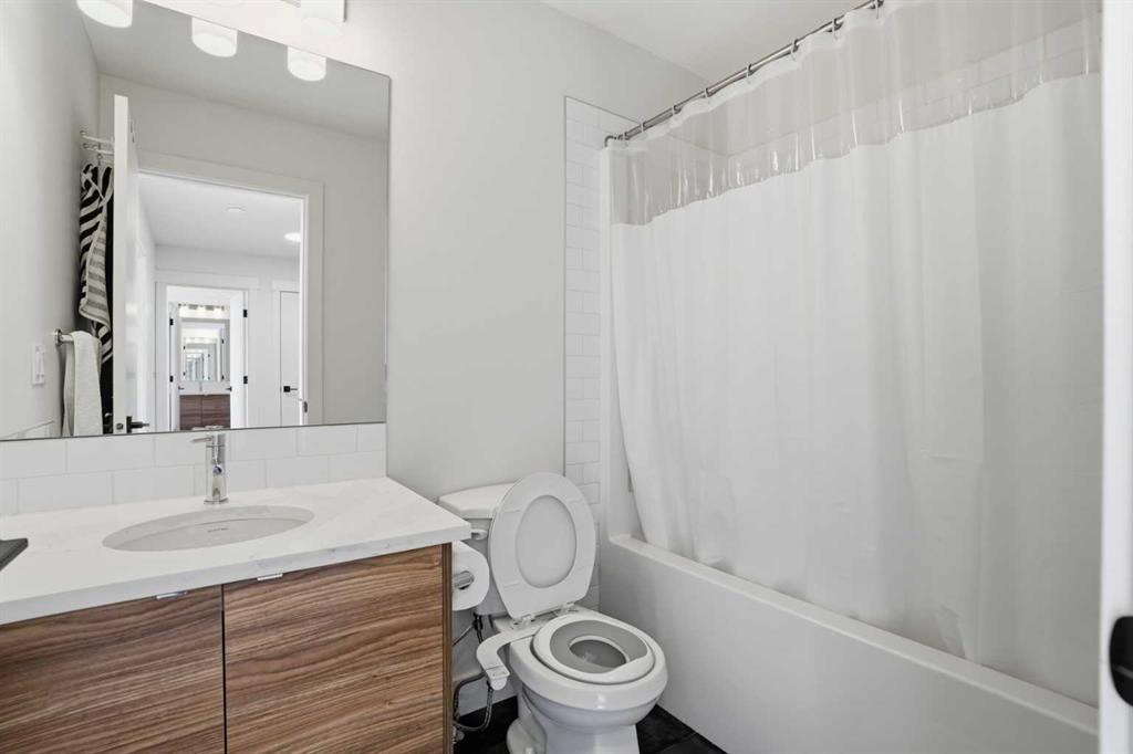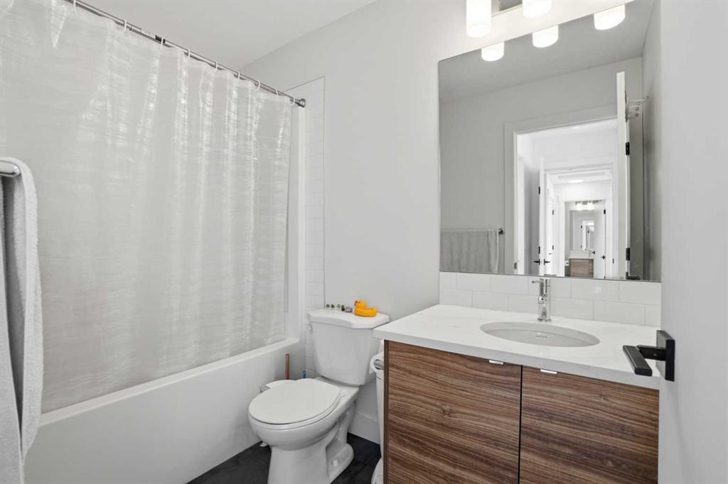 The open-concept main floor is filled with incredible natural light from large windows and features high ceilings and recessed lighting. The kitchen is beautifully finished with sparkling quartz countertops, two-toned cabinetry, stainless steel appliances, and a stylish honeycomb backsplash. A centred breakfast bar with barstool seating provides the perfect spot for casual meals. The kitchen, dining, and living areas flow seamlessly together, creating a welcoming space for both everyday living and entertaining. Just off the living area is access to the first of two balconies—ideal for easy indoor/outdoor cooking and dining during the warmer months. A 2-piece powder room completes this level.