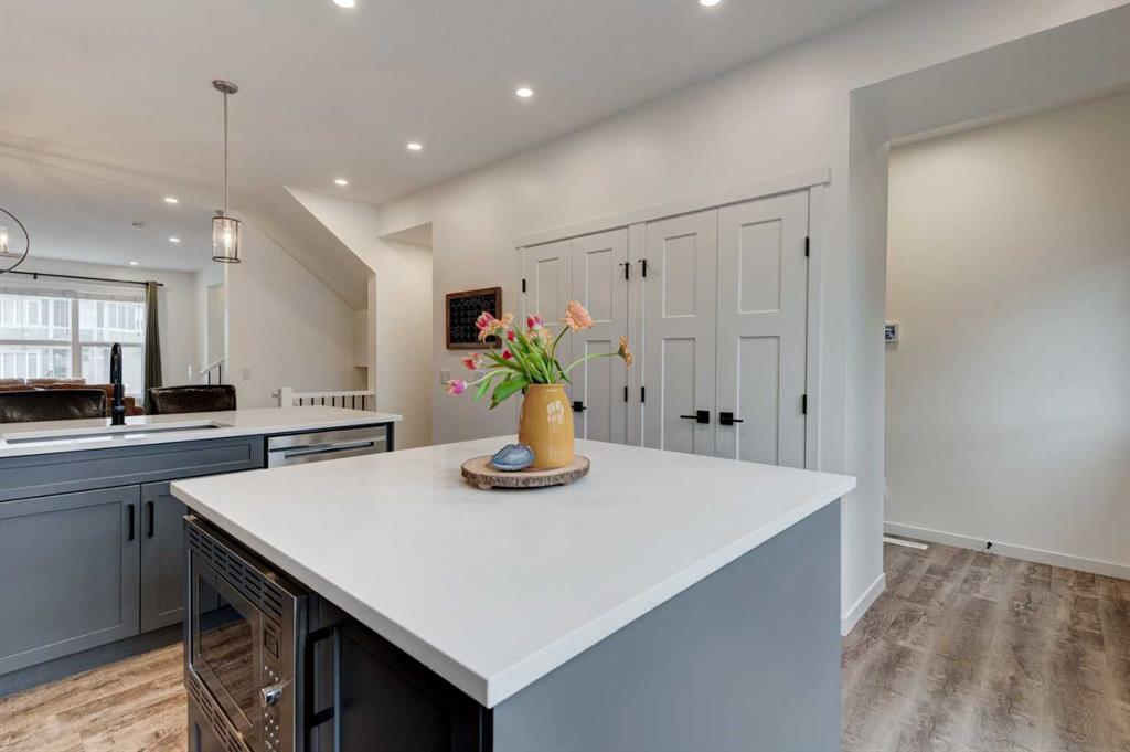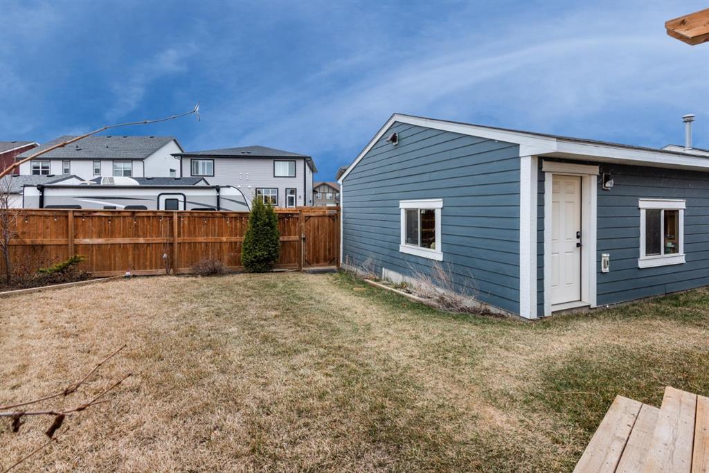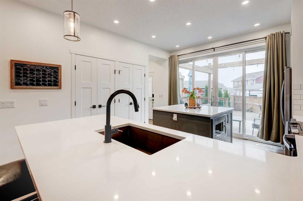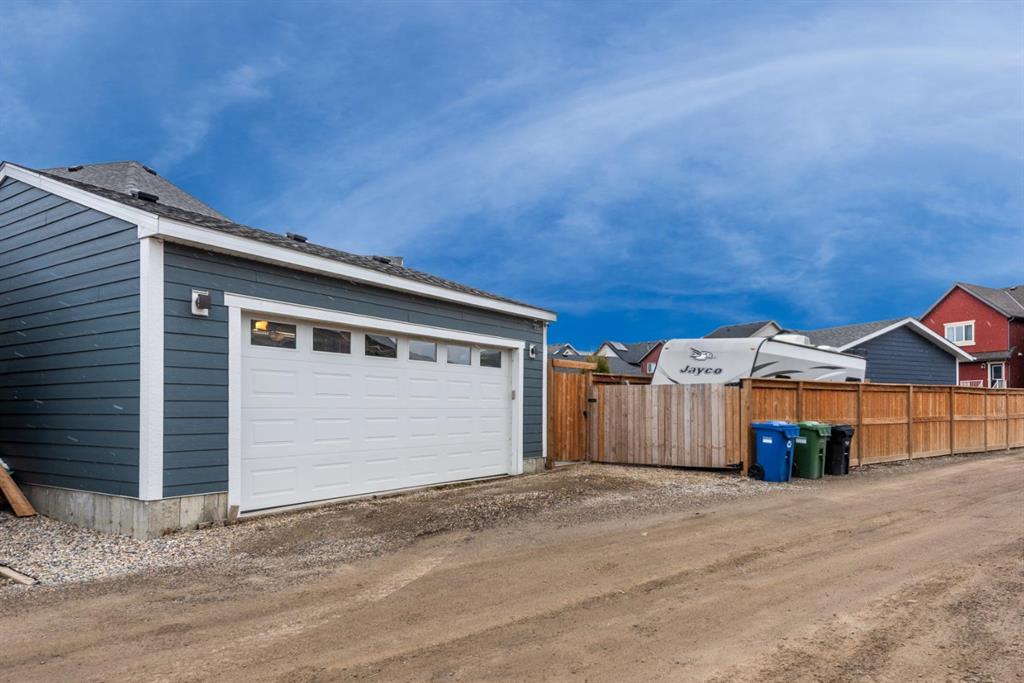 ** Open House Saturday April 25th from 1pm-3pm! ** Welcome to this bright 4-bedroom, 3.5-bathroom two-storey home, set on a spacious 4,962 sq ft southwest-facing pie lot with an oversized 24x24 heated garage and RV parking, located in the award winning lake community of Mahogany. This lovingly well-maintained home offers a very functional layout with modern finishes, upgrades throughout, and a fully finished basement. The open concept main floor features the stylish kitchen with quartz countertops, island with drawers, cabinets, and bar seating, stainless steel appliances, useful pantry, and added broom/vacuum storage. Upgraded sliding patio doors in the kitchen create a smooth transition to the outdoor deck, while allowing an abundance of natural light to fill the main floor. The living room features an electric fireplace with custom floating wood shelves and flows seamlessly into the dining area. The rear mudroom with built-in lockers adds everyday practicality, and the powder room completes the main level. The upper level includes three bedrooms, two full bathrooms, a laundry room with shelving and a linen closet. The spacious primary suite accommodates a king-sized bed and additional furniture, and features a walk-in closet and the beautifully finished ensuite with dual sinks and a fully tiled walk-in shower. The fully finished basement includes the spacious family room, fourth bedroom, full bathroom, storage, and utility room. Central air conditioning, added in 2025, keeps the home comfortable all summer long. The oversized southwest-facing yard features a lovely deck with a gas line for a BBQ and pergola, fenced RV parking, and a heated 24x24 garage with an extra wide 18-foot wide overhead door. Enjoy this quiet location just steps from a park and playground, with easy access to major routes leading to Mahogany Lake and nearby amenities including restaurants, grocery stores, and shops. This very well cared for, fully finished home with a large yard and oversized garage is ready to impress, don’t miss your chance to make it yours.
