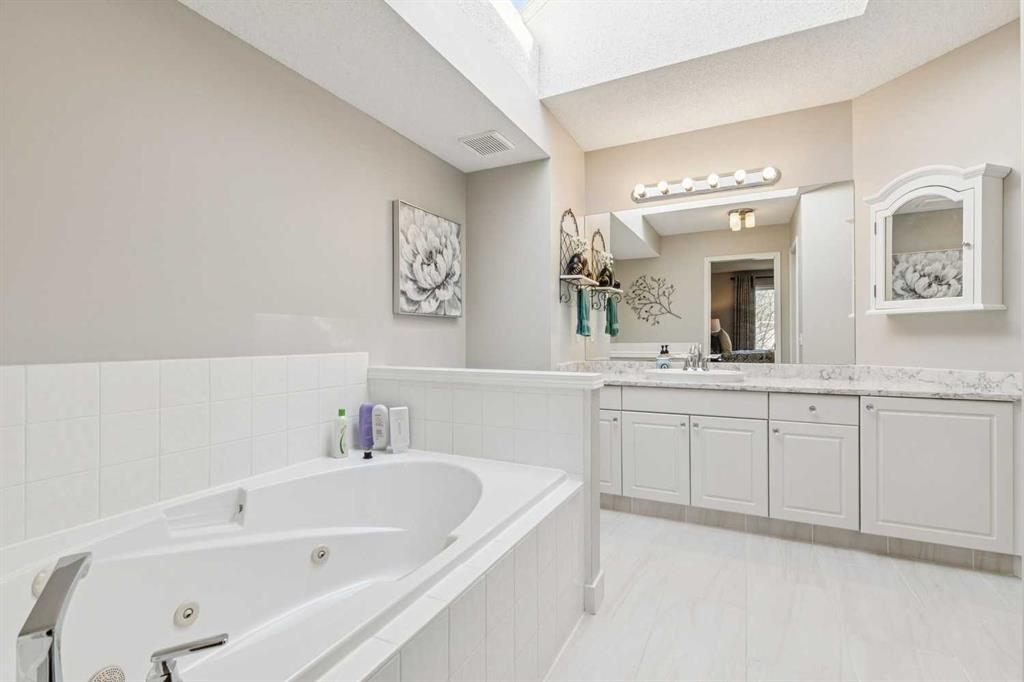 The one you've been waiting for - just 2 blocks from the Lake. Offering over 3000+ SF of refined living space, this one-owner home has been meticulously cared for and thoughtfully updated. The main level showcases a renovated kitchen with ceiling height cabinetry, quartz counter tops, stainless steel appliances and corner pantry. A zen living room complete with gas fireplace & large picture window with views of yard + a spacious dining area for all the family to enjoy! The front flex room ensures a private home office or elevated formal dining room. Sleek 2-piece guest bath, roomy laundry area and gorgeous engineered hardwood flooring underfoot! Upstairs delights with a huge bonus room + vaulted ceilings (engineered hardwood flooring too), a serene primary suite complete with large walk-in closet and spa-like ensuite bath. Enjoy a soaking tub, separate shower, skylight and stunning vanity with smart storage. Two more large family bedrooms (one with built-in study area) and modern family bath. The fully finished basement adds 2 more large bedrooms, family room + bathroom rough-in, ready for your finishing vision. Step outside to your beautifully treed west-facing backyard, offering privacy, glorious mature trees, underground irrigation, gas BBQ hook up - a setting that’s increasingly hard to find. Perfectly positioned near schools, walking paths and one of the BEST lake areas in Calgary, this home delivers space, updates, Central Air and lifestyle—at a price that sets it apart. So many quality improvements including: Hi-eff furnace/Hot water tank/Central Air (2021), Roof with hail resistant shingles (2021), Washer/dryer (2022), Fridge/Microwave Hood Fan (2025), Dishwasher (2021), Bathroom renovated (2021), Kitchen (2012)+ ALL Poly B removed in 2021. Your new home comes with access to the private lake offering year-round amenities: swimming, tennis, pickleball, volleyball, beach, fireworks, fishing, community events and community centre. You don't want to miss this one!!