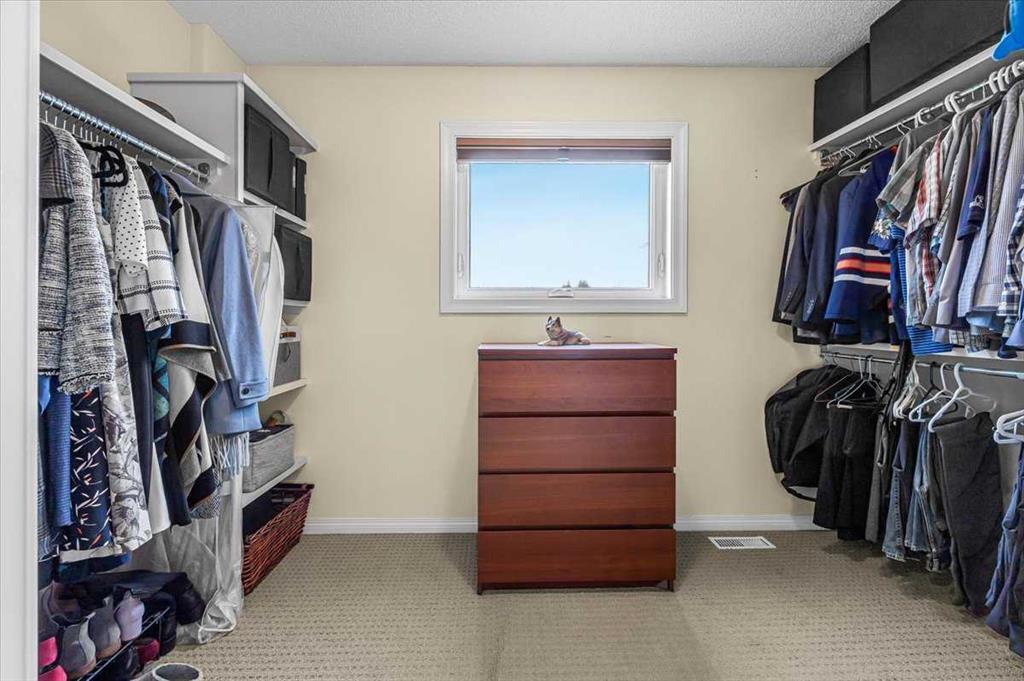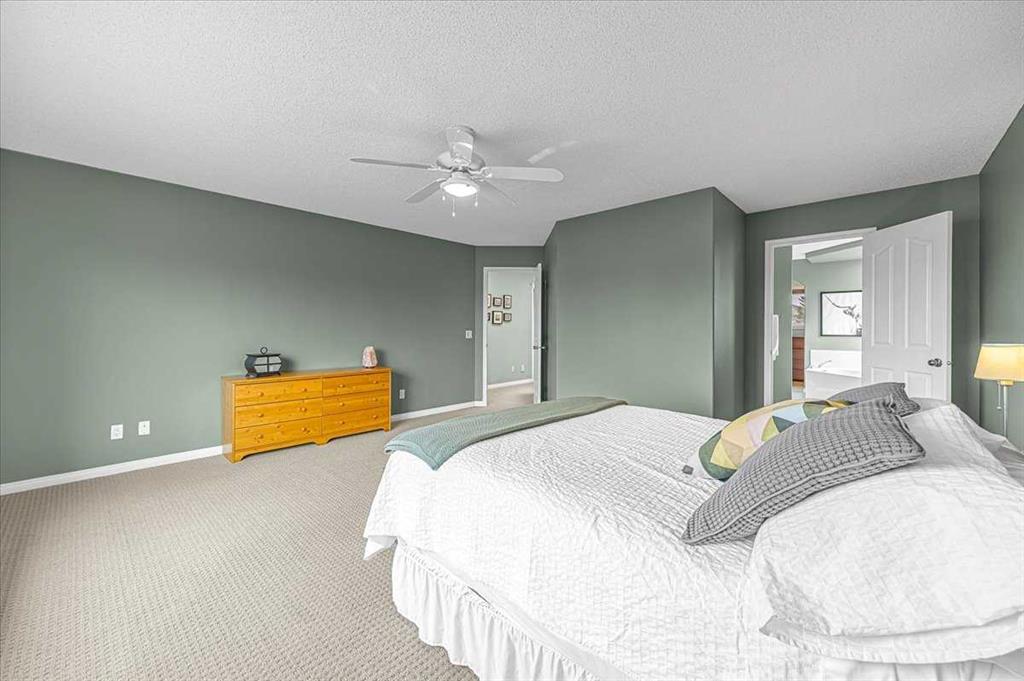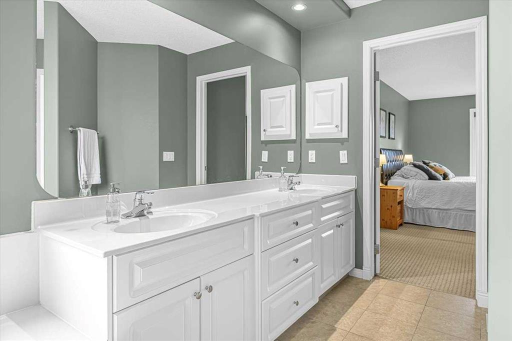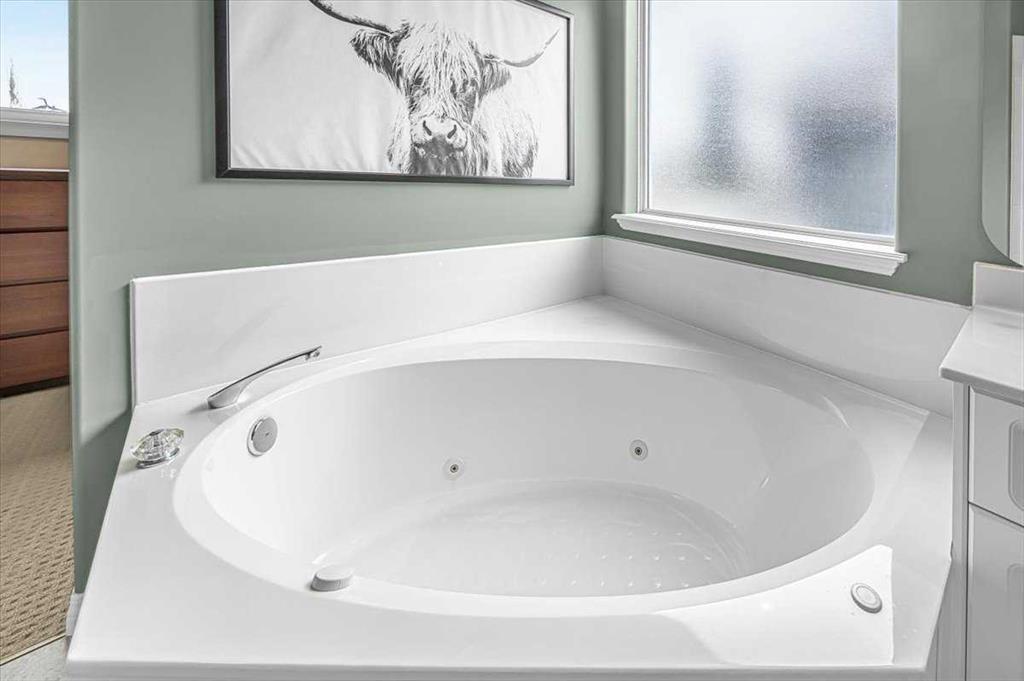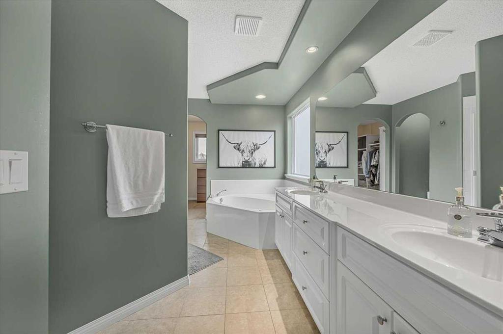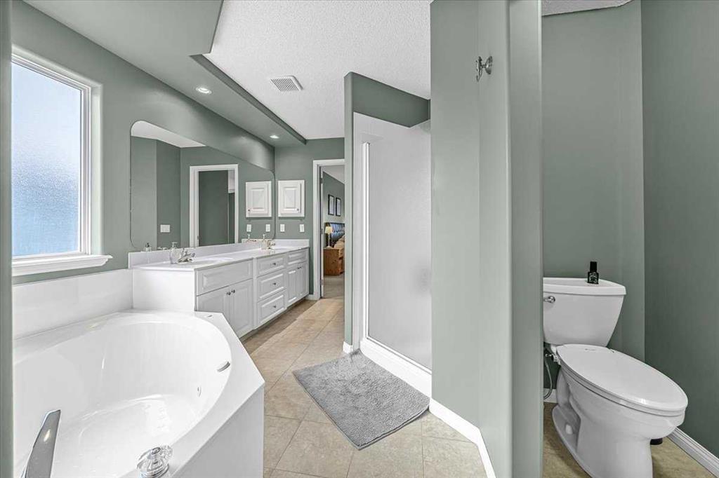 The primary retreat is spacious and inviting, featuring a massive ensuite with double sinks, a jetted tub, separate shower, and a large walk-in closet with a window.