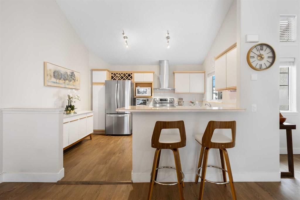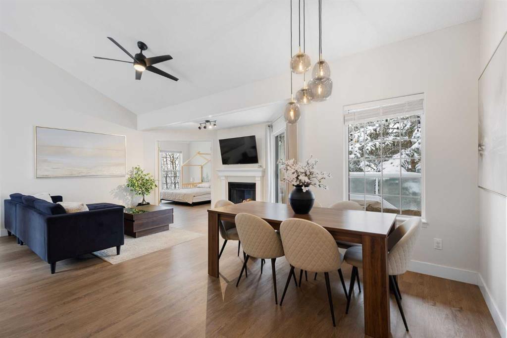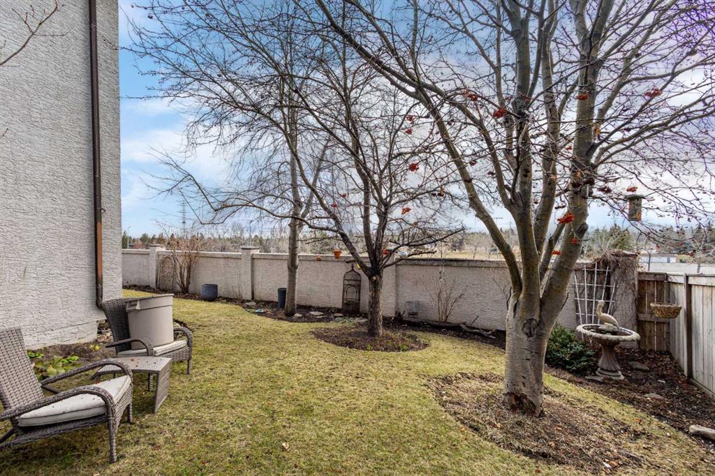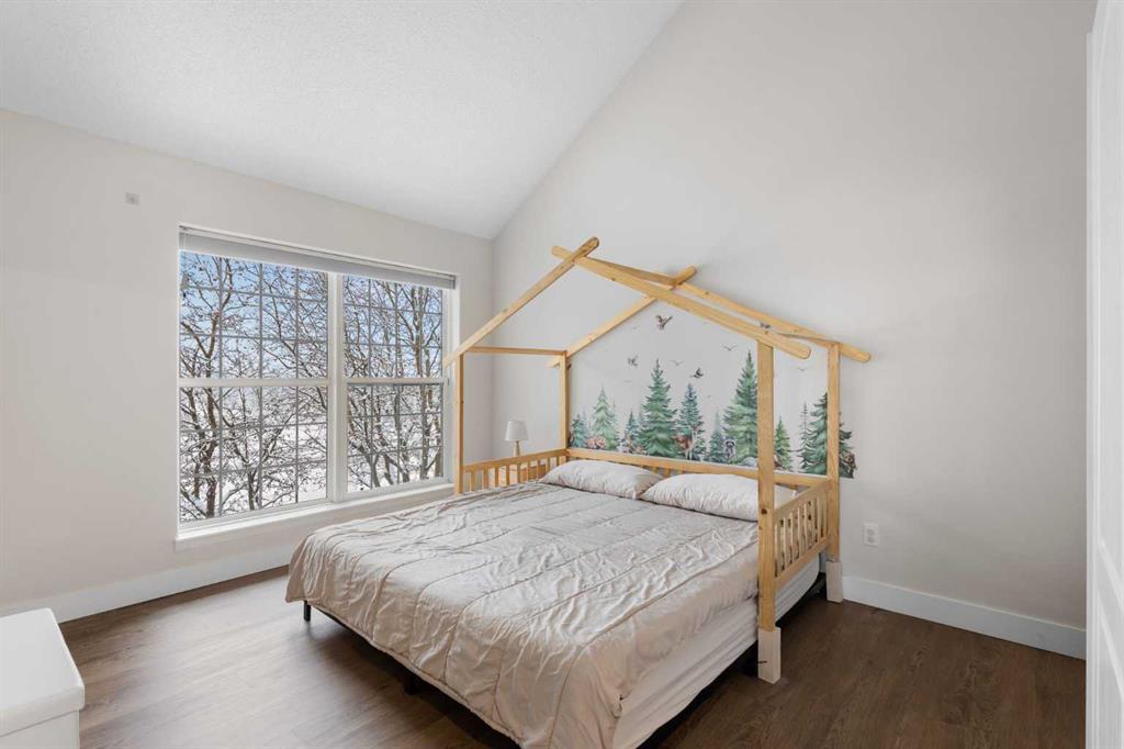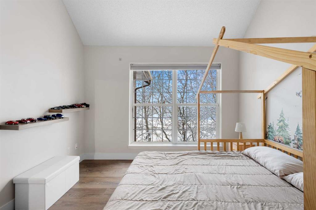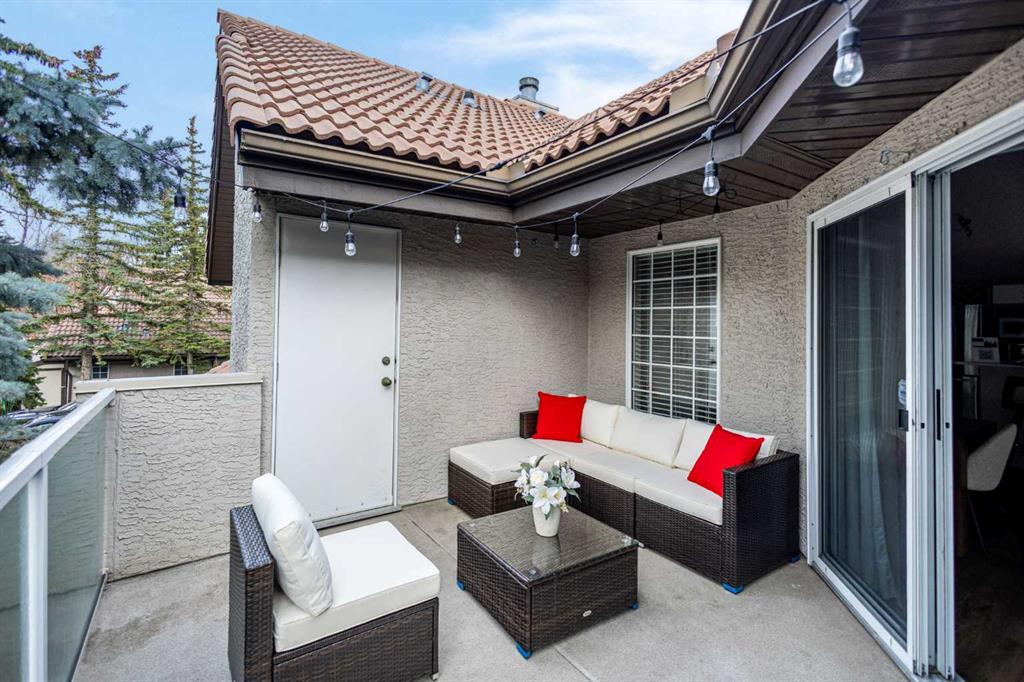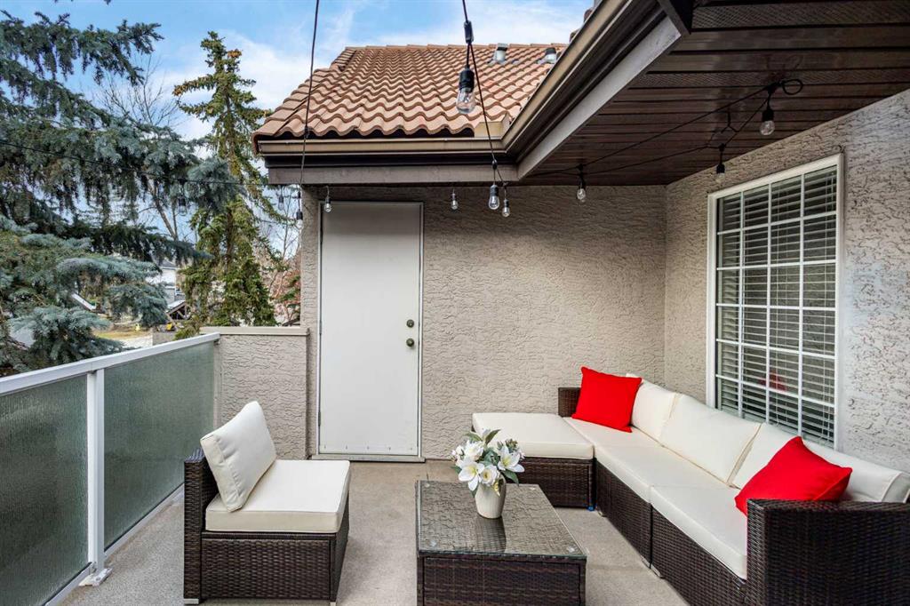 This upper-level stacked townhouse in Signal Hill overlooks Optimistic Park instead of a neighbour's window. That view is one of the reasons the current owners bought it. A wood-burning fireplace anchors the living room, and the whole space opens to a private balcony with a 25 sq ft storage room tucked off to the side.