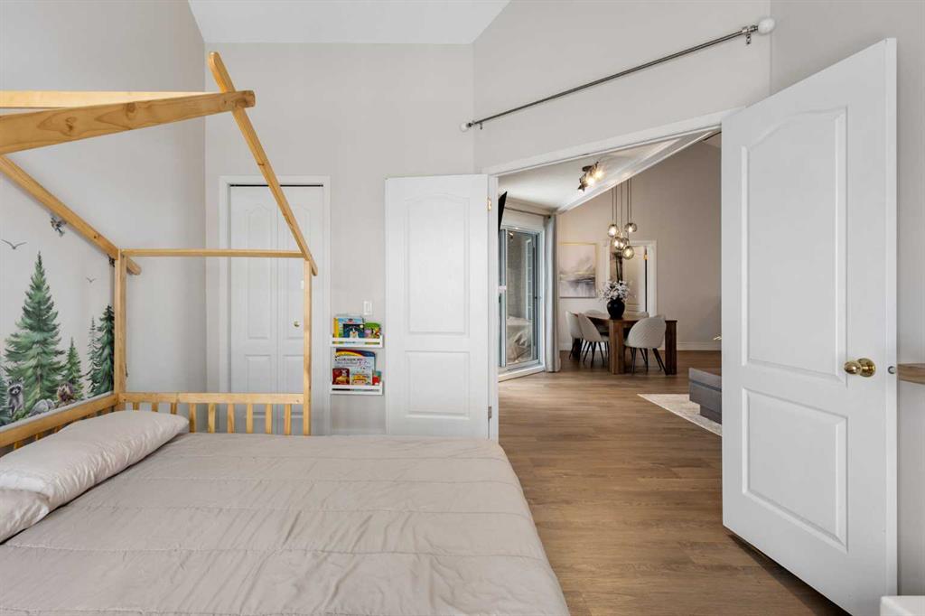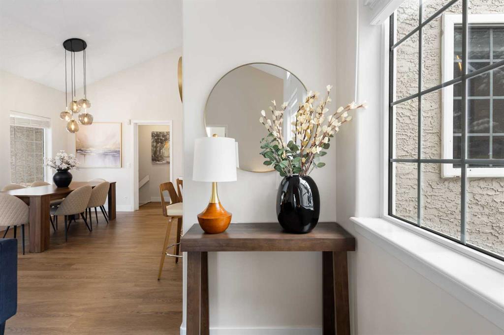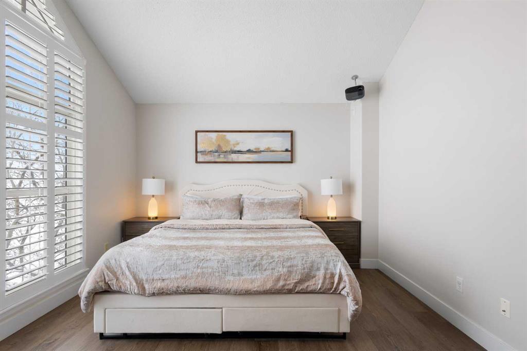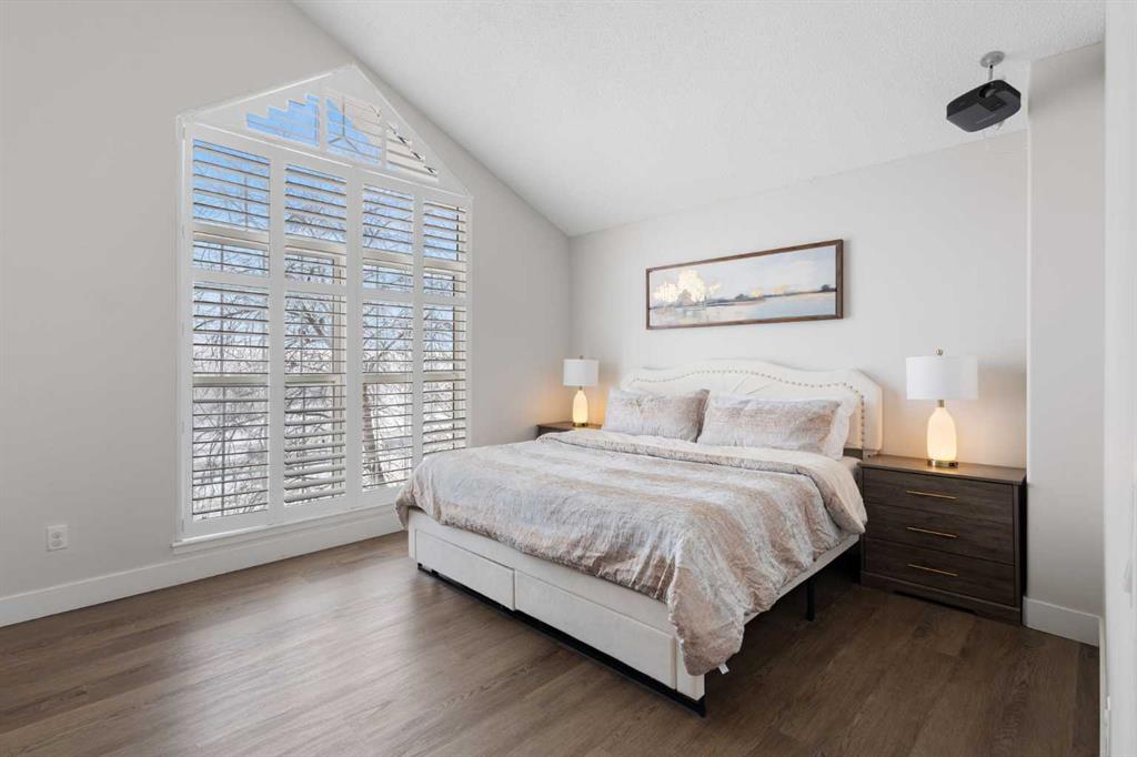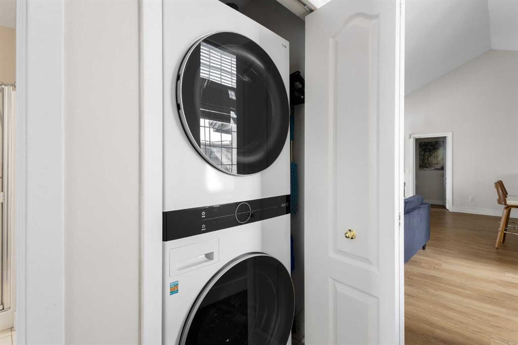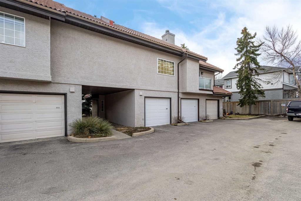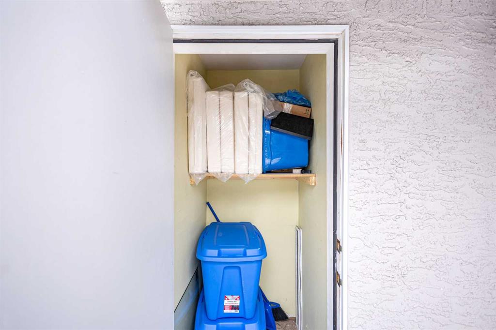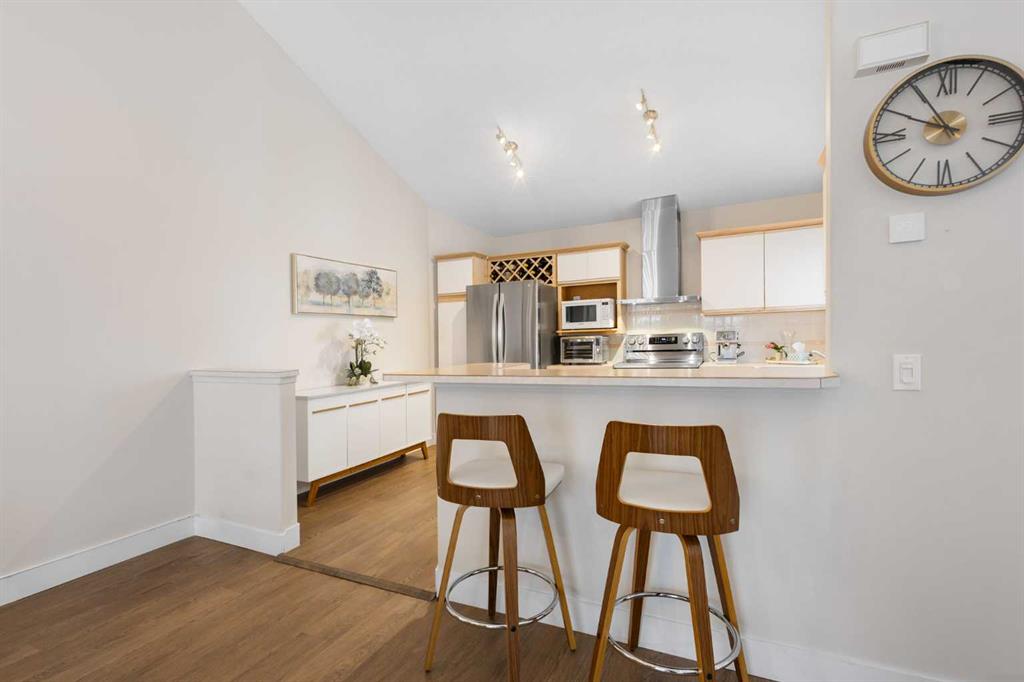 This upper-level stacked townhouse in Signal Hill overlooks Optimistic Park instead of a neighbour's window. That view is one of the reasons the current owners bought it. A wood-burning fireplace anchors the living room, and the whole space opens to a private balcony with a 25 sq ft storage room tucked off to the side.
