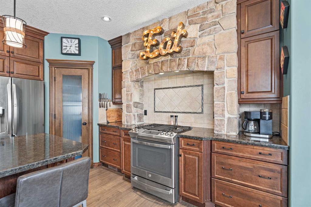beamed ceilings, bookcases, breakfast bar, built-in features, ceiling fan(s), double vanity, granite counters, high ceilings, kitchen island, open floorplan, pantry, recessed lighting, storage, vaulted ceiling(s), vinyl windows, walk-in closet(s), wired for sound