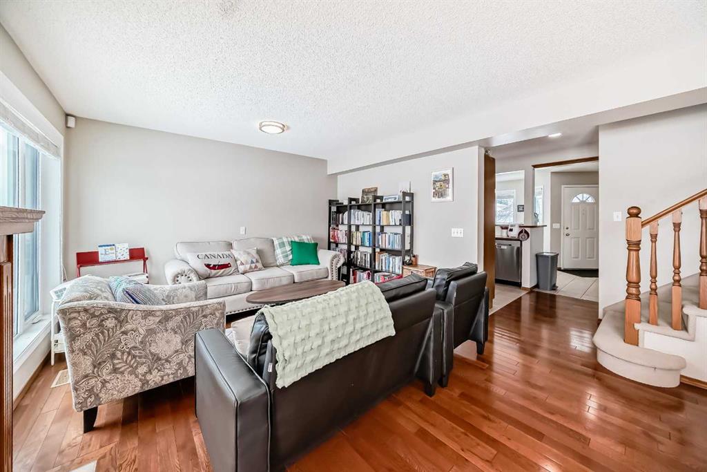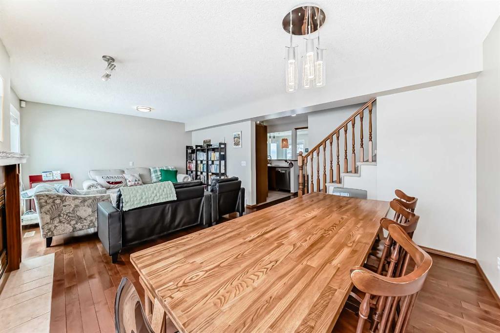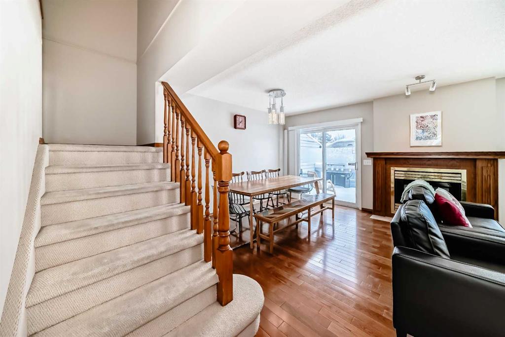 The bright main floor features a welcoming tiled entry and kitchen with maple cabinetry, stainless steel appliances, LED lighting, and a dedicated dining area. The spacious living room is enhanced by rich hardwood flooring and a central gas fireplace, creating a warm and inviting space for everyday living and entertaining.