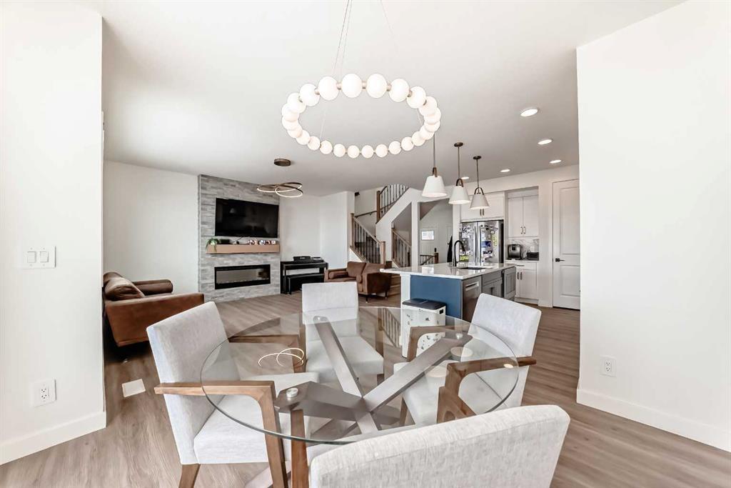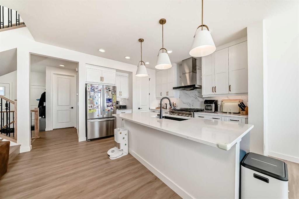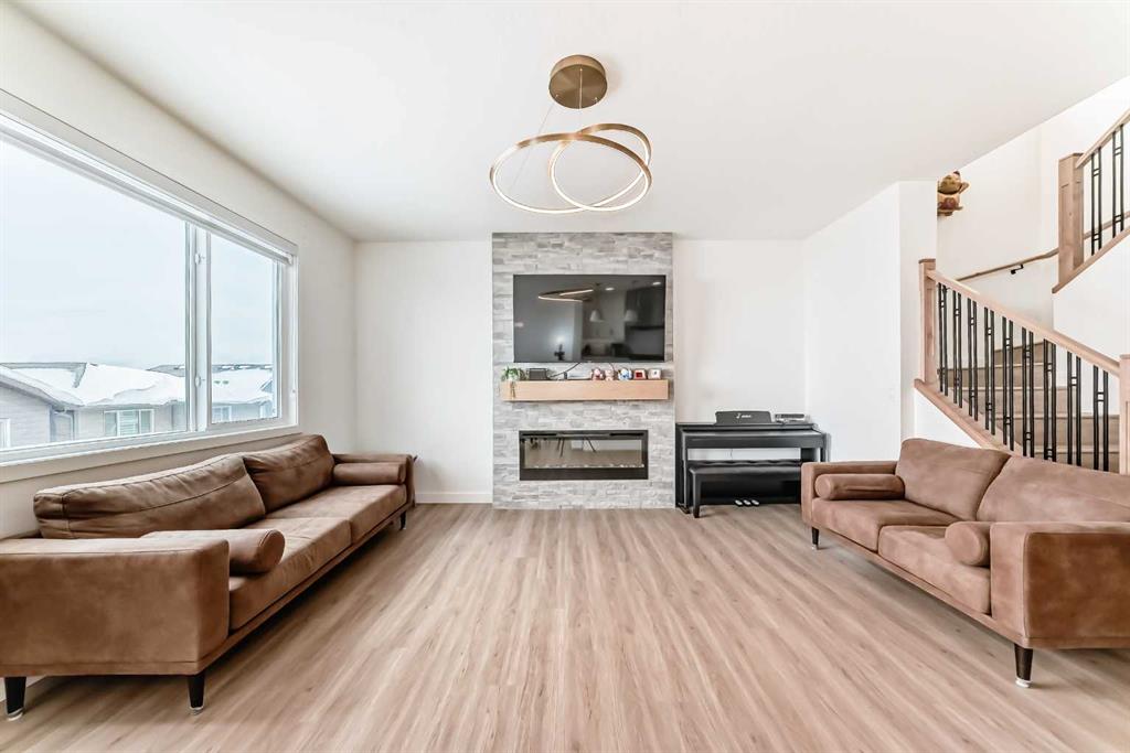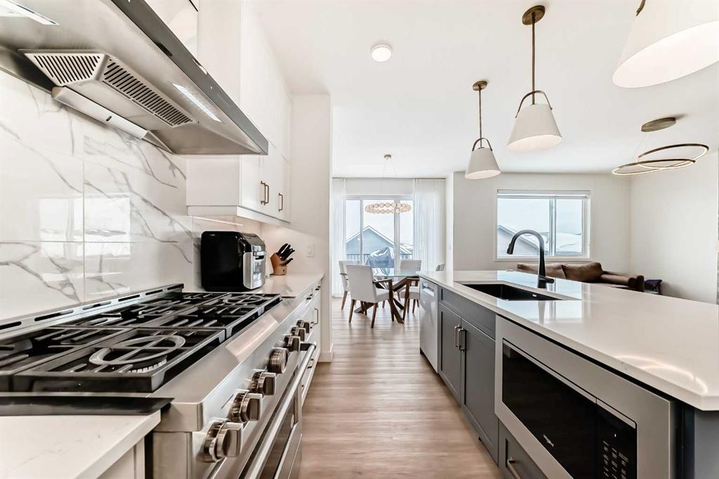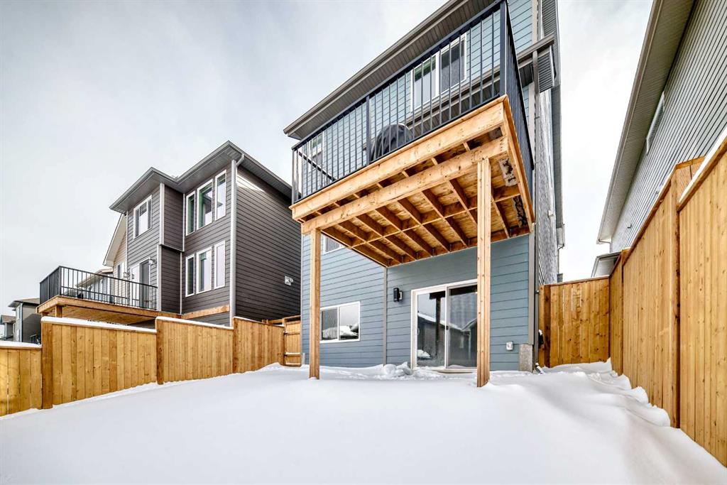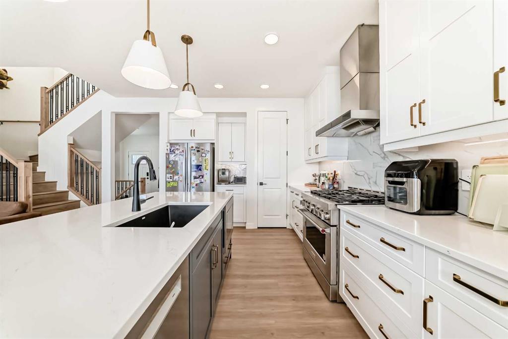 Welcome to this beautifully upgraded walkout home in the highly desirable, family-friendly community of Vermilion Hill in Alpine Park. Offering over 2,100 sq.ft. of thoughtfully designed living space, this home features over $150,000 in upgrades and showcases quality finishes throughout, including full flooring upgrades, upgraded lighting, and full-height lacquered kitchen cabinetry with adjustable LED cabinet lighting. The bright and spacious main level is filled with natural light and features a cozy fireplace, a stunning quartz island with sink and gold accents, high-end stainless steel appliances, a 36" KitchenAid cooktop with 23,000 BTU, a 36" 1300 CFM hood fan, Bosch 800 Series dishwasher, and a 3-piece bathroom. The dining and living area opens to a large rear deck, perfect for entertaining or relaxing outdoors. Upstairs, including the generous bonus room, convenient laundry, two additional good-sized bedrooms, a full 5-piece bathroom, and a spacious primary retreat with a luxurious 5-piece ensuite, and beautiful views of downtown and the Rocky Mountains. The 9-ft walkout basement offers excellent future potential. Additional features include a whole-home water softener and fully completed landscaping with concrete walkway and patio. Conveniently located close to schools, shopping, transit, and amenities, this exceptional home is one you do not want to miss.