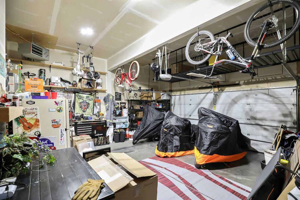 The oversized attached garage is heated and features extra-high ceilings with built-in storage racks, offering excellent functionality and additional space for organization.