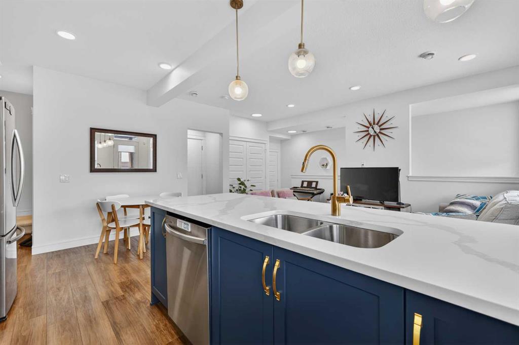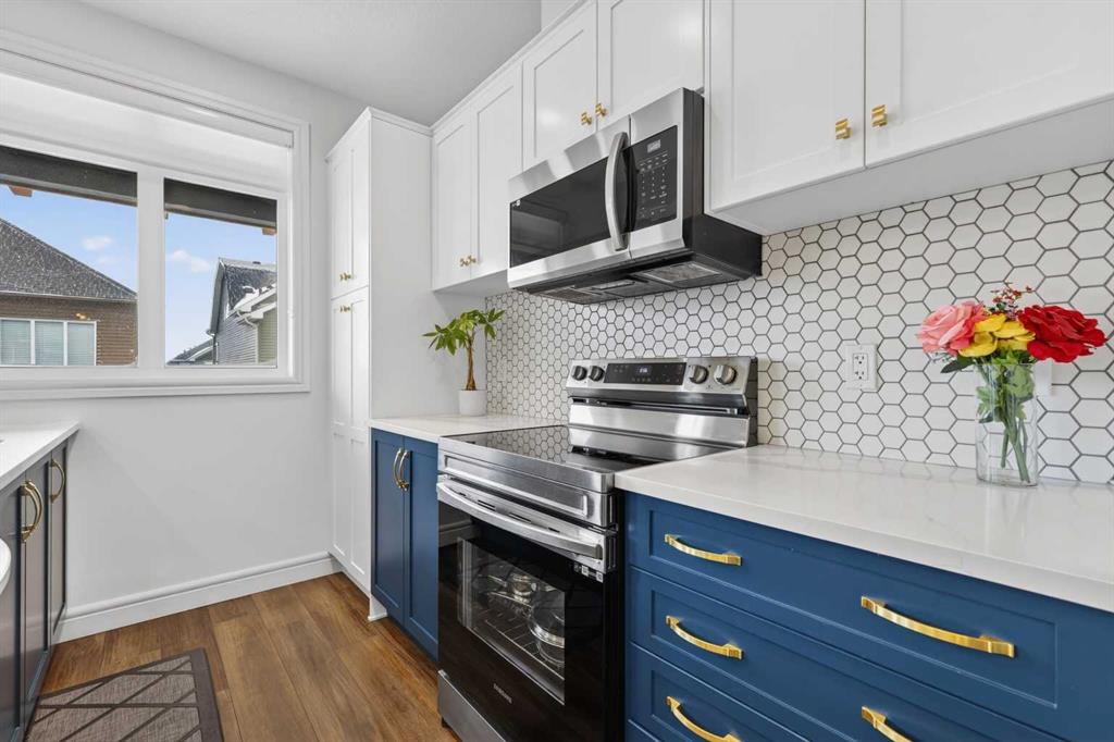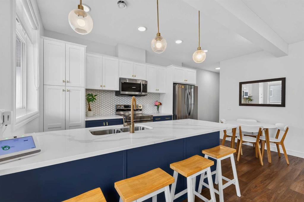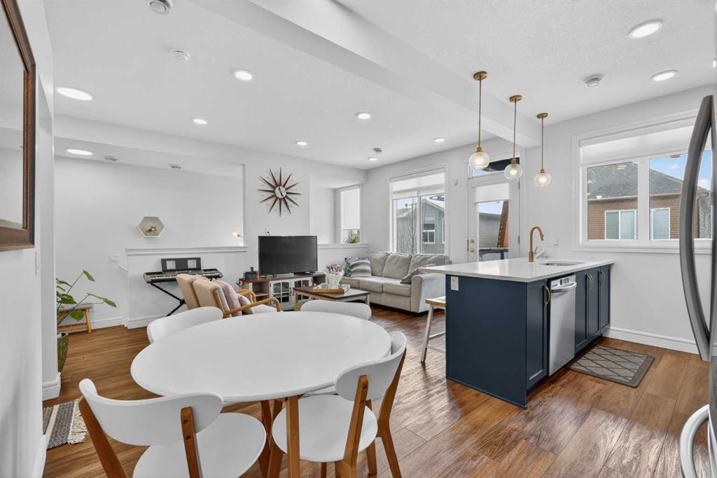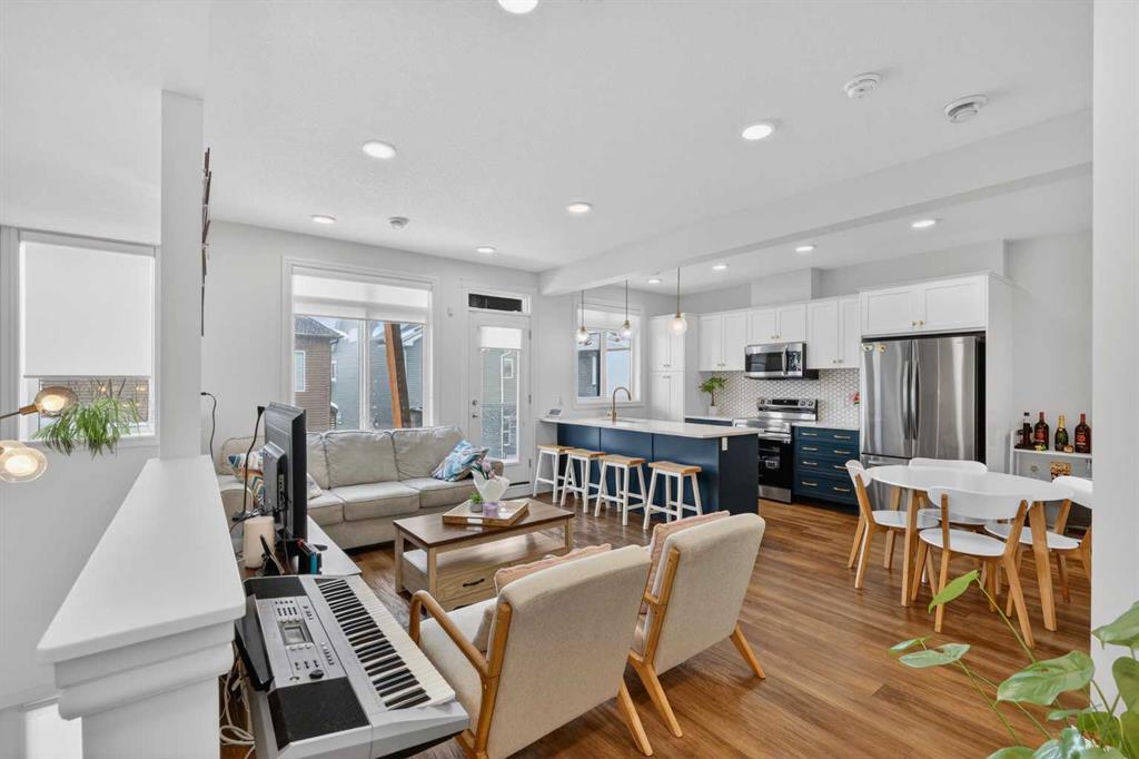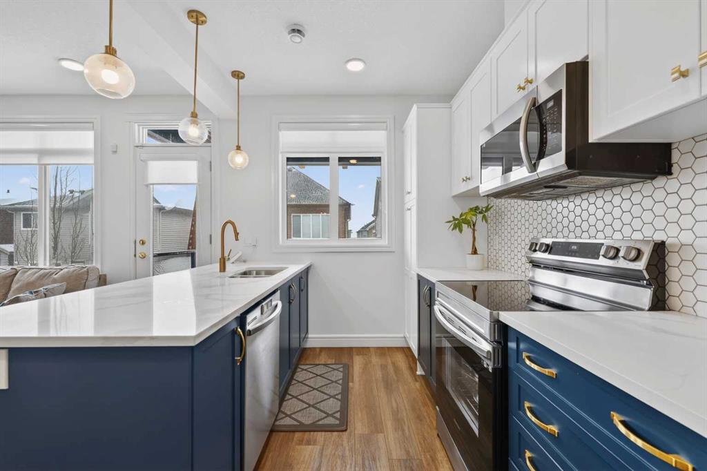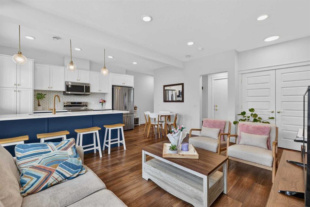 QUICK POSSESSION | THREE BEDROOMS | INDOOR PARKING – TWO BALCONIES This trendy and spacious three-storey townhome in the desirable community of Savanna offers outstanding value, a stylish modern design, and a convenient location close to transit, shopping, schools, walking paths, green spaces, dog parks, Metis Trail, Airport, and so much more. Designed for both comfort and functionality, this home is ideal for professionals, families, or investors looking for low-maintenance living in a vibrant urban setting. The entry-level welcomes you with a front foyer and important security with privacy. The upper main level features an open-concept living space with luxury vinyl plank flooring and abundant natural light, creating a warm and inviting atmosphere. The spacious living room flows seamlessly into the well-appointed kitchen and dining area, making this home perfect for relaxing evenings or entertaining guests. The kitchen is a true standout, featuring white with blue accent shaker-style cabinetry, quartz countertops, a stunning tile backsplash, upgraded stainless steel appliances, and a dramatic peninsula island with a flush eating bar and undermount sink. Just off the front living area, a sizeable east-facing balcony offers the ideal space for outdoor enjoyment with a covered area and peaceful prairie views. Upstairs, the home continues to impress with three generously sized bedrooms. The primary bedroom offers a private en-suite and oversized closet. The upper floor also features a laundry closet with a stacked washer and dryer. The main primary suite is thoughtfully designed and includes an upper east-facing balcony. This beautiful home combines contemporary aesthetics with everyday practicality, showcasing a modern décor palette, smart layout, and quality finishings throughout. With low-maintenance living, low condo fees of $208, thoughtful upgrades, and unbeatable convenience, this property offers a fantastic opportunity to move into a vibrant and growing community. Savanna is more than a neighbourhood—it’s a lifestyle. Live healthy and connected in a thriving, walkable community where you’re minutes from medical, green spaces, transit, and the upcoming LRT AIRPORT extension. Whether you're commuting, working remotely, or enjoying your downtime, Savanna offers it all. A spring 2026 possession date is available—don’t miss your chance to make this stylish townhome your own. Contact your friendly REALTOR® today to arrange your private showing and experience all that this home has to offer!