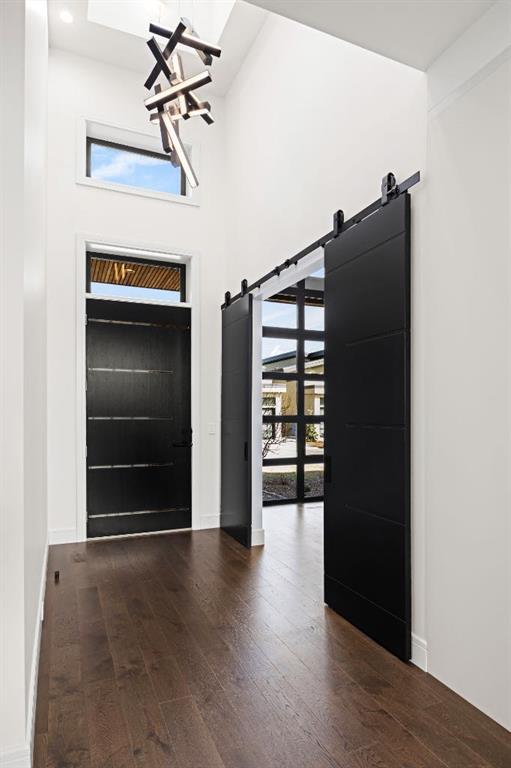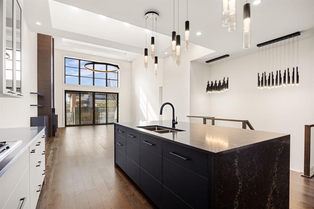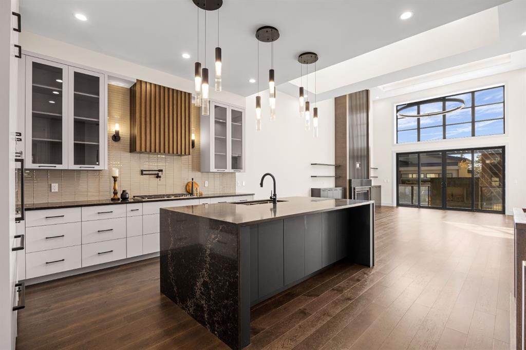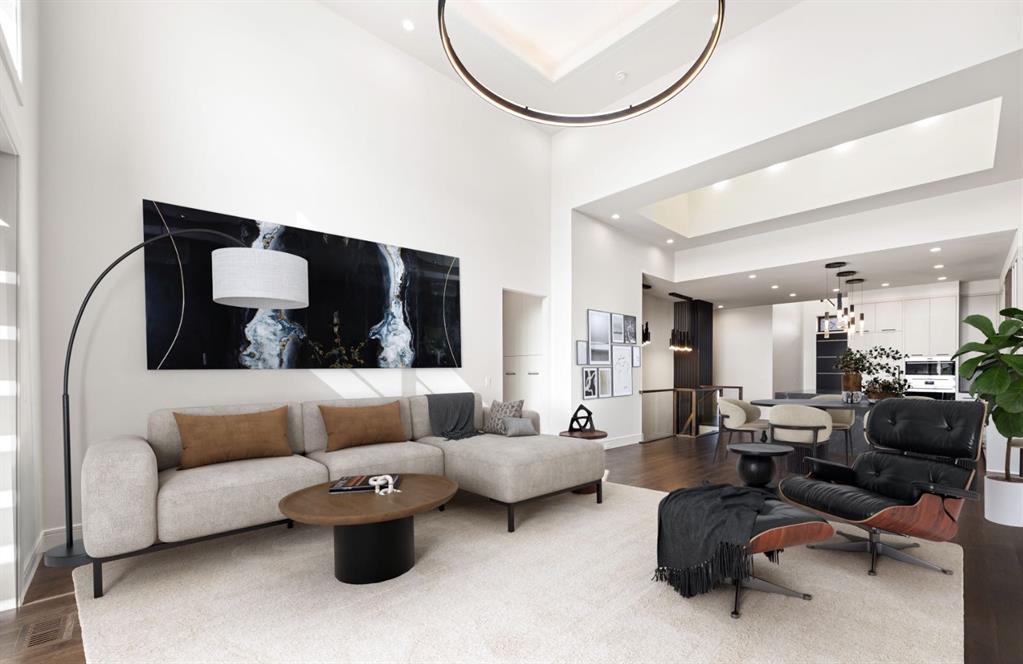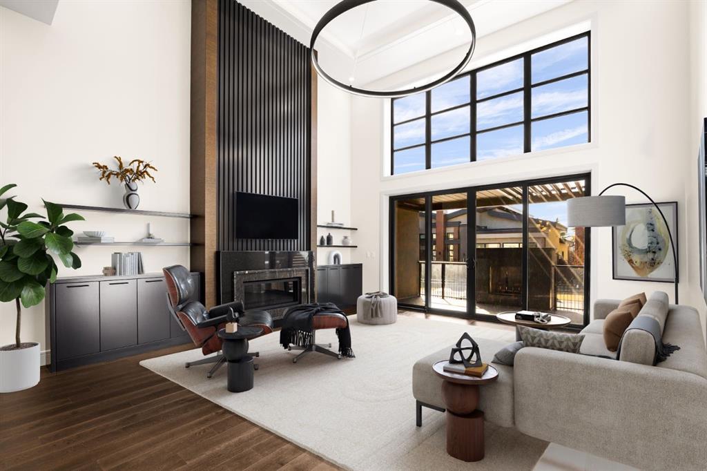 The interior is a masterclass in modern elegance, defined by a high-contrast palette where dark elements meet crisp gallery walls and gleaming floors. The open-concept main level features soaring ceilings, multiple skylights, and expansive windows that flood the space with natural light. A custom fireplace surround reaching the 16’ ceilings anchors the great room creating a chic focal point in the home, while large doors transition seamlessly to a west-facing patio. This outdoor oasis extends the living space and is elevated by a built-in gas fireplace and a remote-controlled louvred pergola, allowing customized sun exposure or protection from the elements while entertaining.