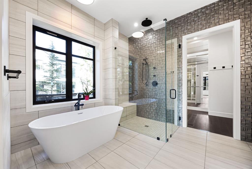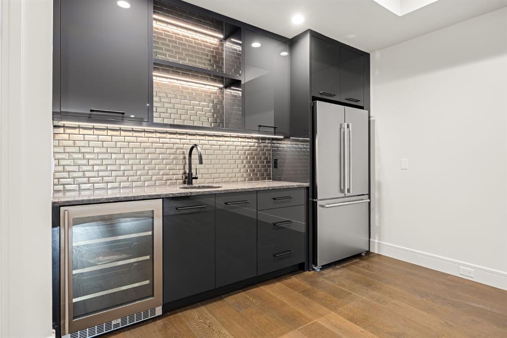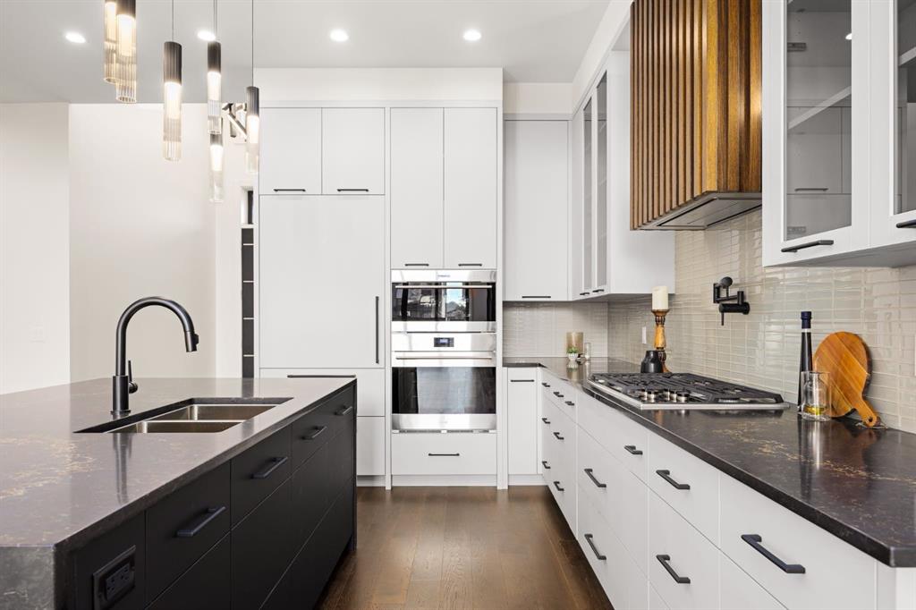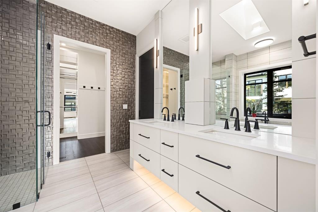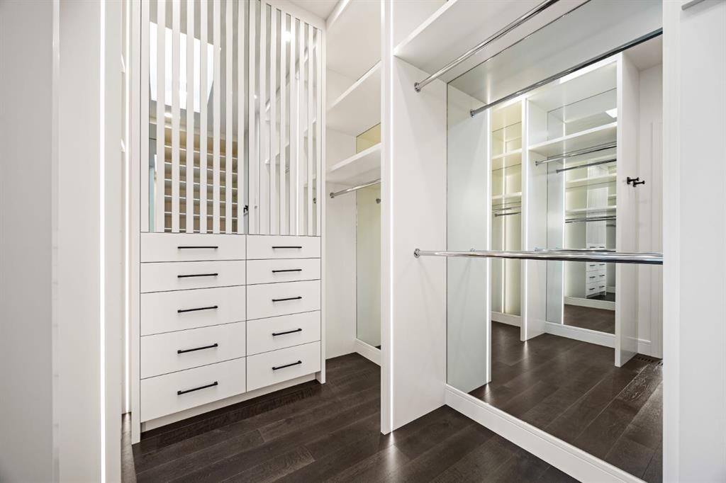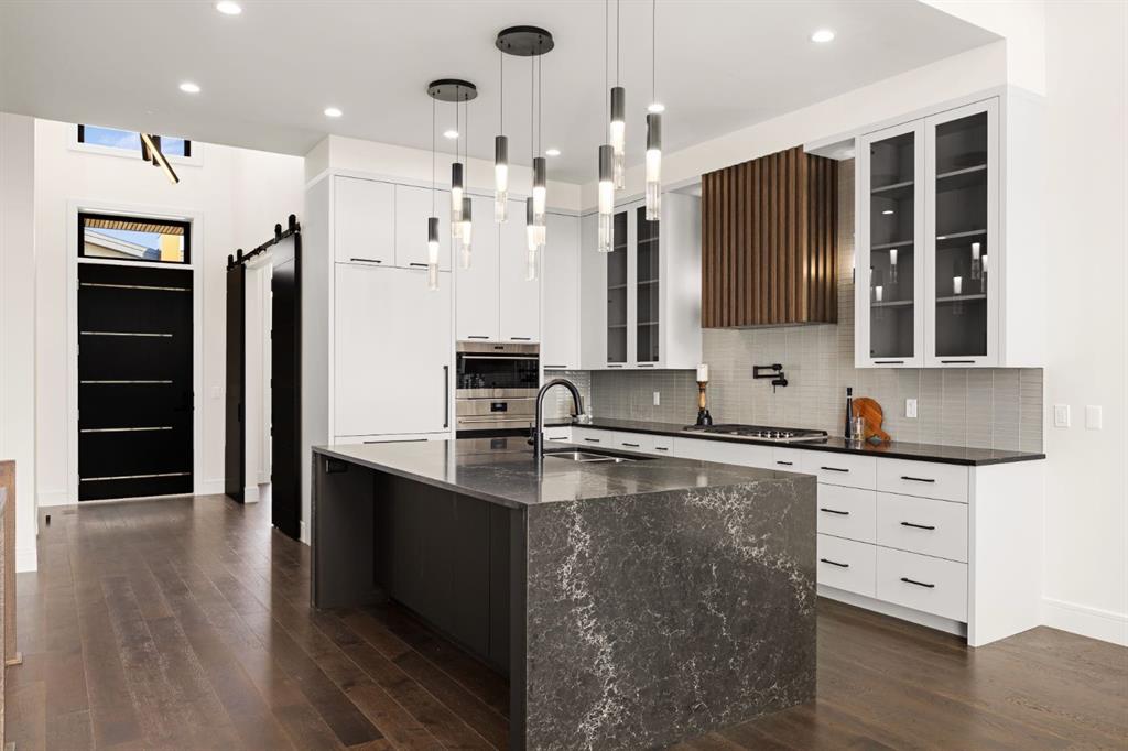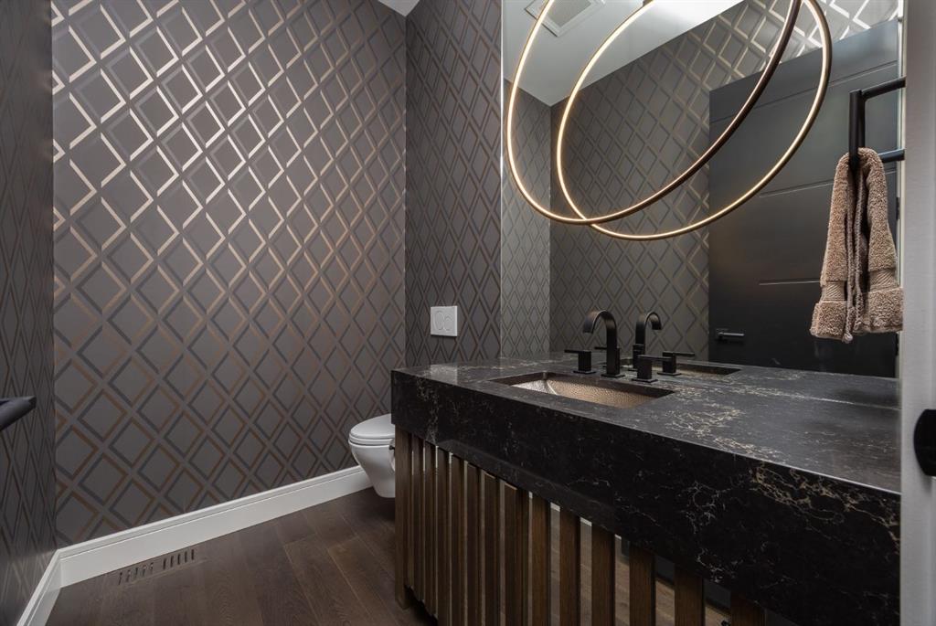 The kitchen is a flawless blend of style and utility, featuring premium, integrated Wolf and Sub-Zero appliances, custom cabinetry, plenty of counter space and a commanding island wrapped in deep, inky quartz that provides a sophisticated contrast to the light cabinetry. The main floor continues to impress with a primary suite that serves as a true sanctuary, boasting a walk-in dressing room and a spa-inspired ensuite with in-floor heat, dual vanities, a sizeable shower and a freestanding soaker tub. A private den with sleek barn door access, a mood-filled powder room featuring bold designer wallpaper and a statement pendant light, and a well-appointed laundry room complete the main level, ensuring all your daily essentials are accessible on one floor.