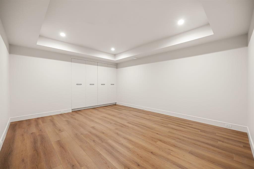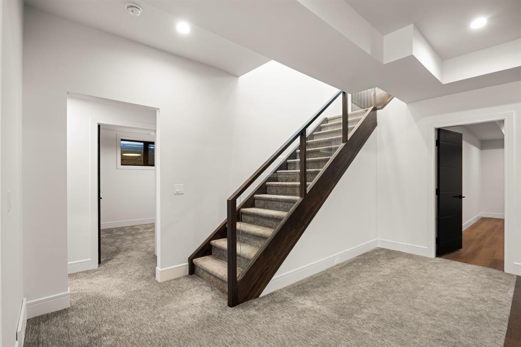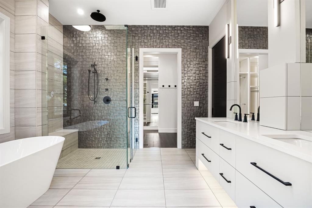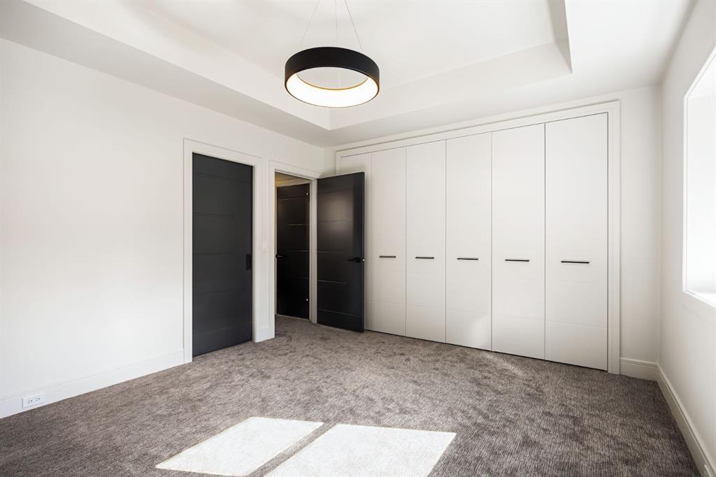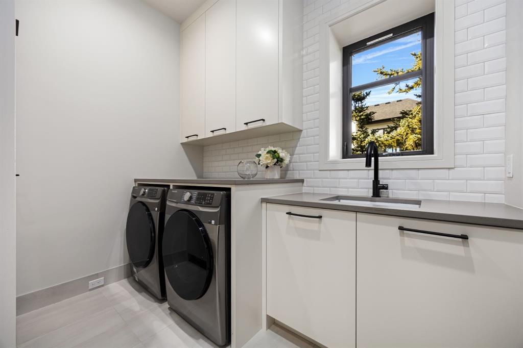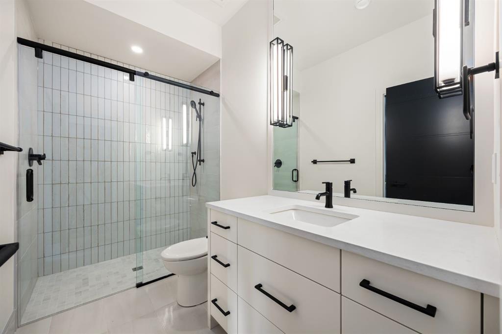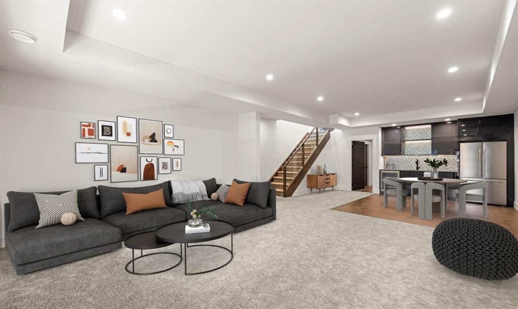The kitchen is a flawless blend of style and utility, featuring premium, integrated Wolf and Sub-Zero appliances, custom cabinetry, plenty of counter space and a commanding island wrapped in deep, inky quartz that provides a sophisticated contrast to the light cabinetry. The main floor continues to impress with a primary suite that serves as a true sanctuary, boasting a walk-in dressing room and a spa-inspired ensuite with in-floor heat, dual vanities, a sizeable shower and a freestanding soaker tub. A private den with sleek barn door access, a mood-filled powder room featuring bold designer wallpaper and a statement pendant light, and a well-appointed laundry room complete the main level, ensuring all your daily essentials are accessible on one floor.